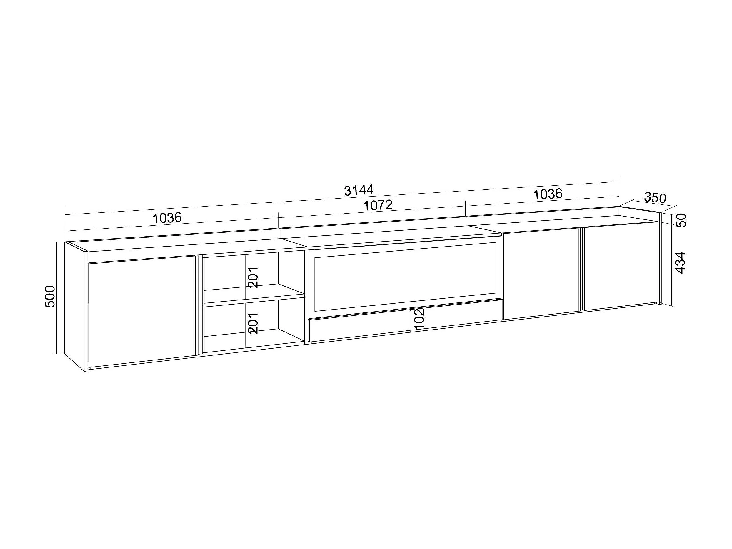 TV-Meubel, Lowboard, 315x50x35 cm, Voor tv's tot 80", Elektrische haard XXL, Hangend, LED, Donkere eik en Zwart
