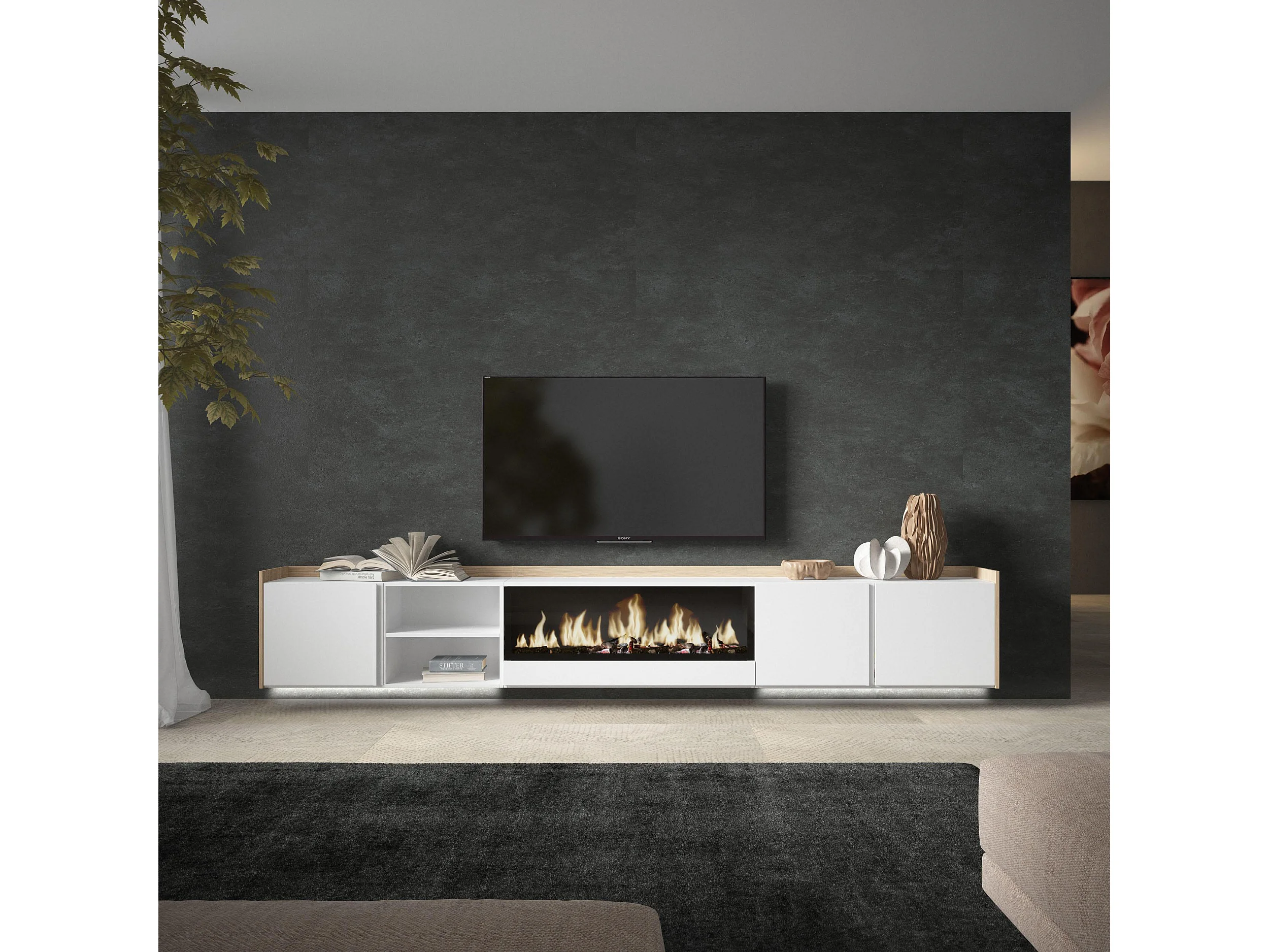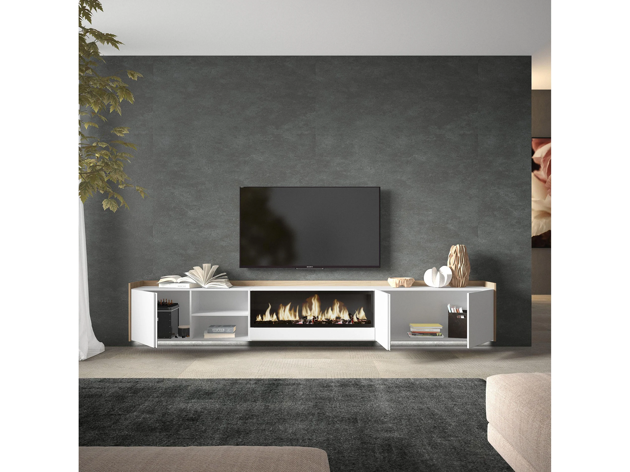 TV-Meubel, Lowboard, 315x50x35 cm, Voor tv's tot 80", Elektrische haard XXL, Hangend, LED, Wit en Eiken soft