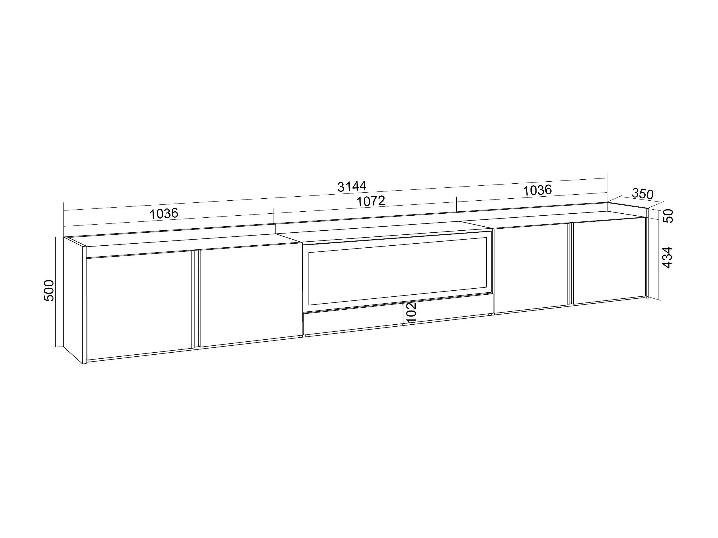 TV-Meubel, Lowboard, 315x50x35 cm, Voor tv's tot 80", Elektrische haard XXL, Hangend, Zwart/Eiken