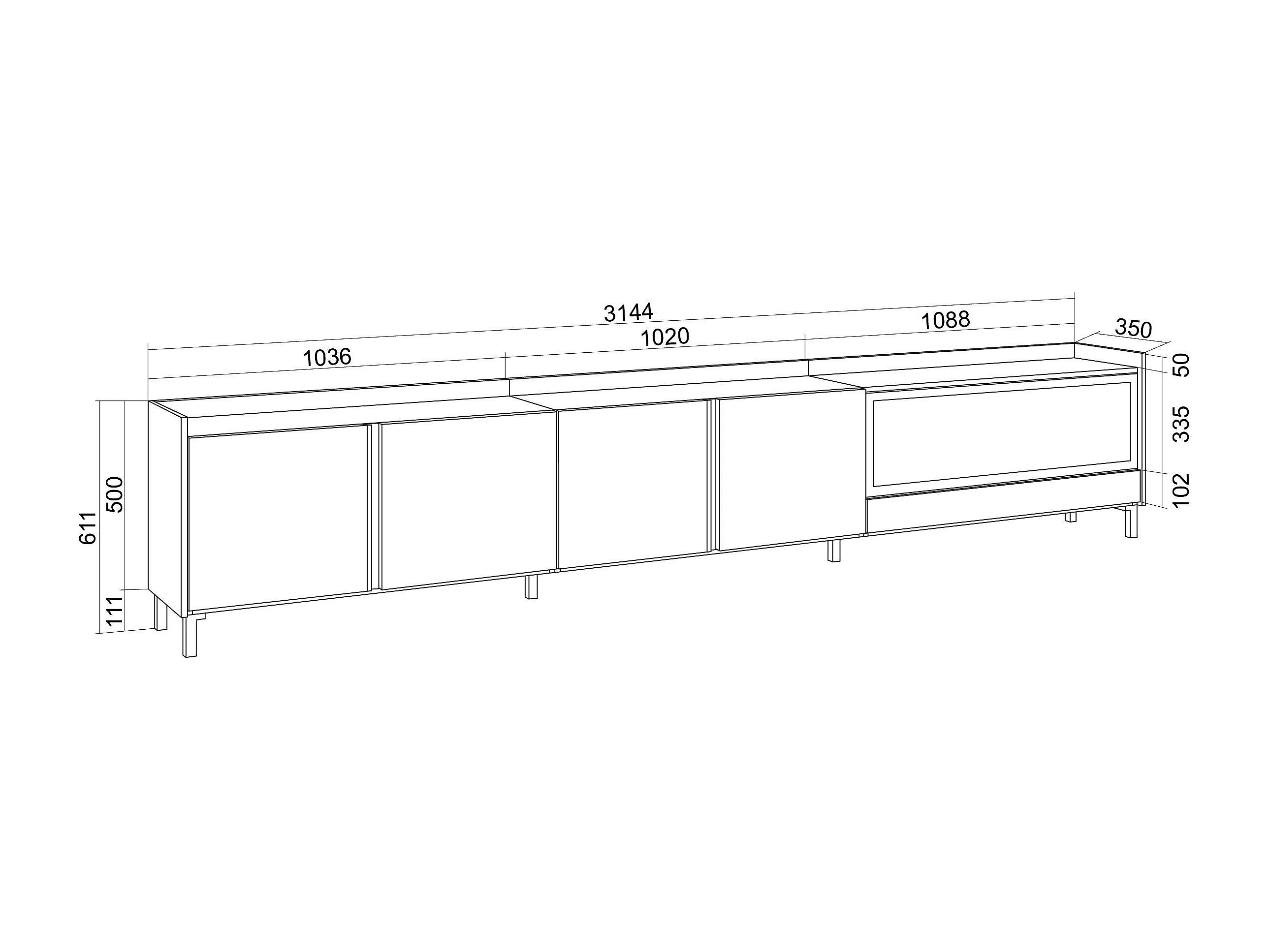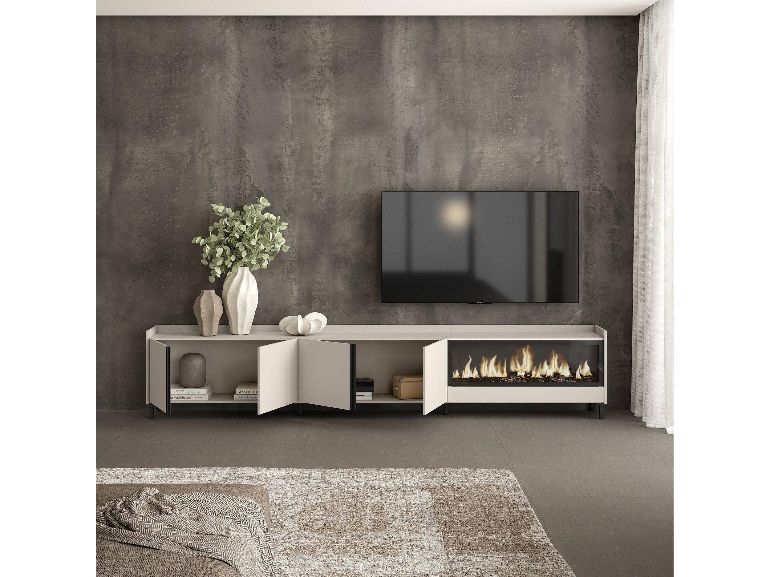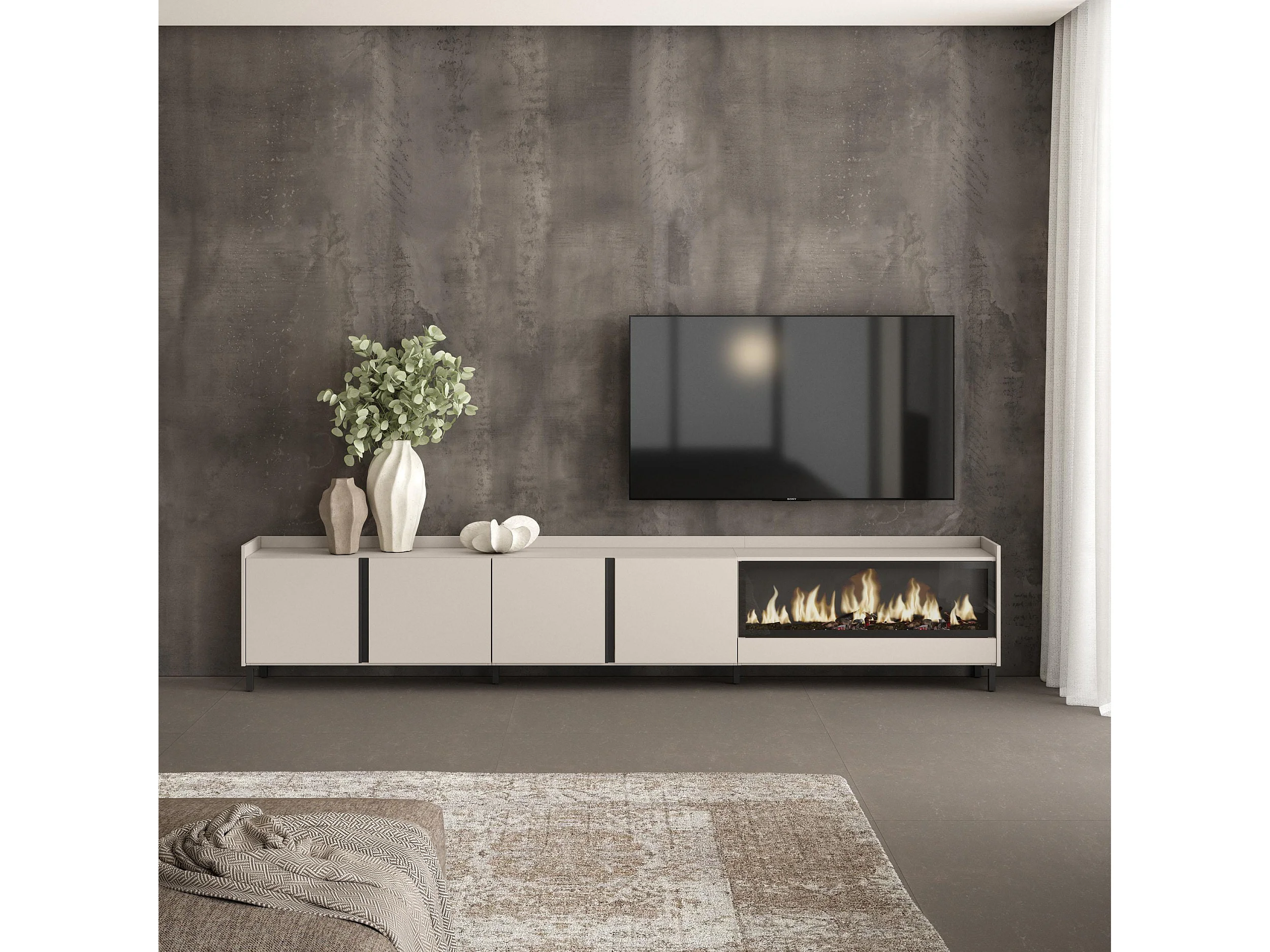 TV-Meubel, Lowboard, 315x61x35 cm, Voor tv's tot 80", Elektrische haard XXL, Industrieel design, Beige