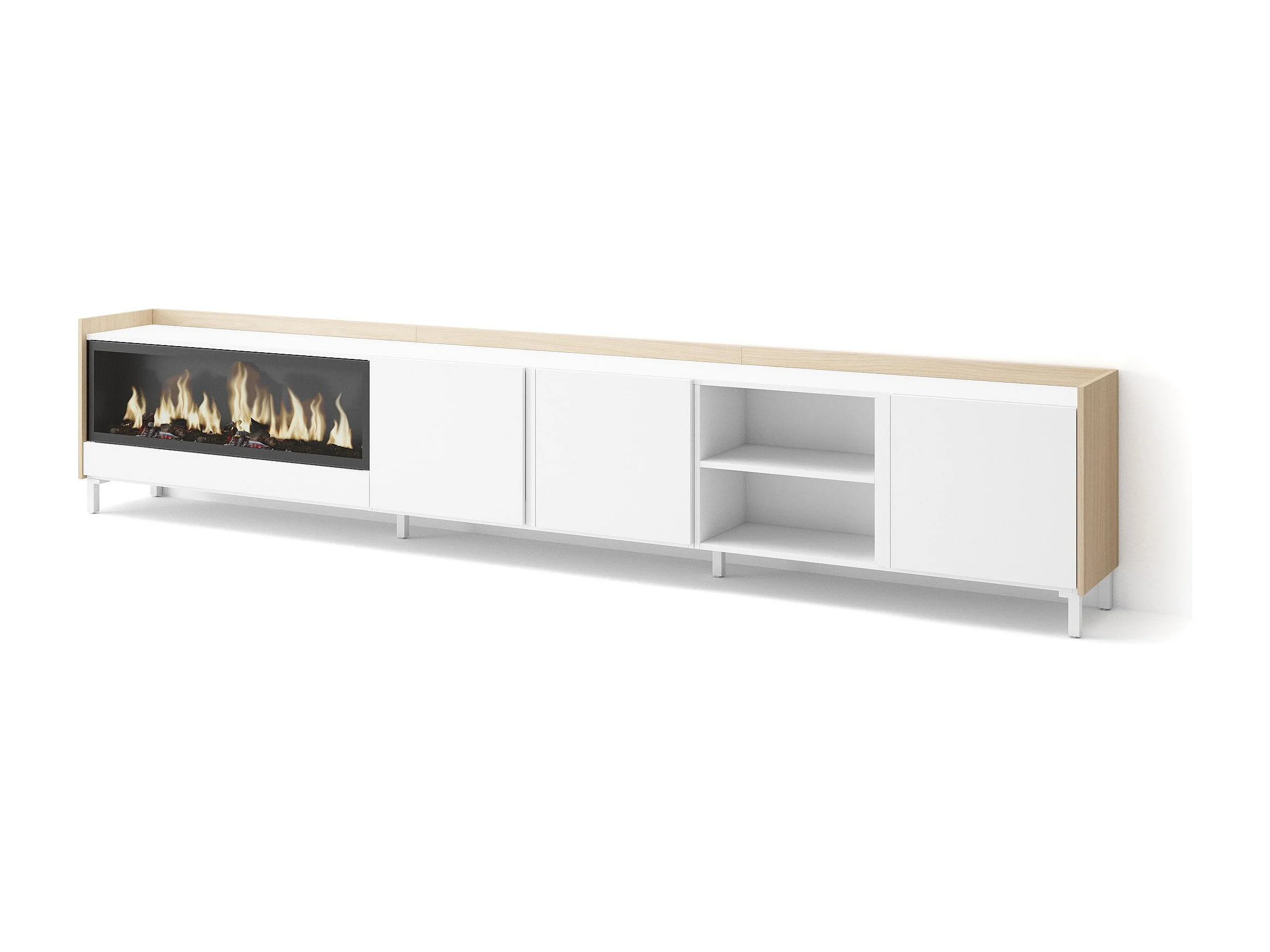 TV-Meubel, Lowboard, 315x61x35 cm, Voor tv's tot 80", Elektrische haard XXL, Industrieel design, Wit en Eiken soft