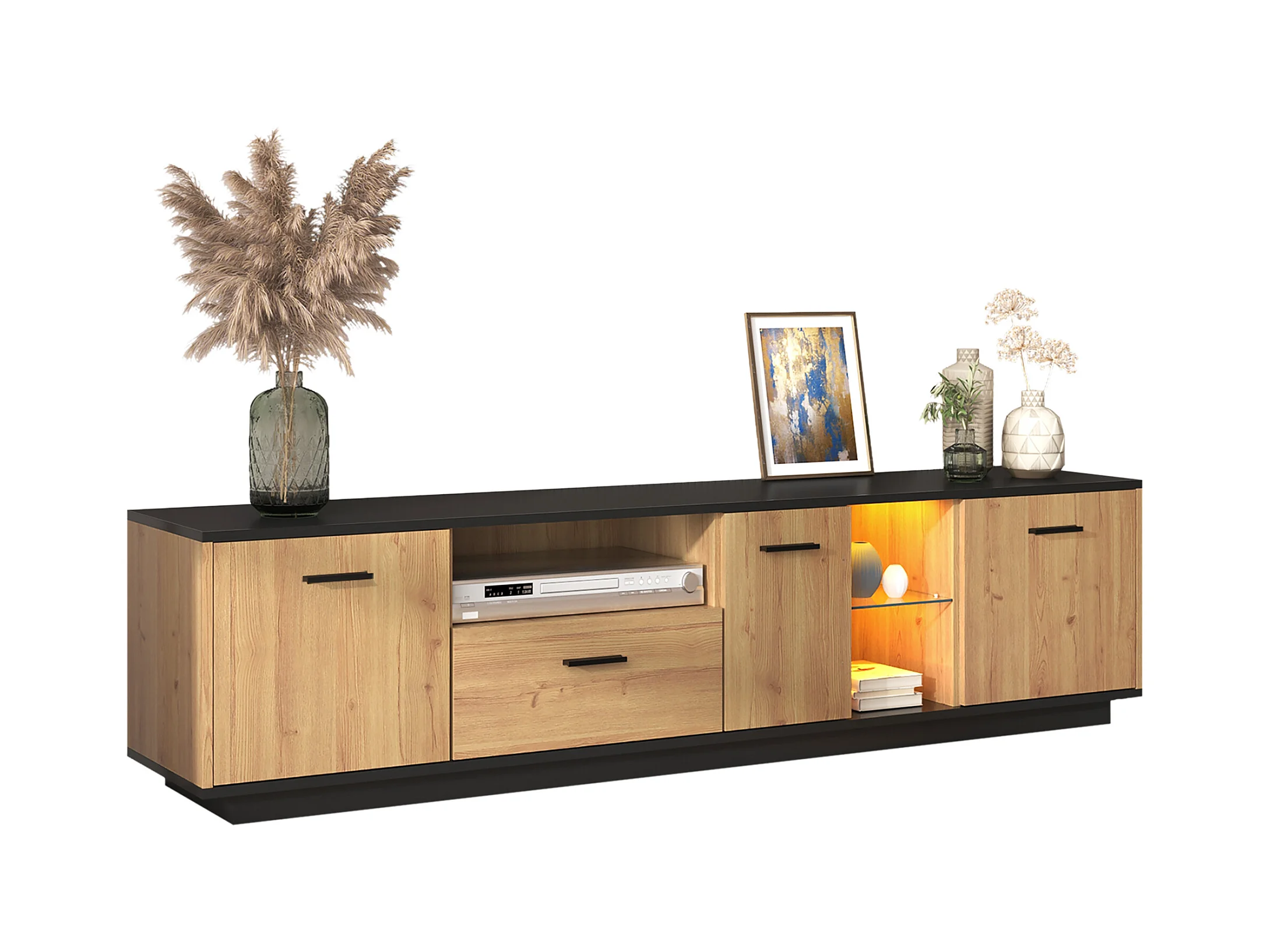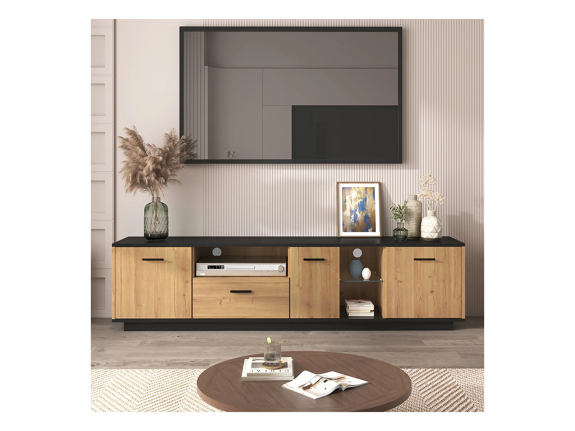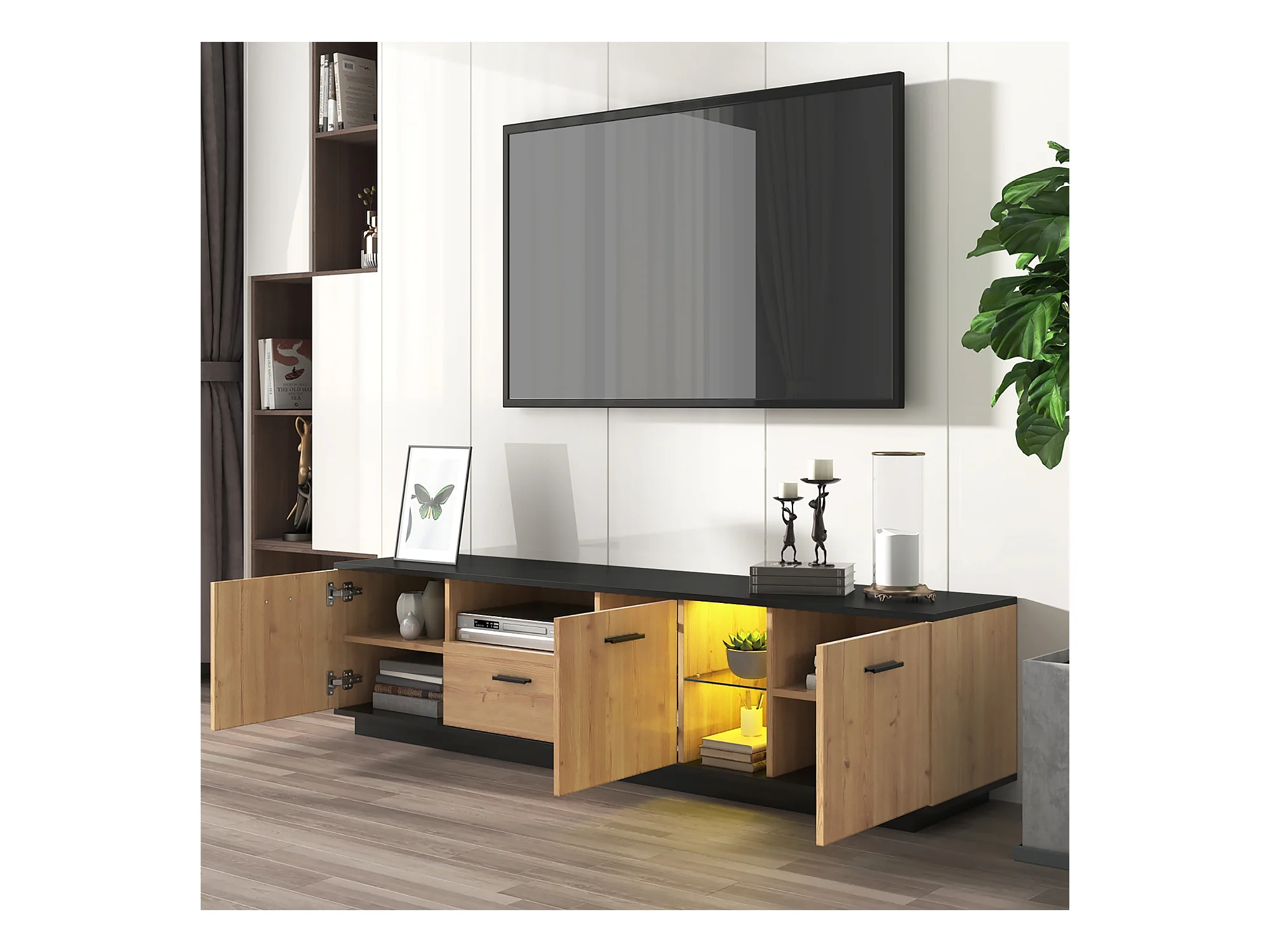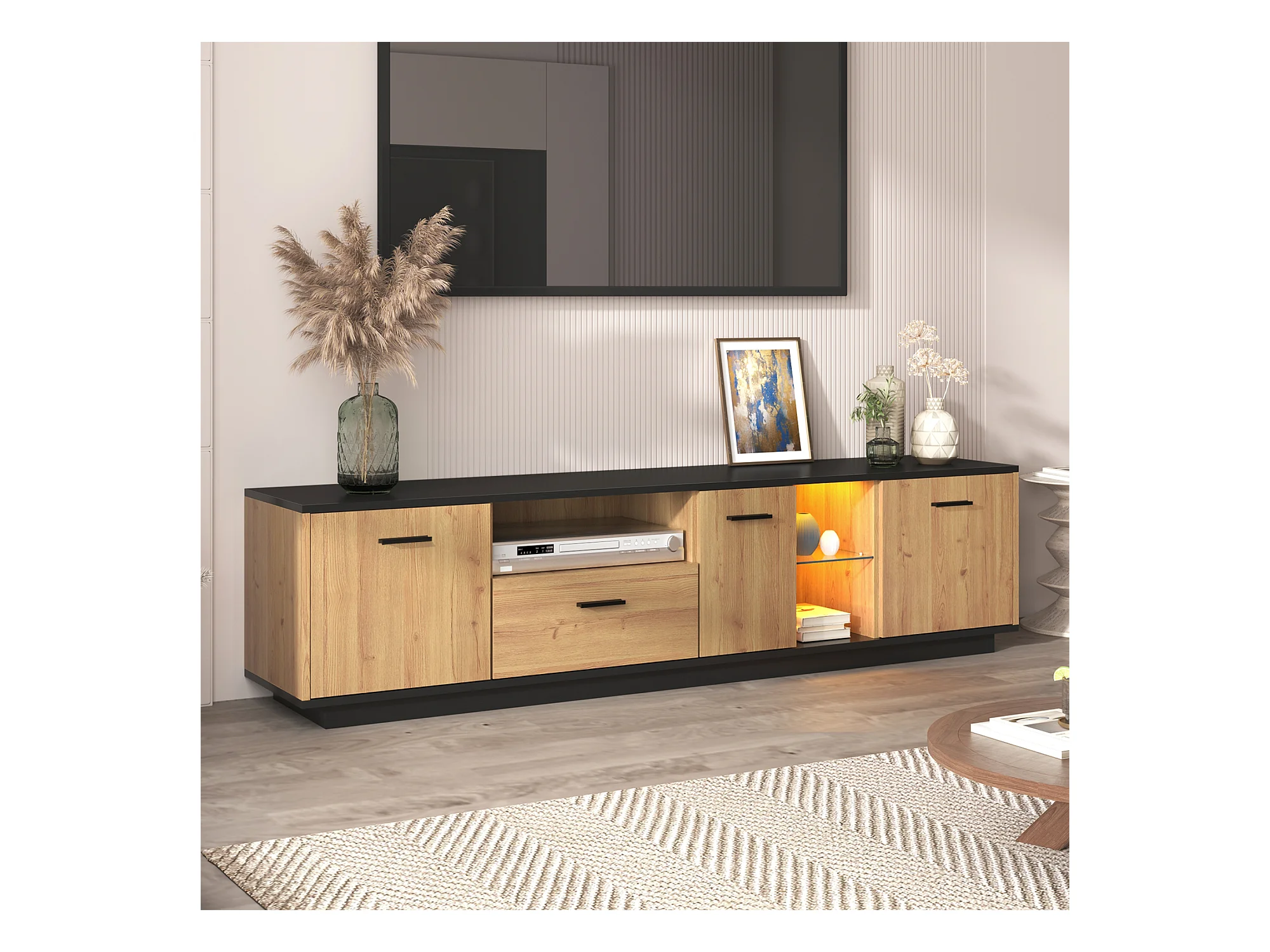 TV-meubel, met 1 lade, 3 deuren, 2 open glazen vakken, dimbare LED, MDF, zwart en hout (180x40x45cm)