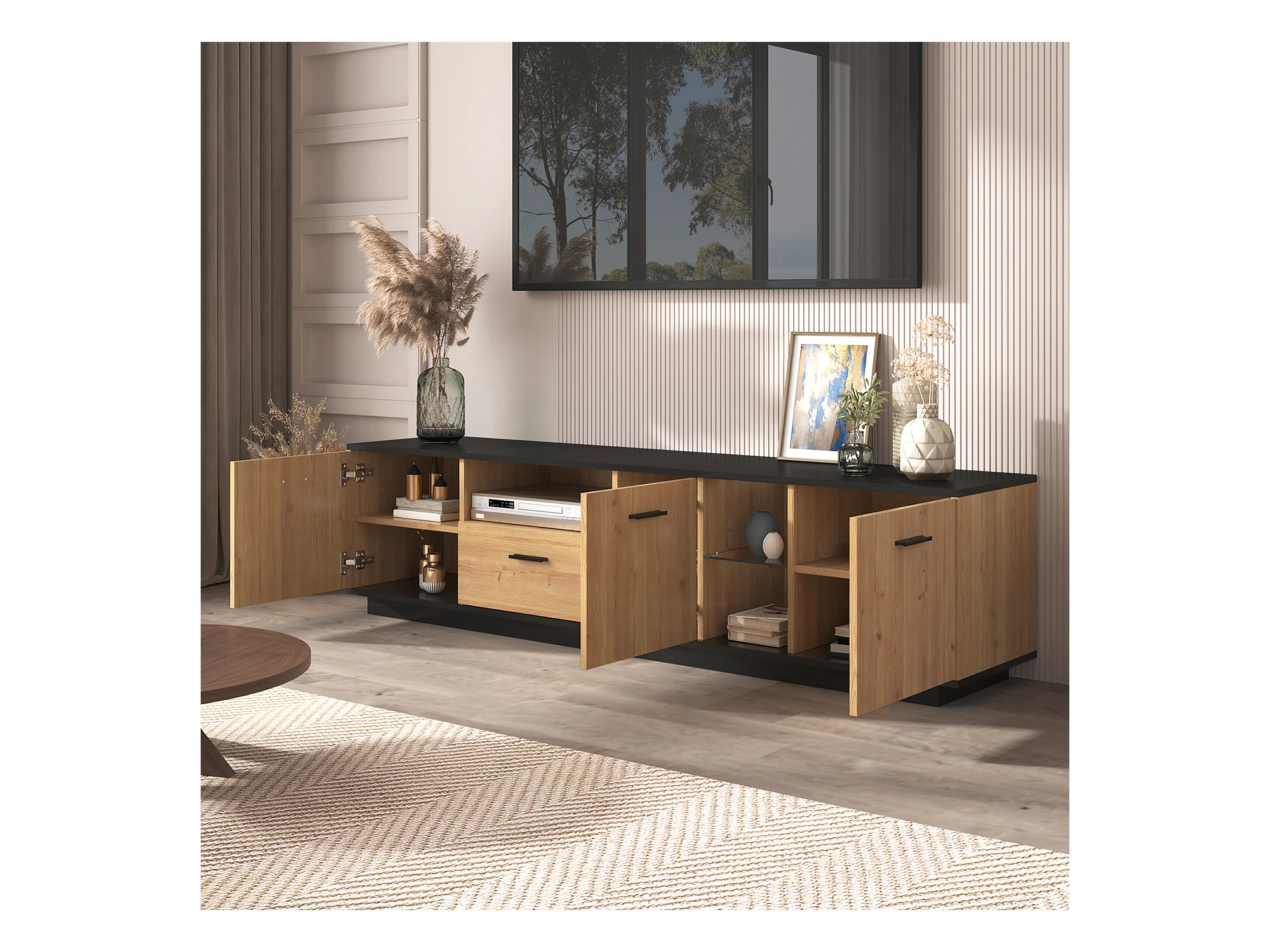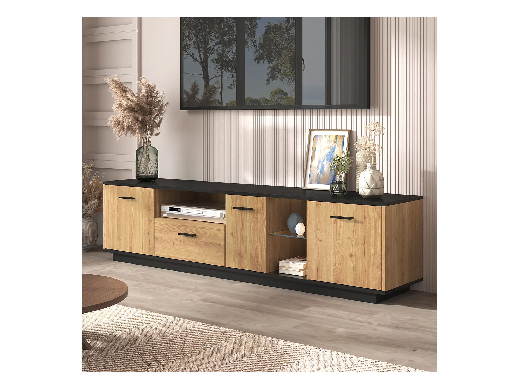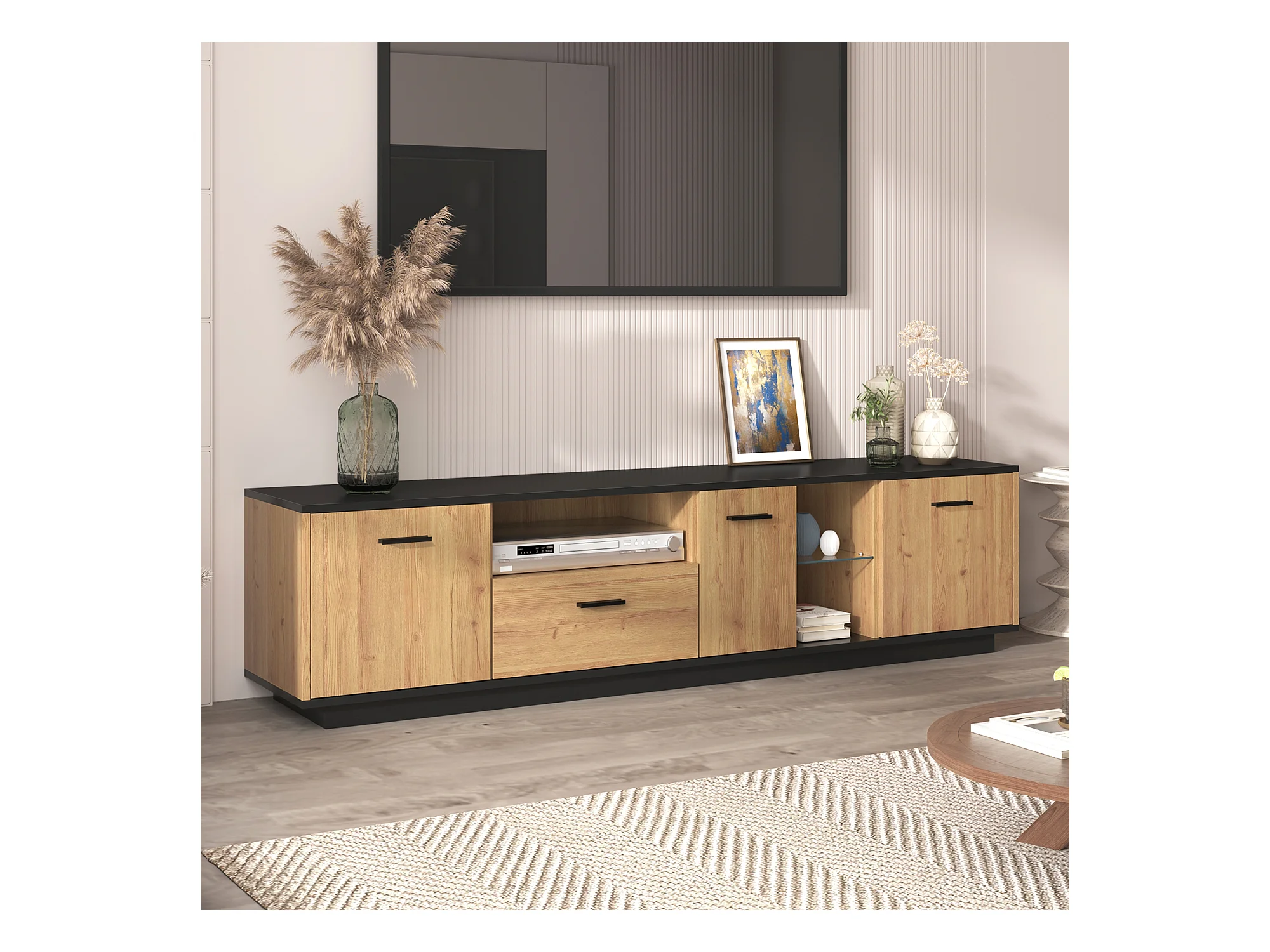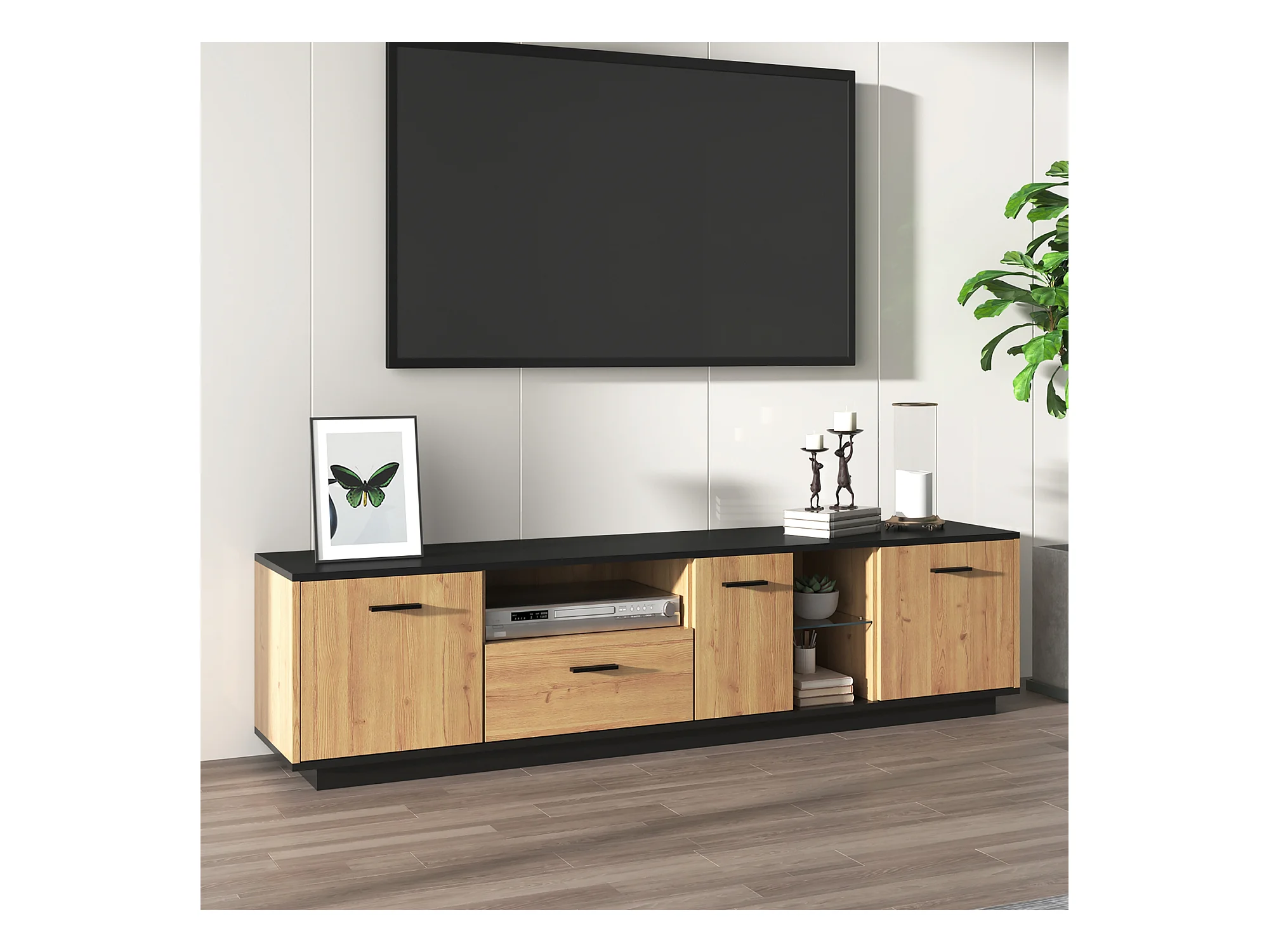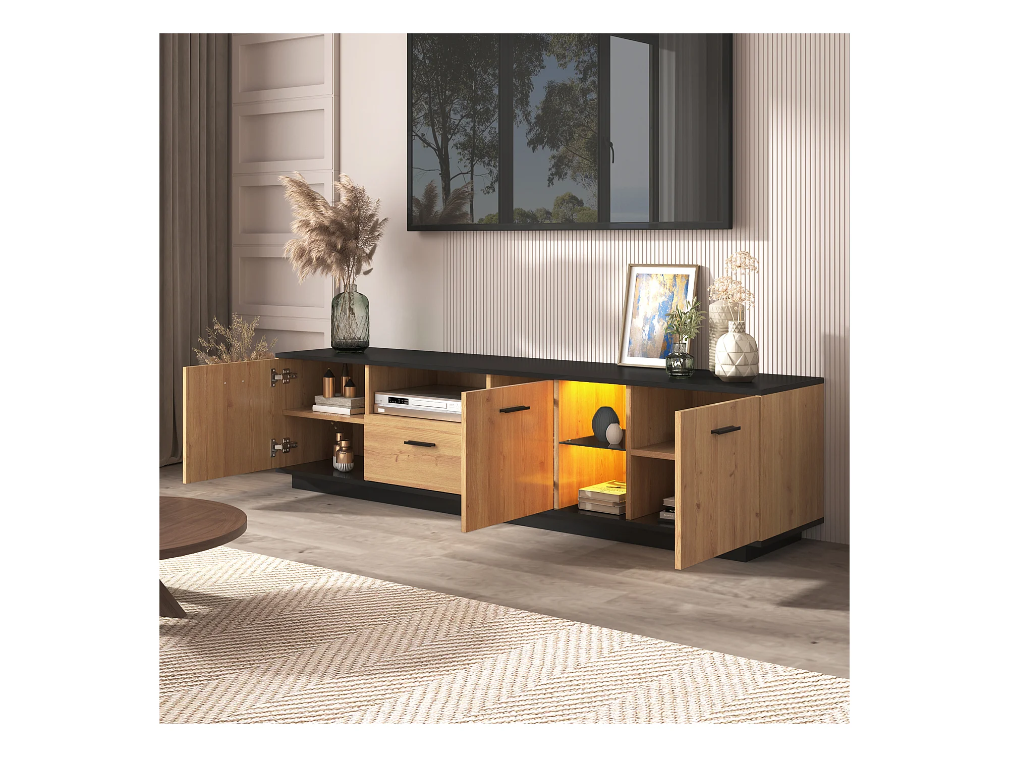 TV-meubel, met 1 lade, 3 deuren, 2 open glazen vakken, dimbare LED, MDF, zwart en hout (180x40x45cm)