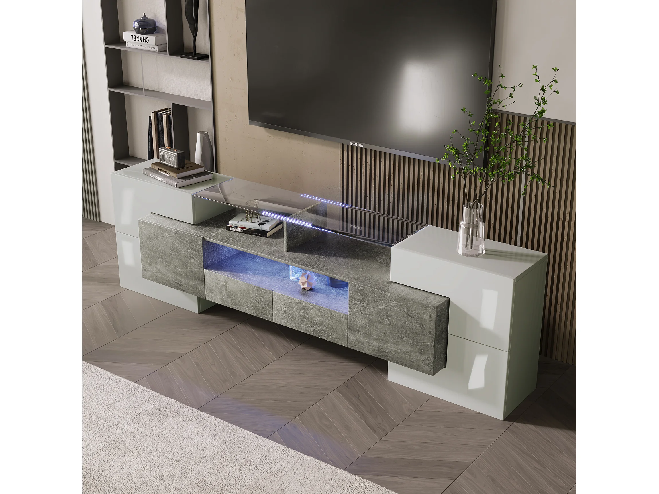 TV-meubel met 6 deuren, 2 lades en 3 nissen met LED, gelakt wit en grijs marmerfineer