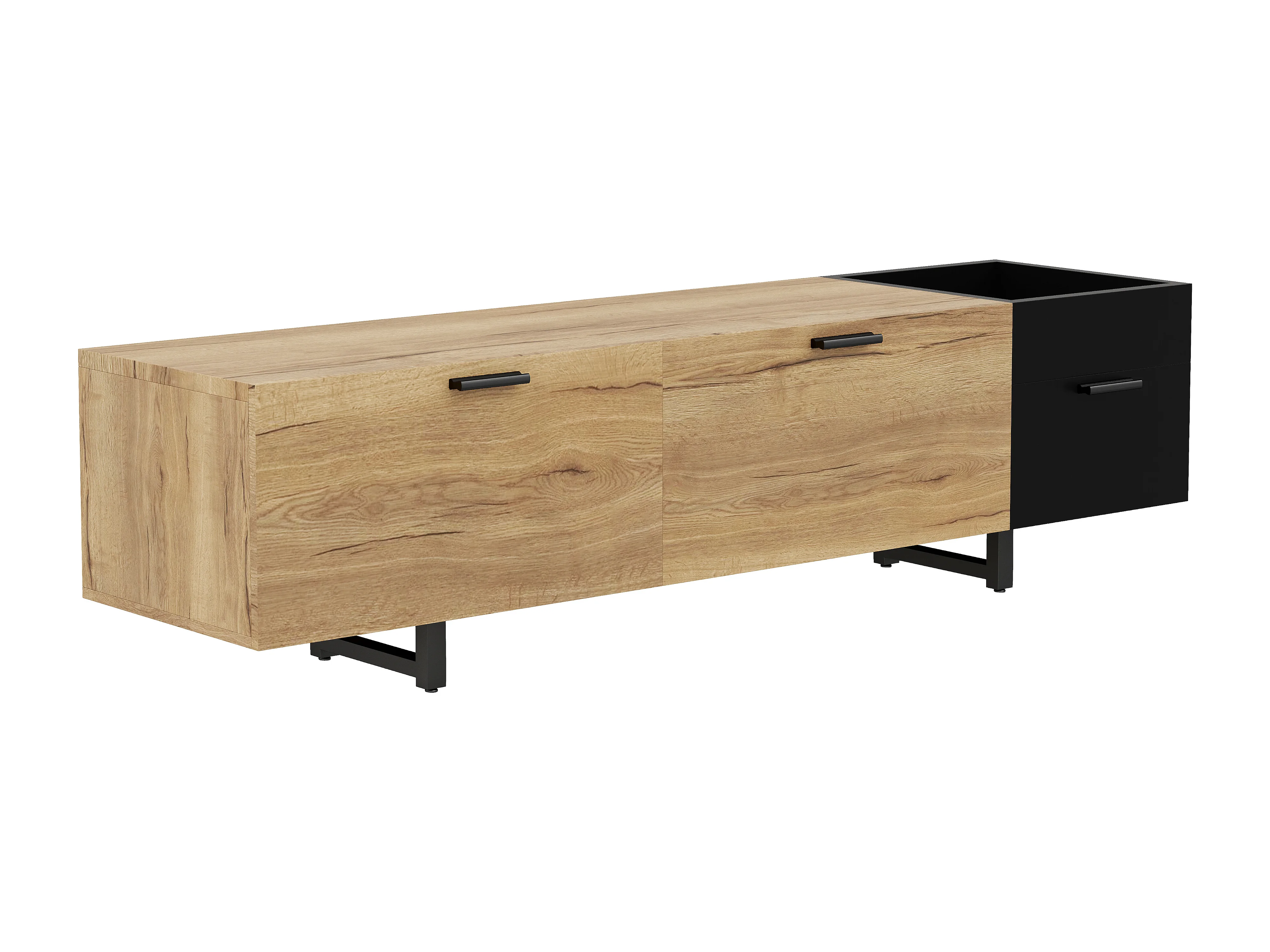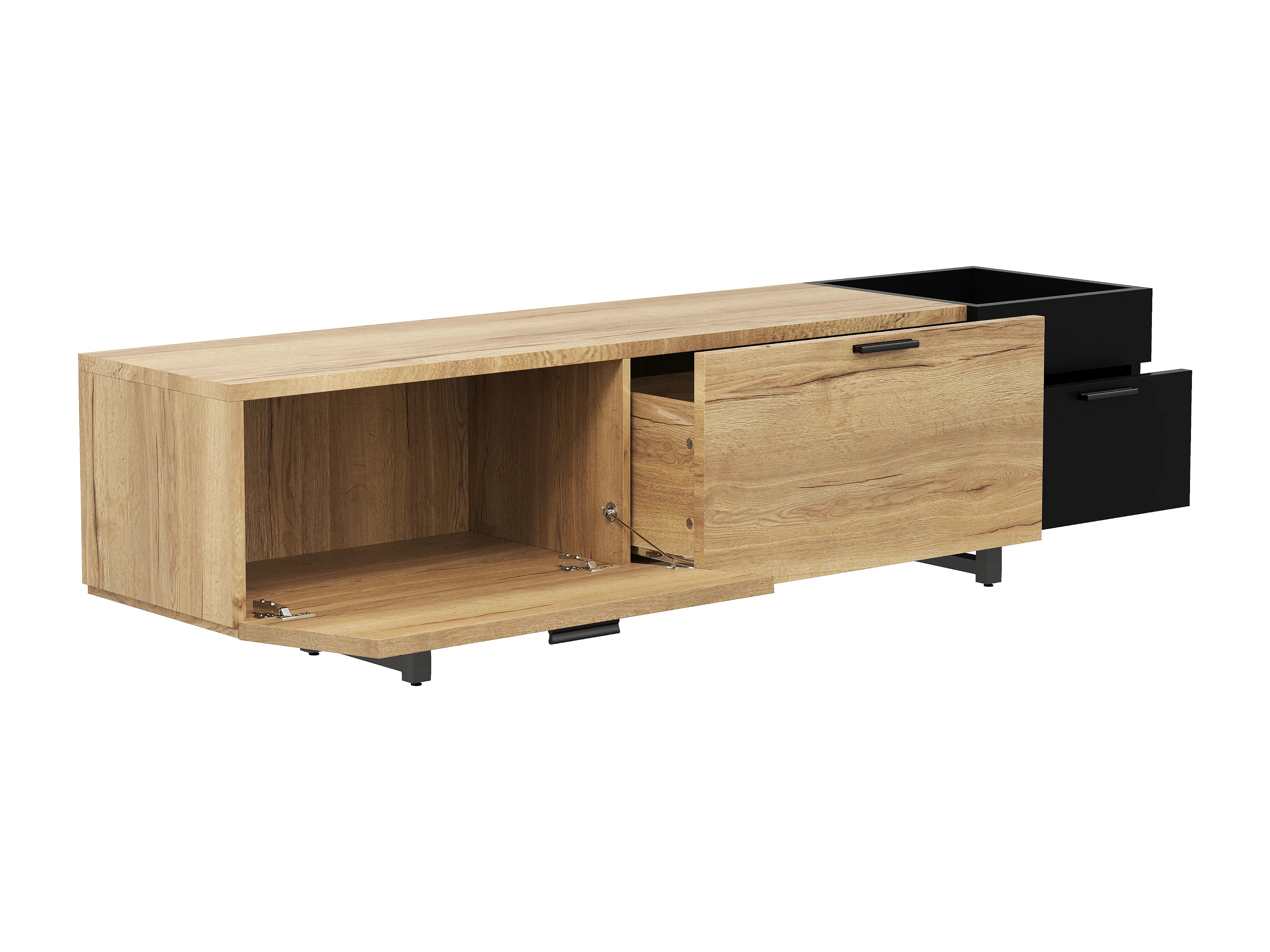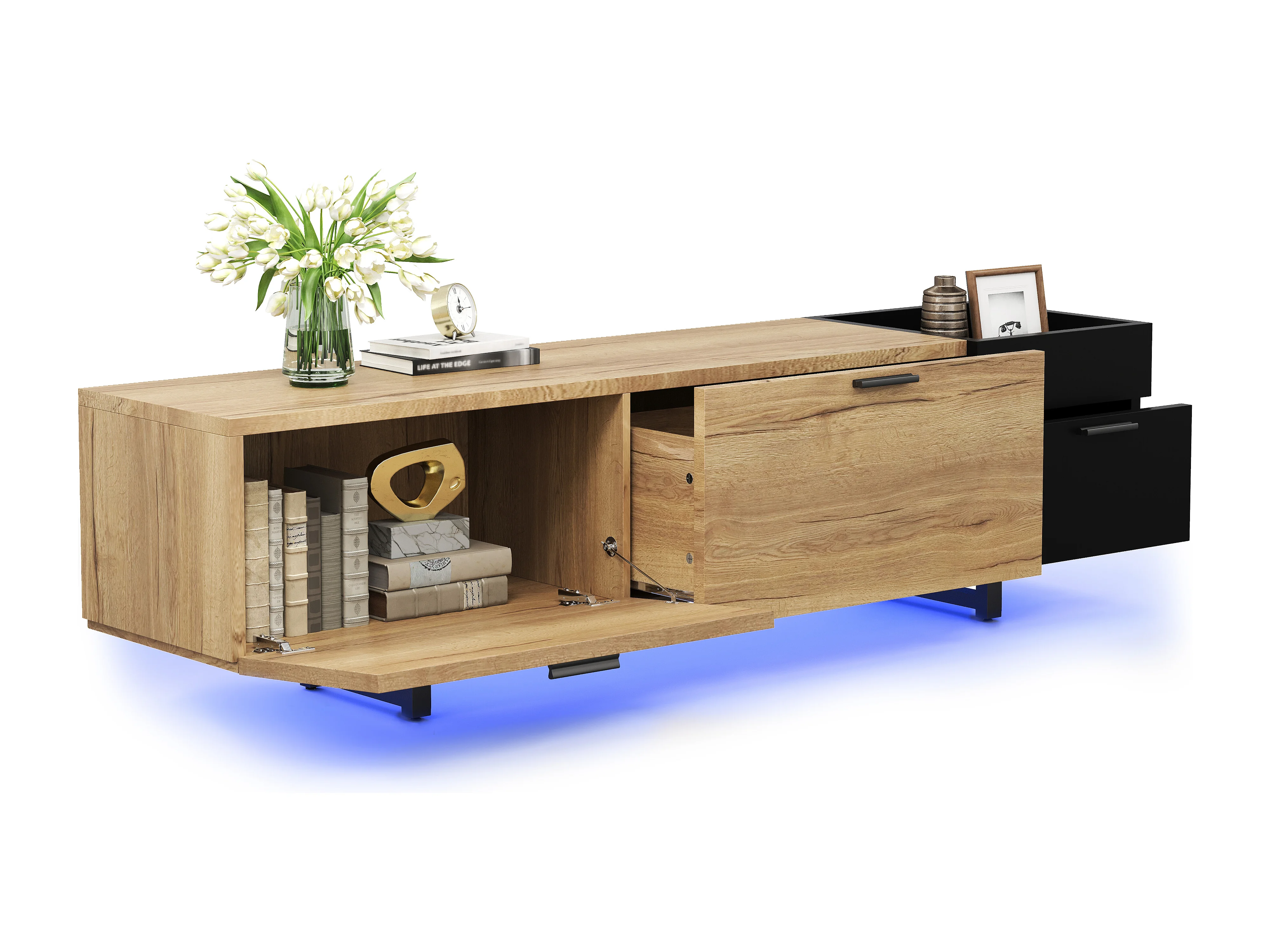 Tv-meubel met ledverlichting, 2 lades en een deur - Zwarte metalen poten - Hout en zwarte afwerking