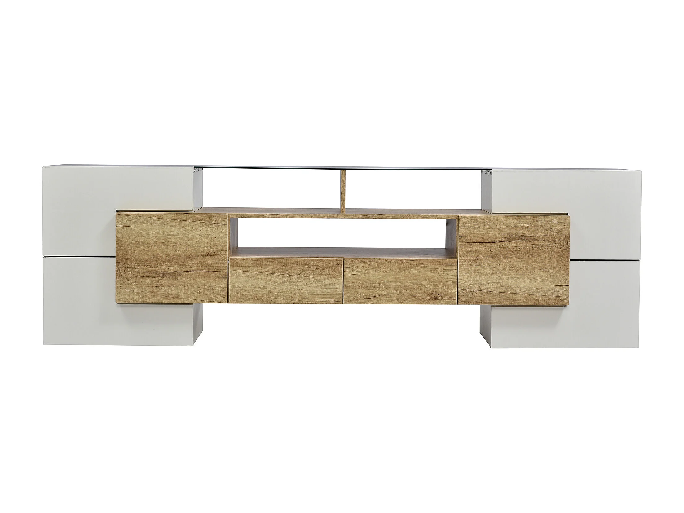 Tv-meubel met ledverlichting, 6 deuren en 2 lades - Glazen blad - Wit en hout