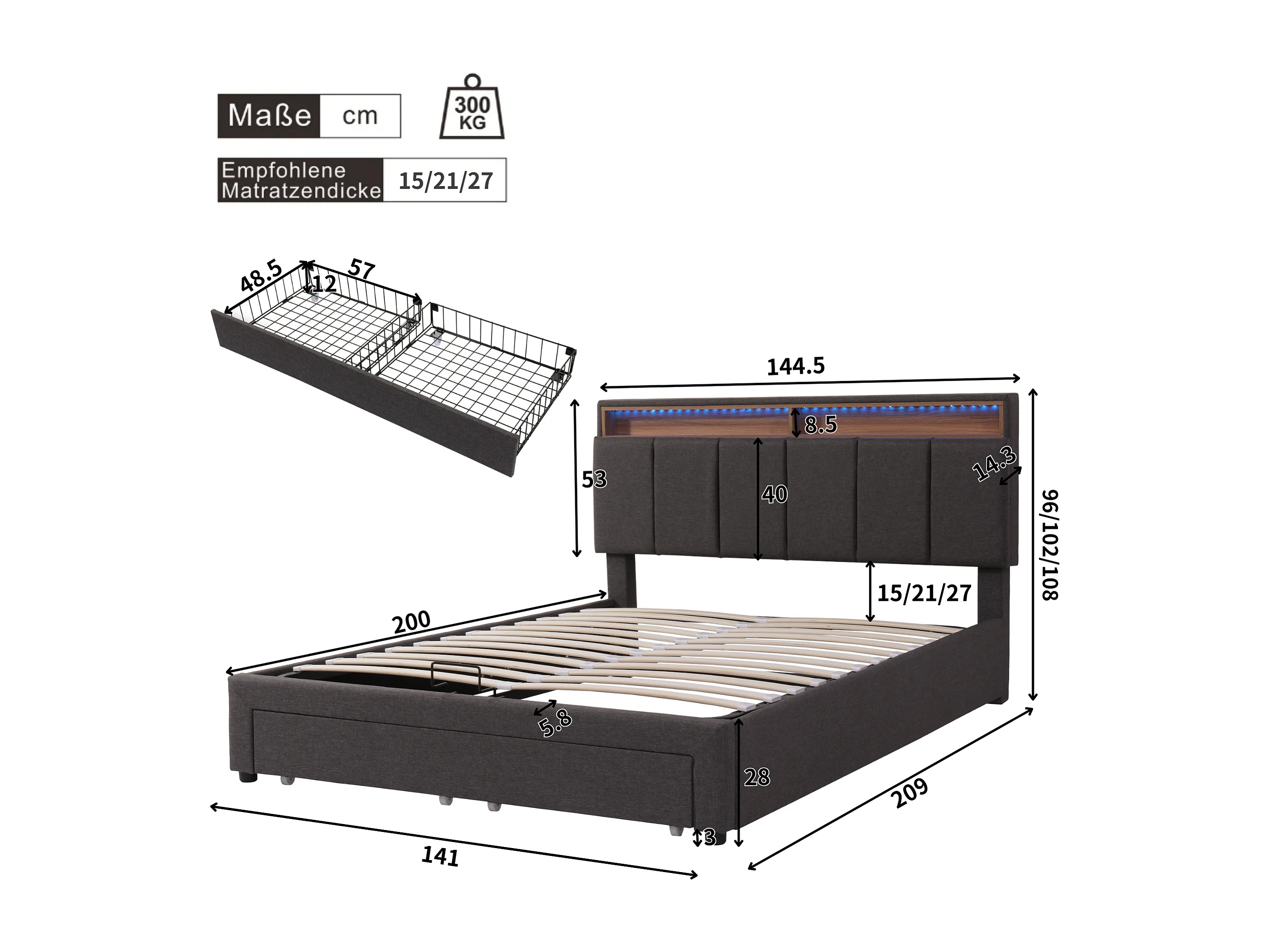 Tweepersoons opbergbed 140x200 cm, volwassen bed van grijze linnenstof met LED – modern design, lattenbodem inbegrepen (zonder matras)