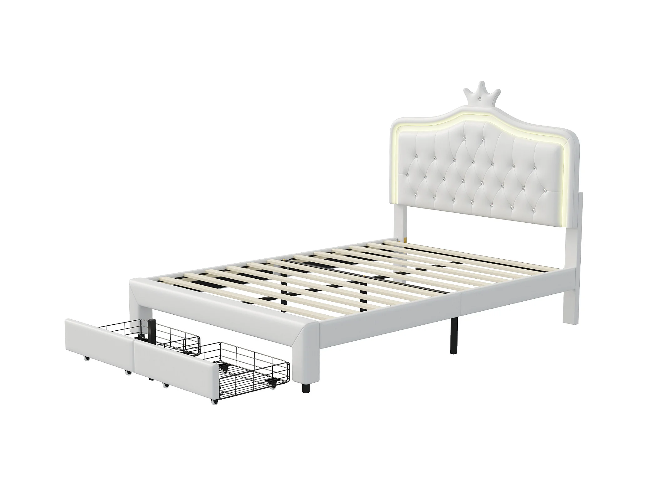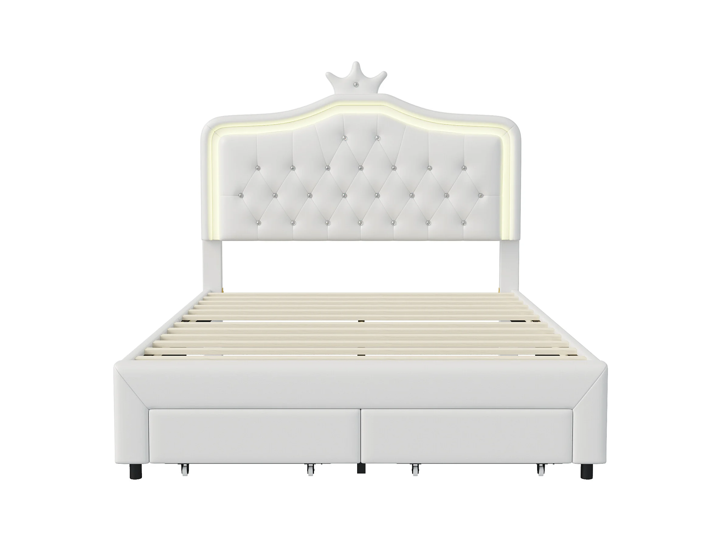 Meisjesbed 140x200 cm in wit imitatieleer met LED-verlichting – Crown hoofdbord, geïntegreerde opberglades
