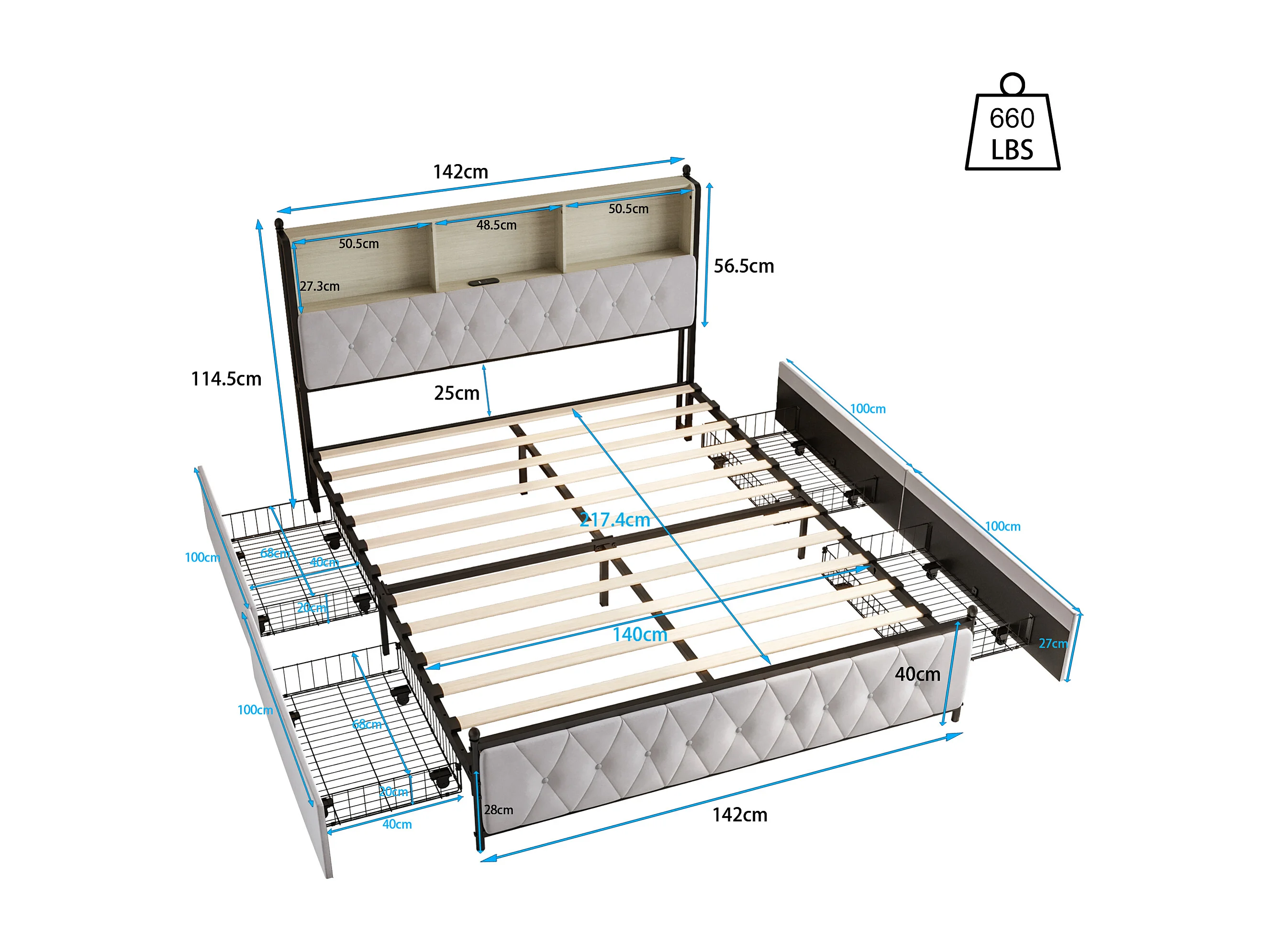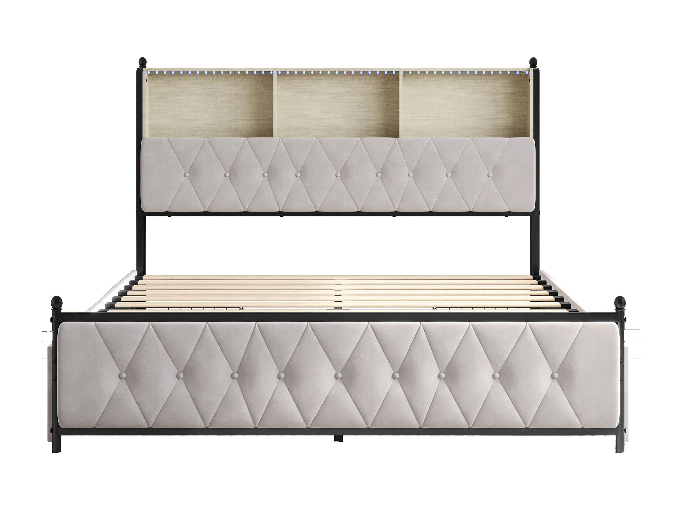 Opbergbed van 140x200 cm, tweepersoonsbed met ledverlichting, vier extra grote lades, USB- en TYPE-C-poorten, fluweel, beige