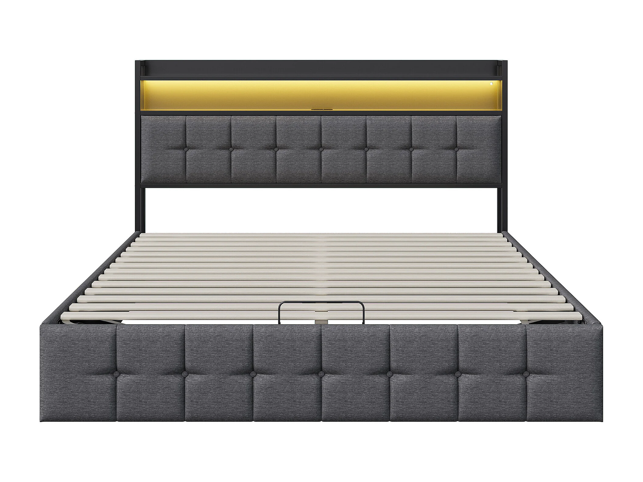 Tweepersoonsbed 140x200 cm met bedbodem en opbergruimte, gestoffeerd bed met LED-verlichting en USB-aansluiting, linnen, grijs