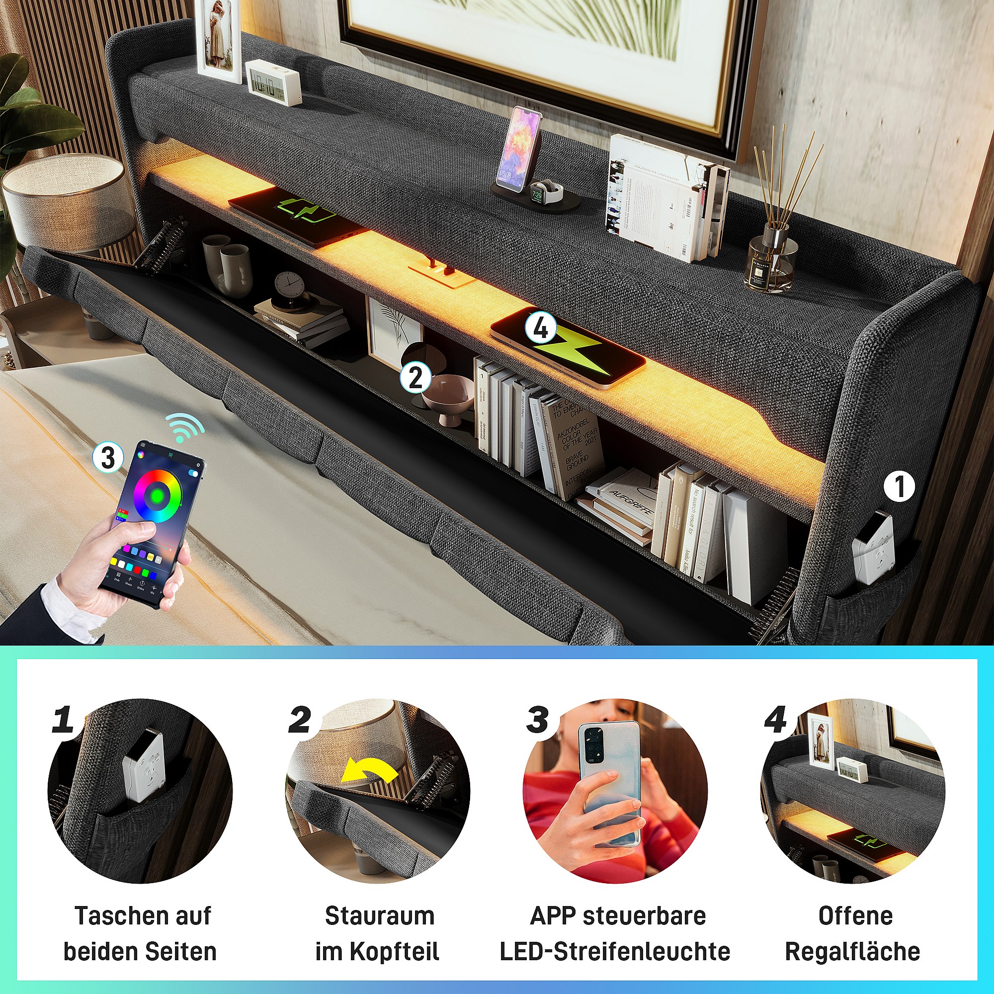 Tweepersoonsbed met USB Type-C, app-gestuurde LED, opbergruimte aan het hoofdeinde, linnen, grijs (141x213x106cm)