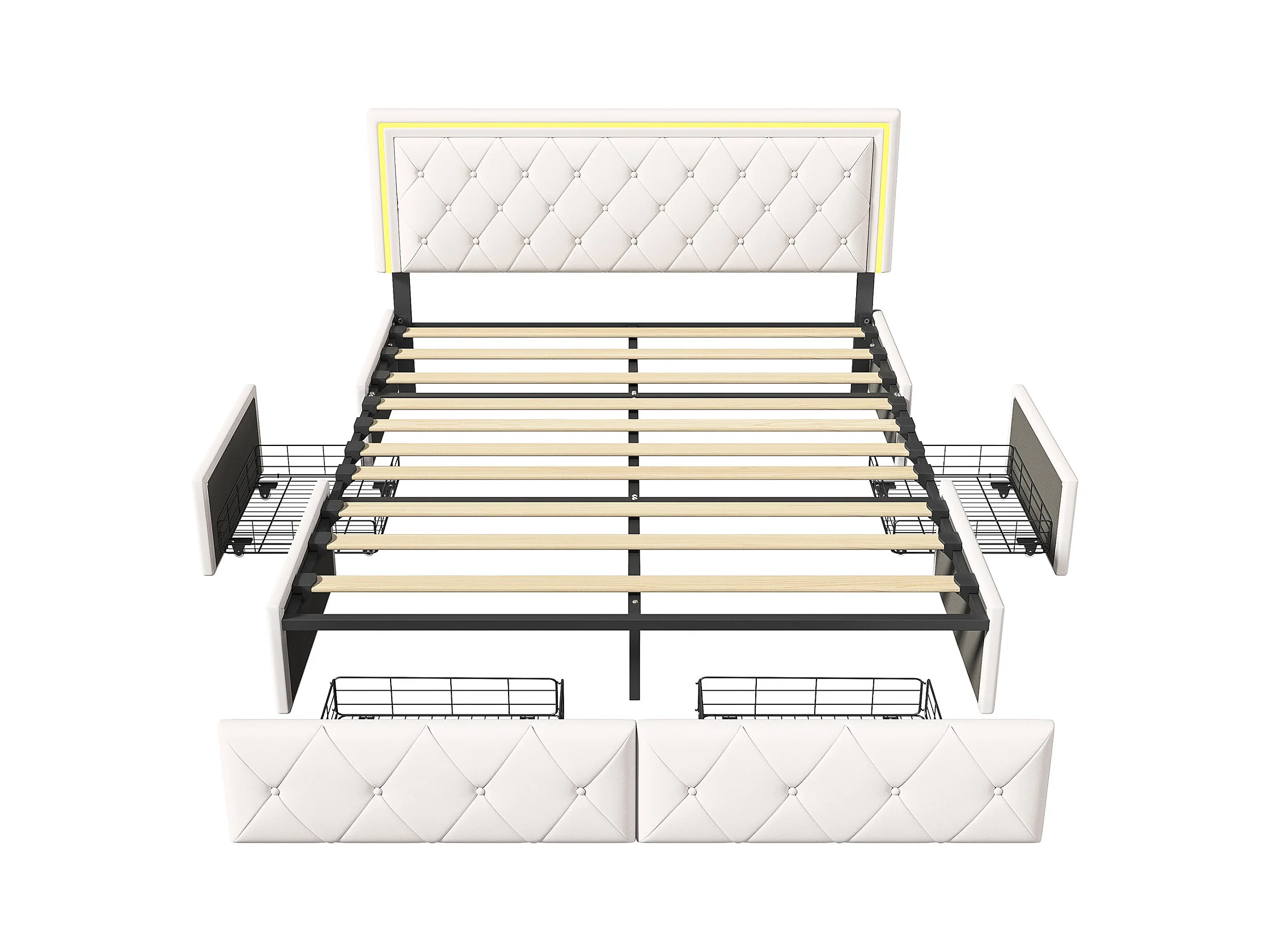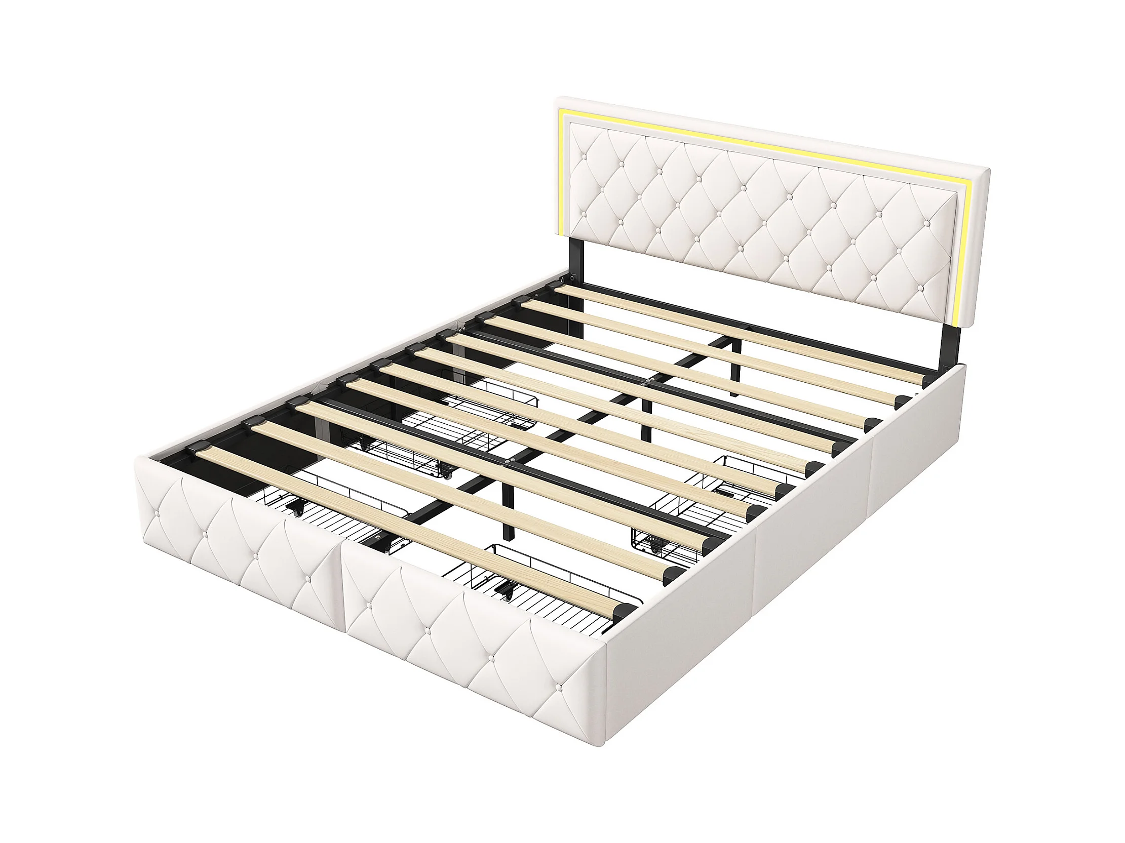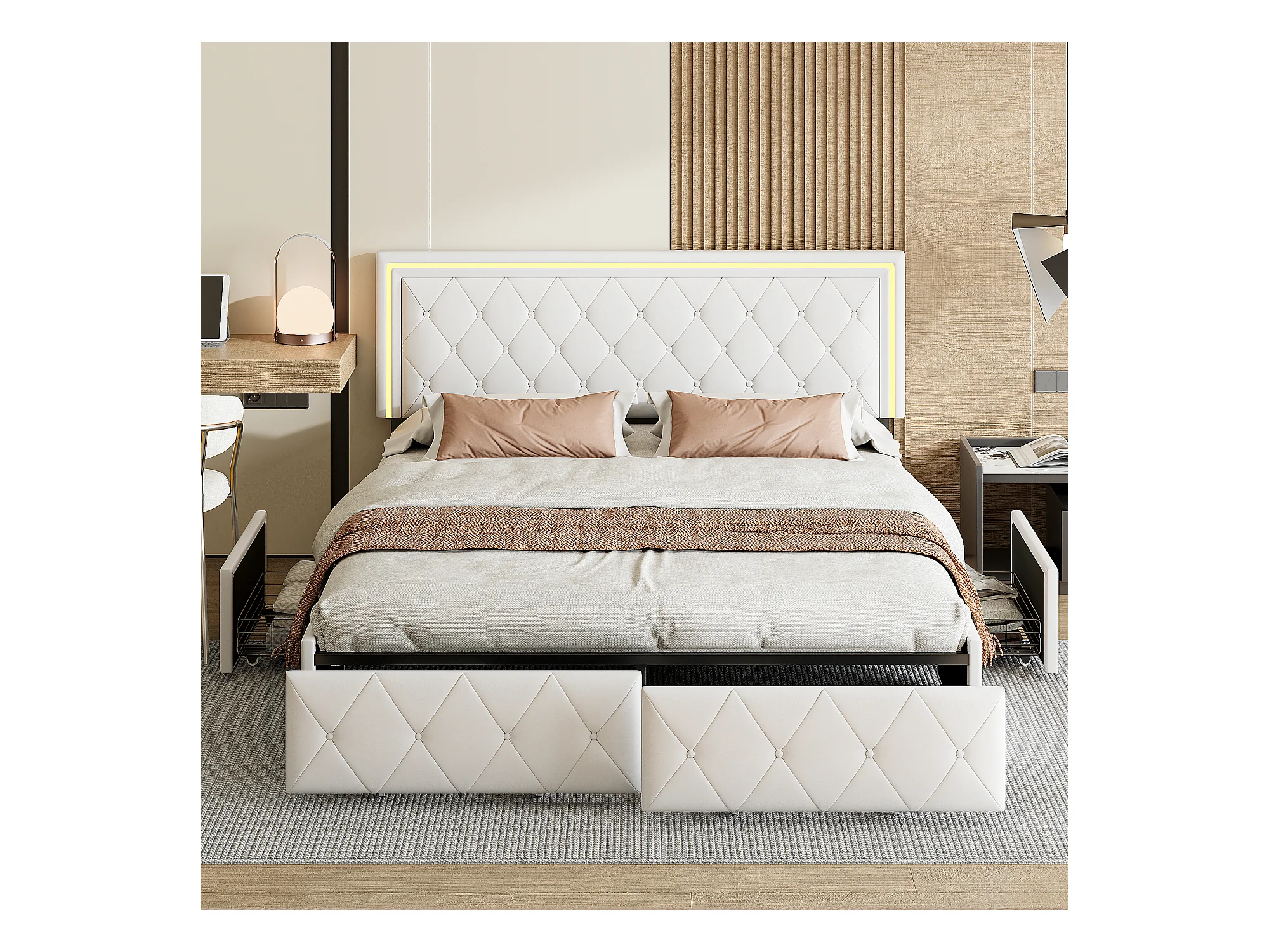 Tweepersoonsbed 140x200cm met LED en 4 lades - kunstlederen stof - met lattenbodem - Beige
