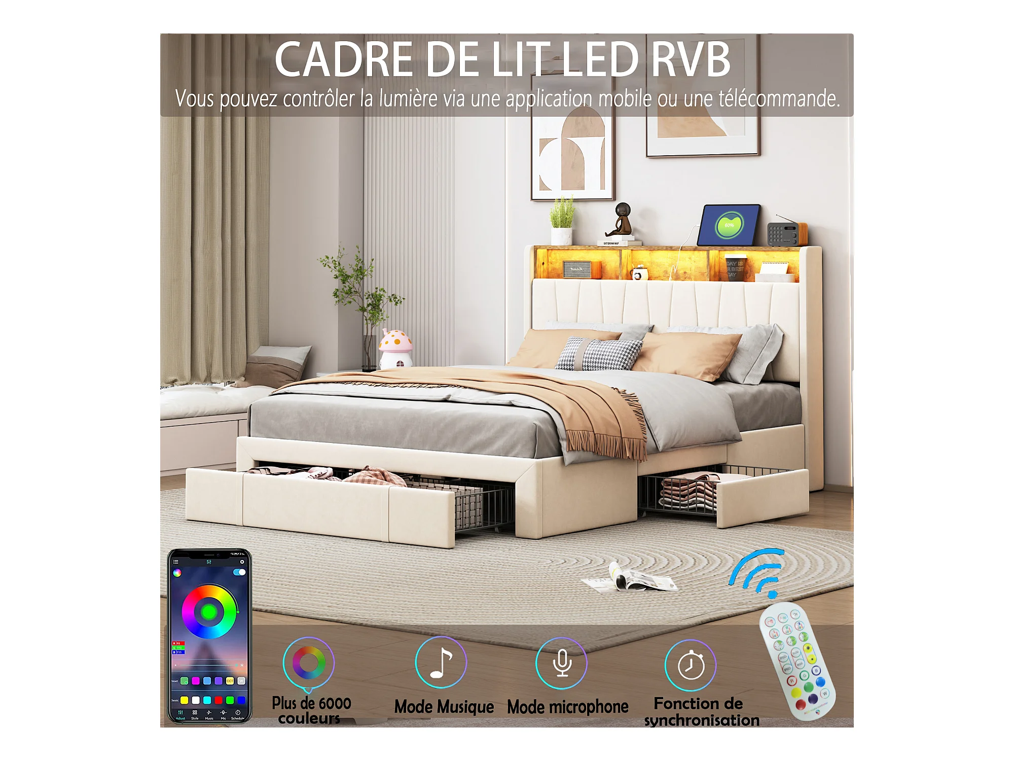 Gepolsterd bed in beige fluweel - 160x200cm - 4 lades + LED + USB + Speakers - verstelbare hoofdeinde