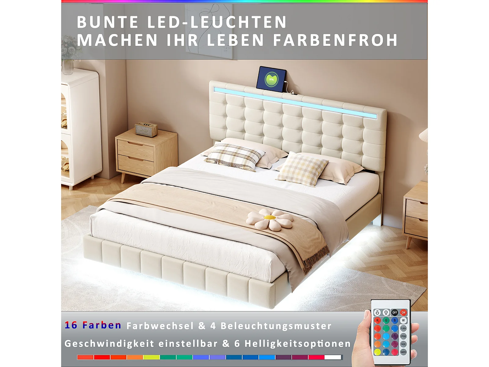 Tweepersoonsbed 160 x 200 cm, gestoffeerd zwevend bedframe, met led-verlichting, linnen, beige