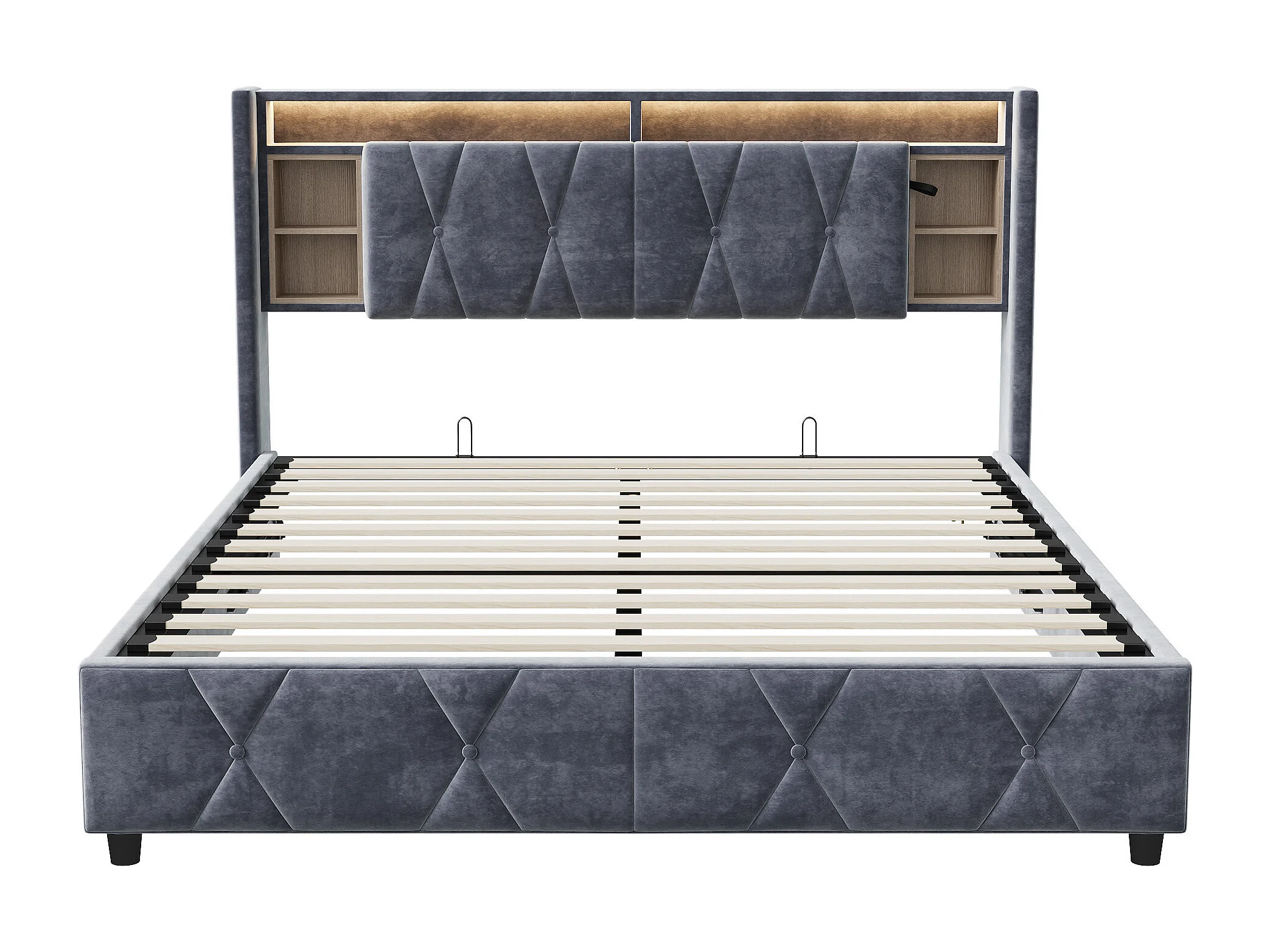 Tweepersoonsbed 160 x 200 cm met ledverlichting, opbergruimte in het hoofdeinde, USB- en Type-C-oplader, fluweel, grijs