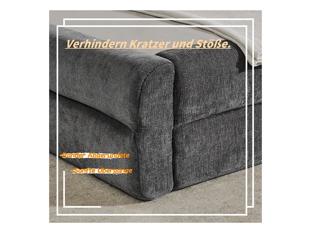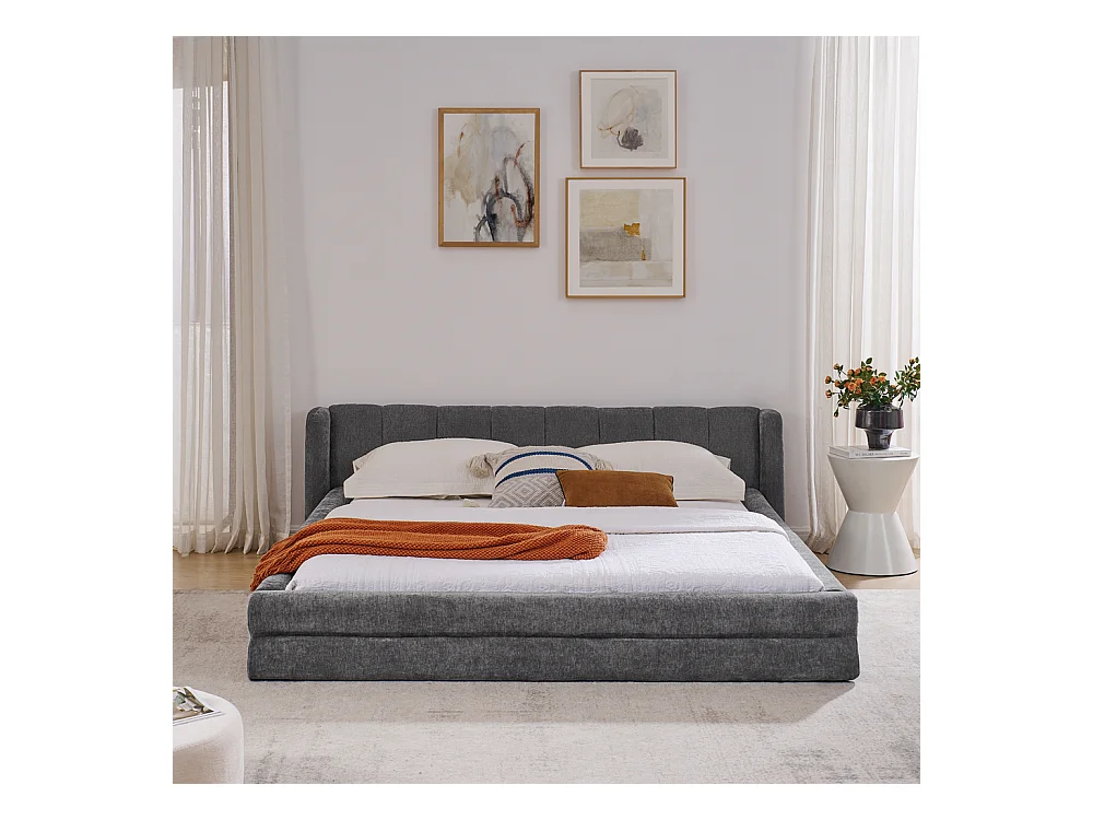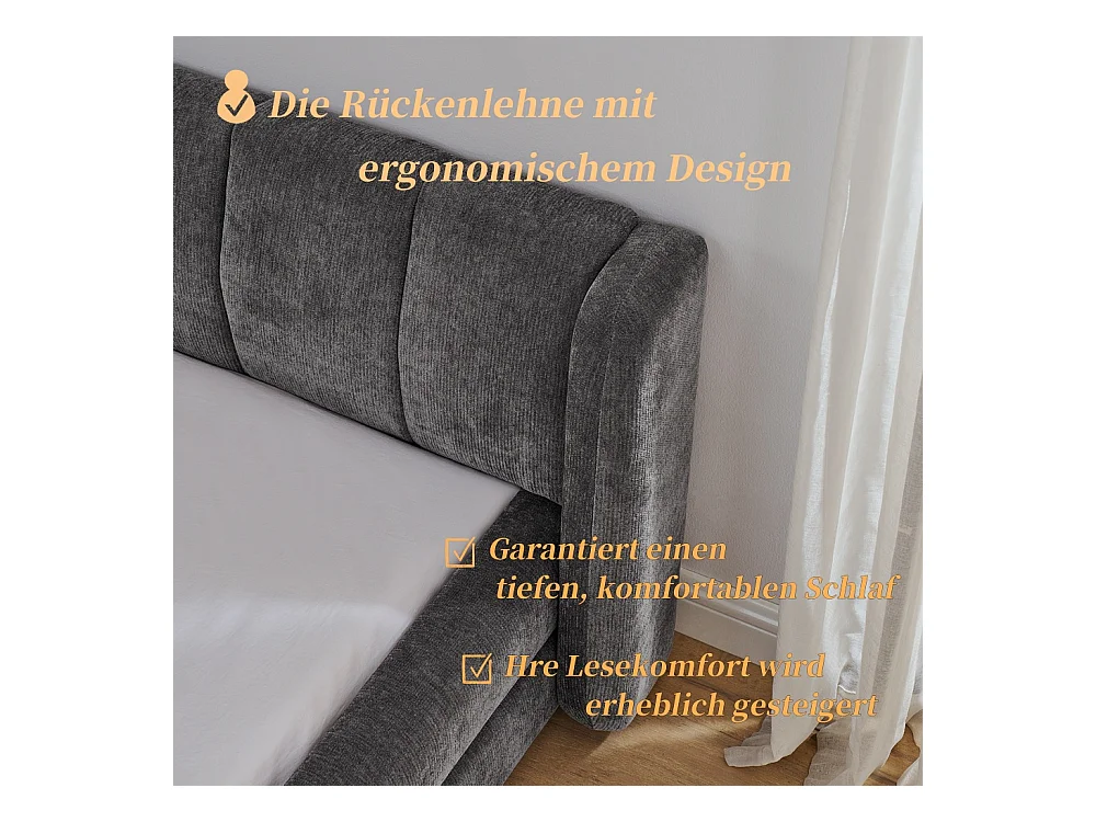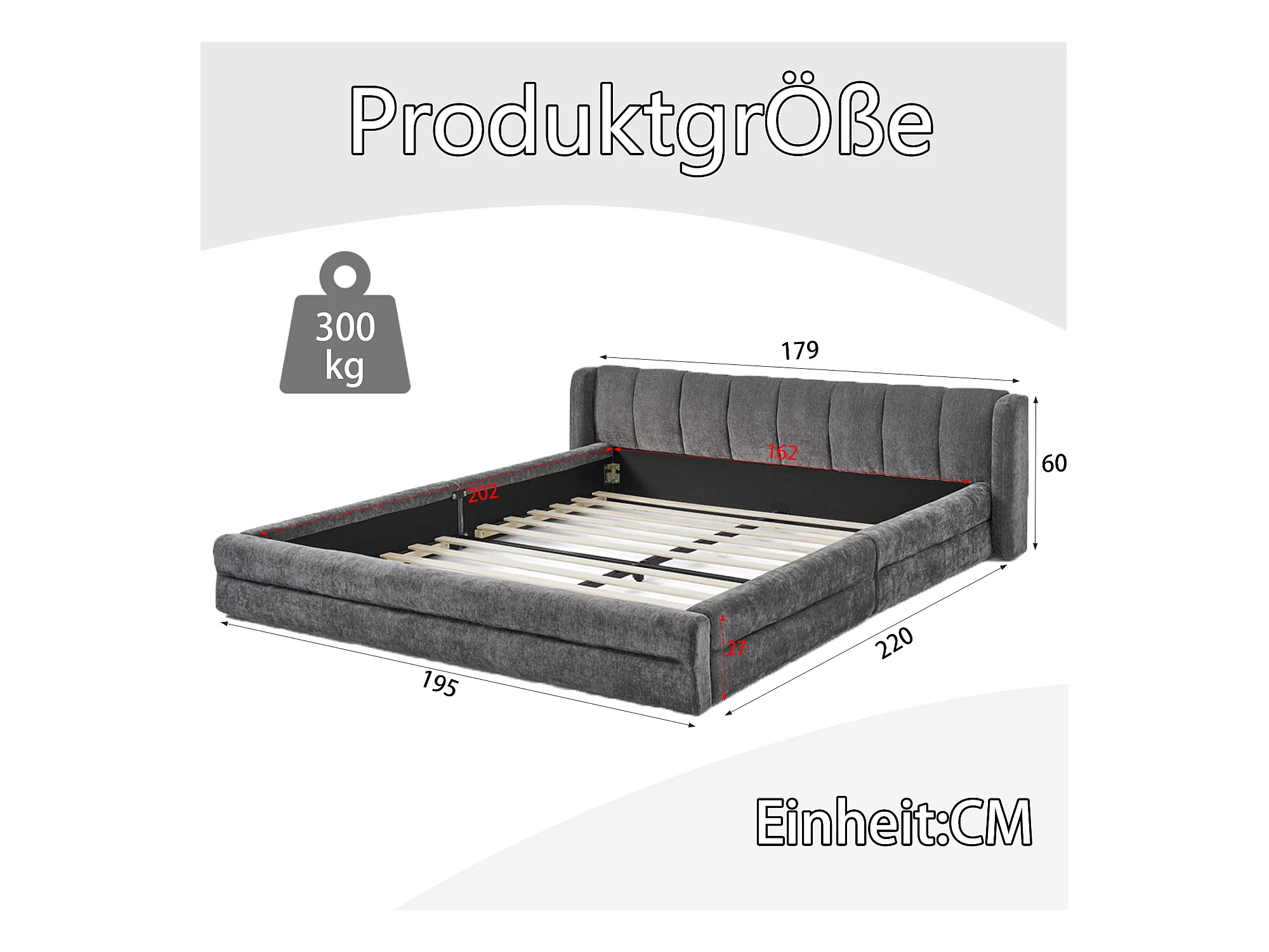 Gestoffeerd bed, tweepersoonsbed 160×200 cm, opbergbed, bedframe met USB-C en volvlaks lattenbodem, zonder hoofdeinde, katoen, grijs, zonder matras