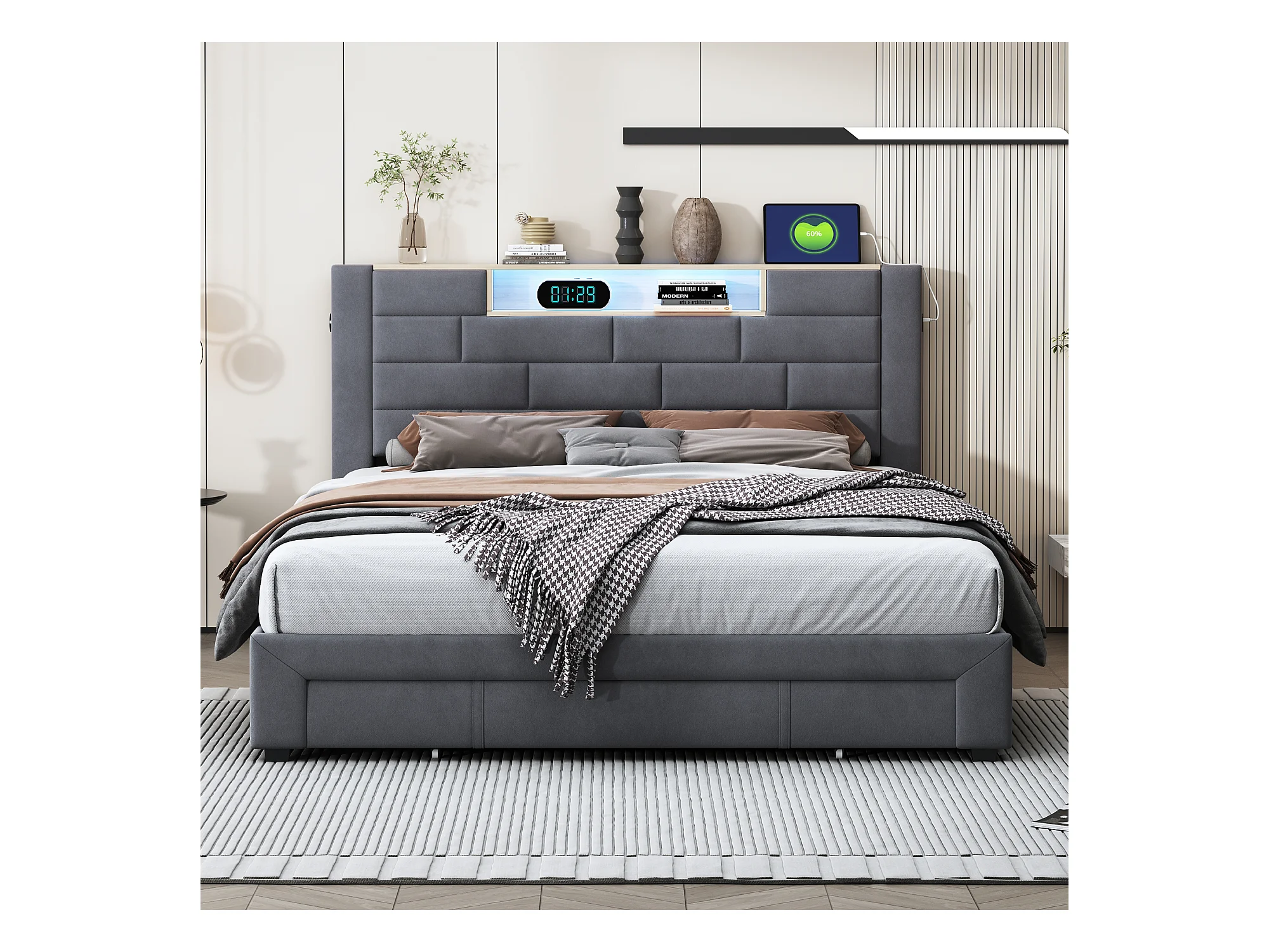 Gepolsterd bed in grijs fluweel - 160x200cm - 4 lades + LED + USB + Speakers - verstelbare hoofdeinde