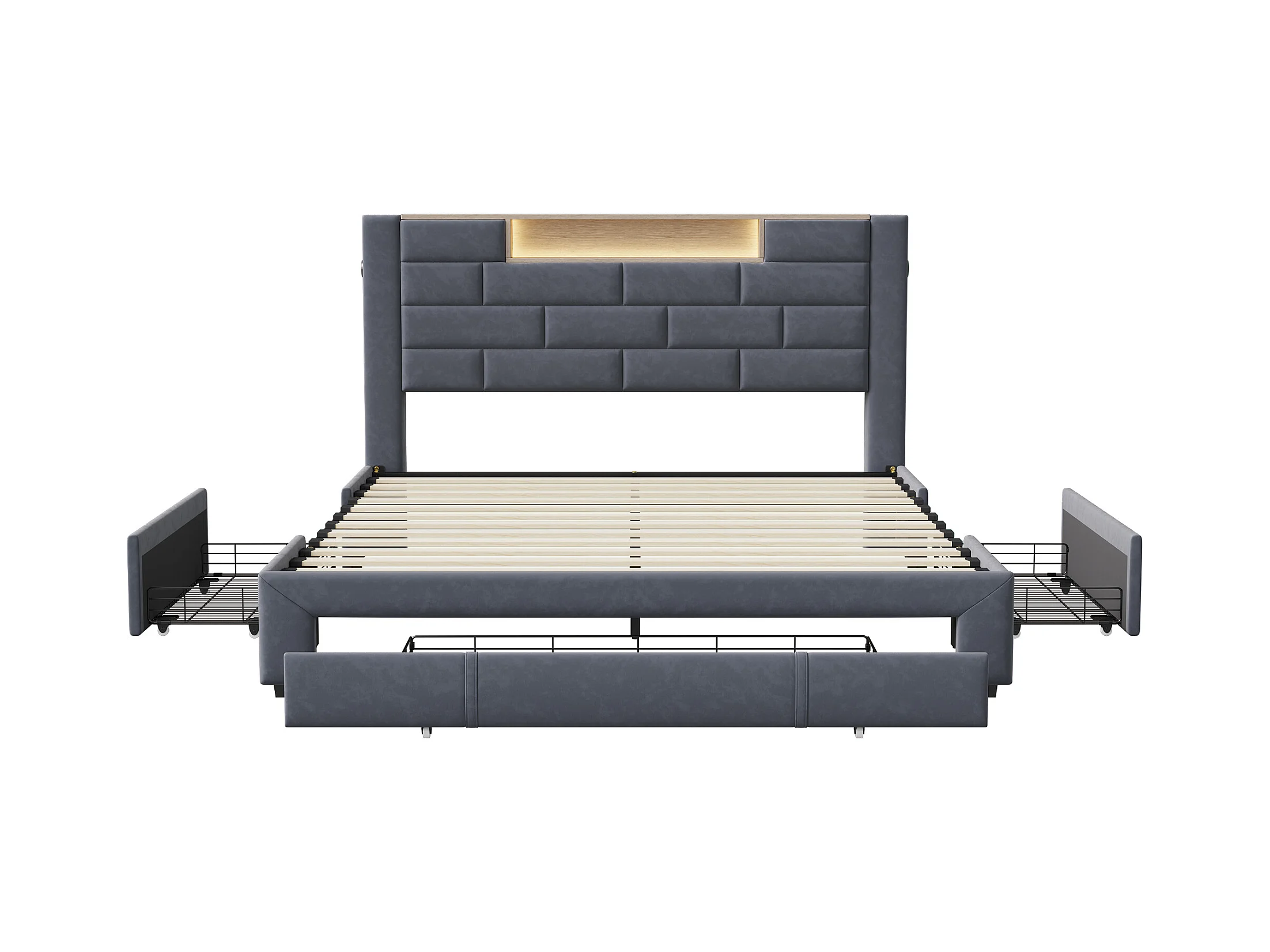 Tweepersoonsbed 160x200cm - fluwelen bedframe met 3 lades, lattenbodem en LED-hoofdbord met USB/C-aansluiting - Grijs