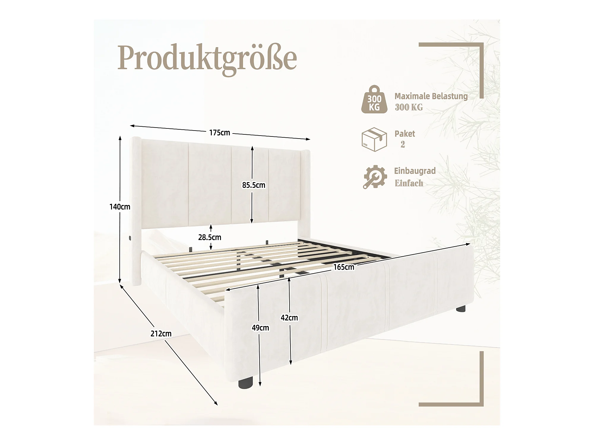 Tweepersoonsbed 160x200 cm met hoofdbord en lattenbodem, USB-poort - beige fluweel (zonder matras)