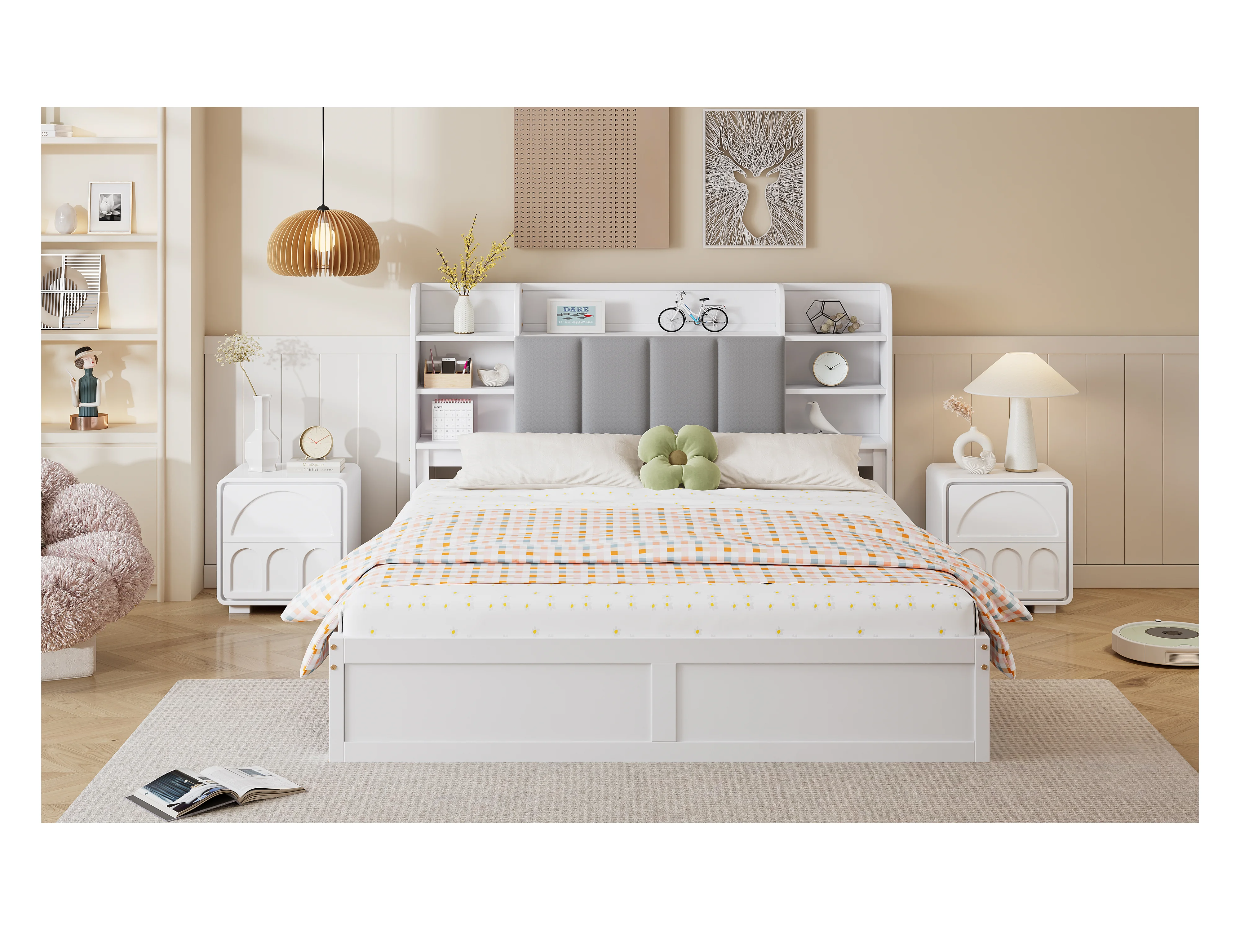 Tweepersoonsbed 160x200 cm met open planken, opbergbed met drie lades op wielen, wit