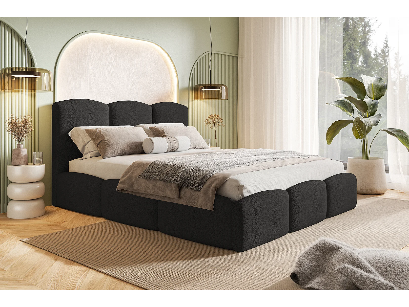 Tweepersoonsbed 160x200 Roma Slim - bed met opbergruimte, metalen lattenbodem - Bouclé Zwart (Anthology 19)