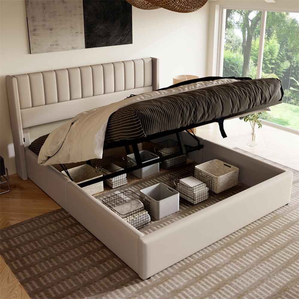 Tweepersoonsbed 160x200cm, hydraulisch gestoffeerd bed, opbergbed met houten lattenbodem, linnen, beige