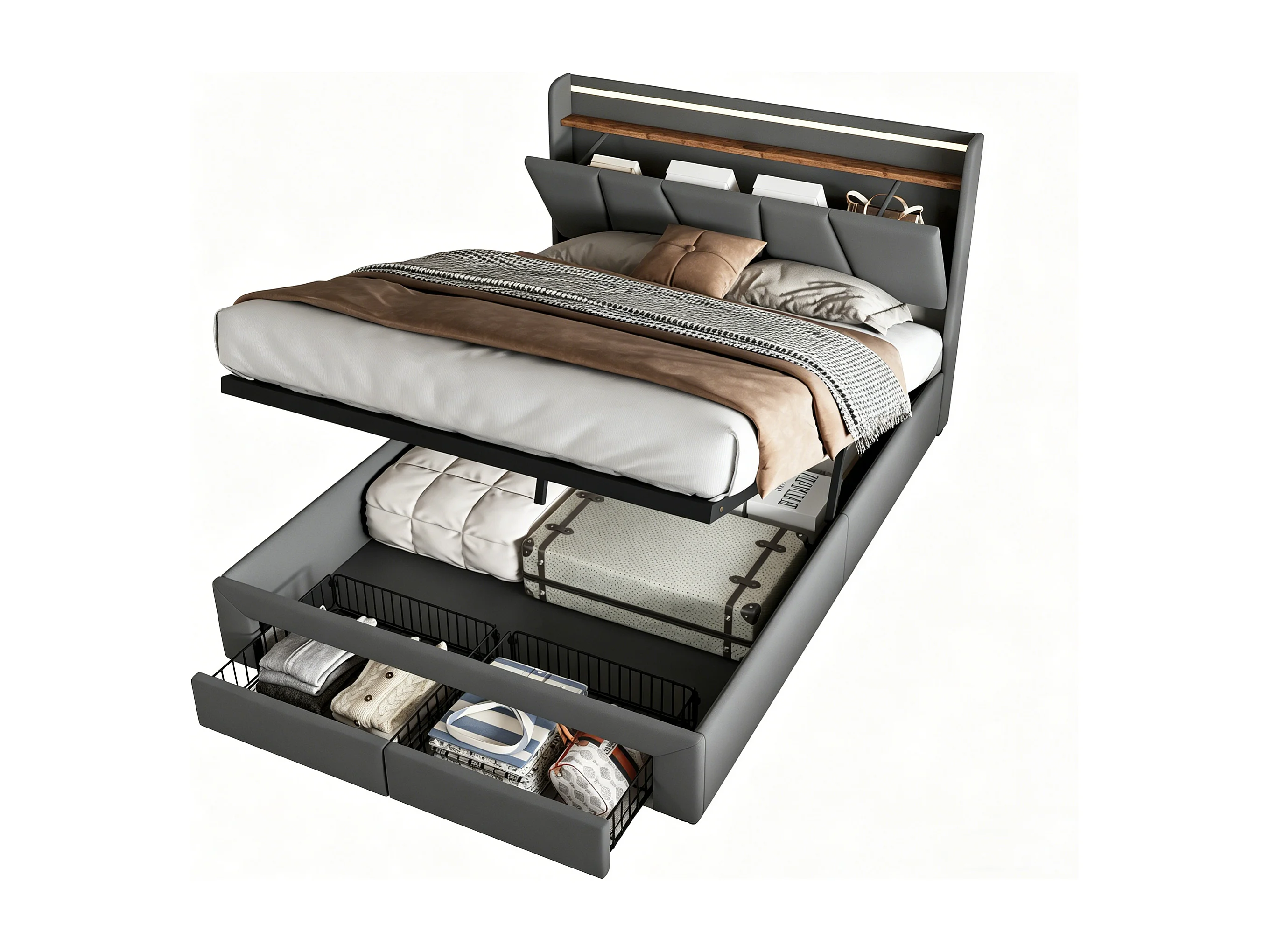 Tweepersoonsbed 160x200cm met ledverlichting en USB-poorten - hydraulisch opbergvak en 2 lades - linnengoed - grijs
