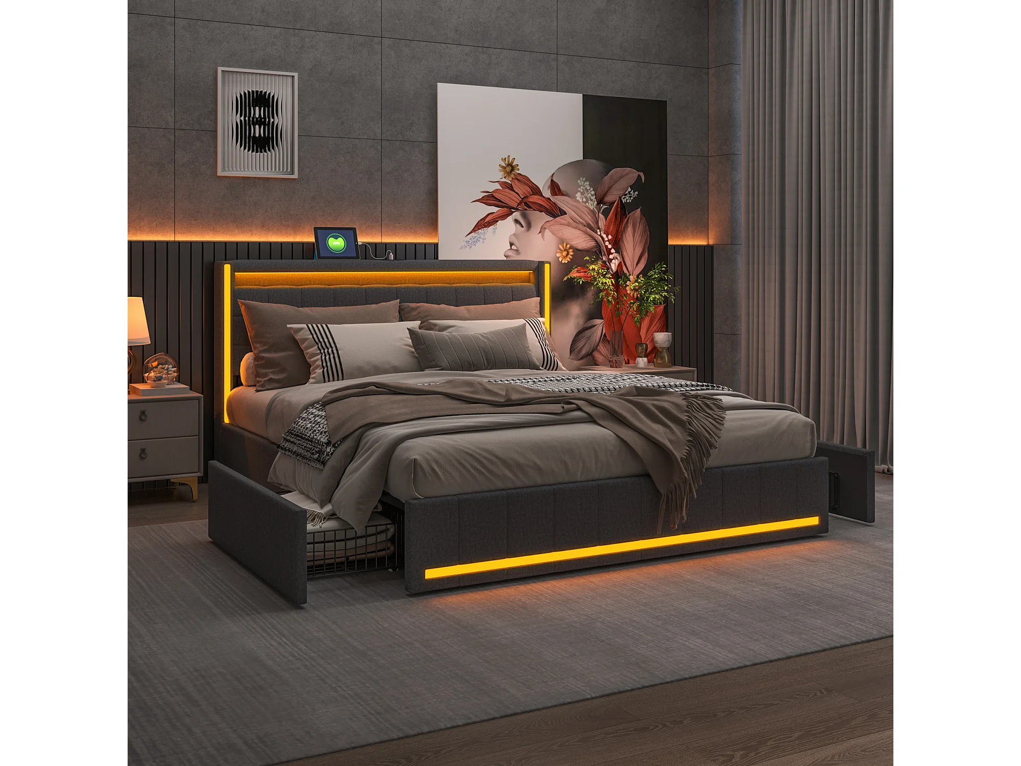 Tweepersoonsbed 180 x 200 cm – met ledverlichting en USB-oplaadpoort – 4 lades – beddengoed – grijs