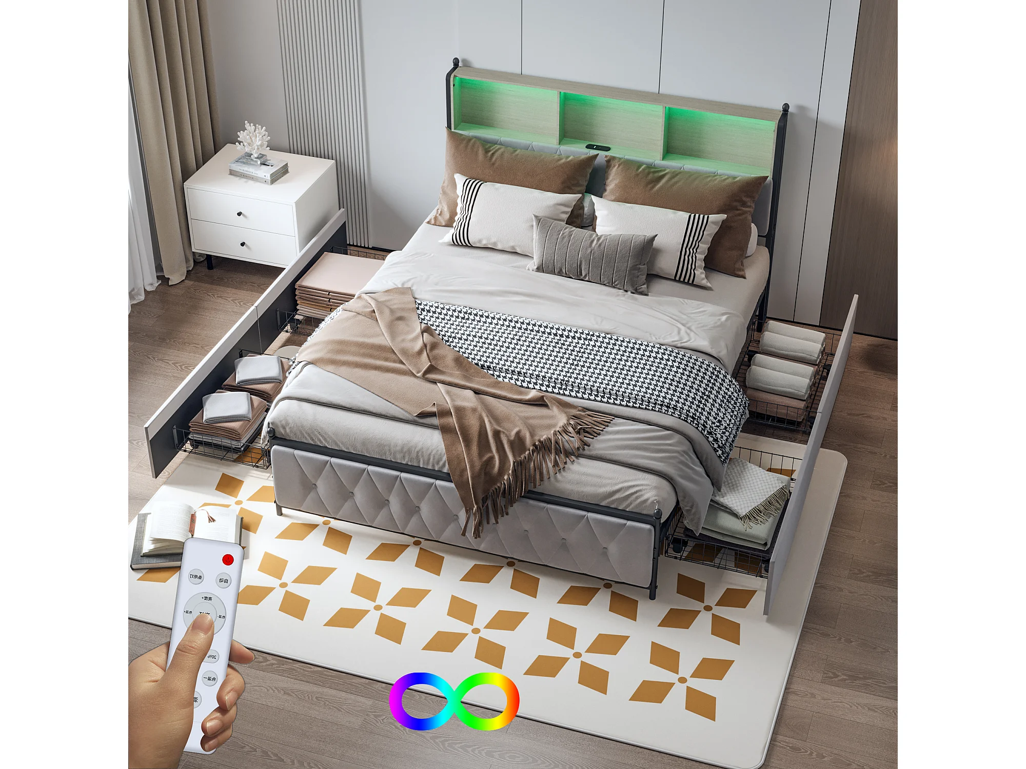 Tweepersoonsbed 180x200 cm, 4 lades, USB/Type-C-aansluitingen, LED-verlichting, lattenbodem, beige fluweel.