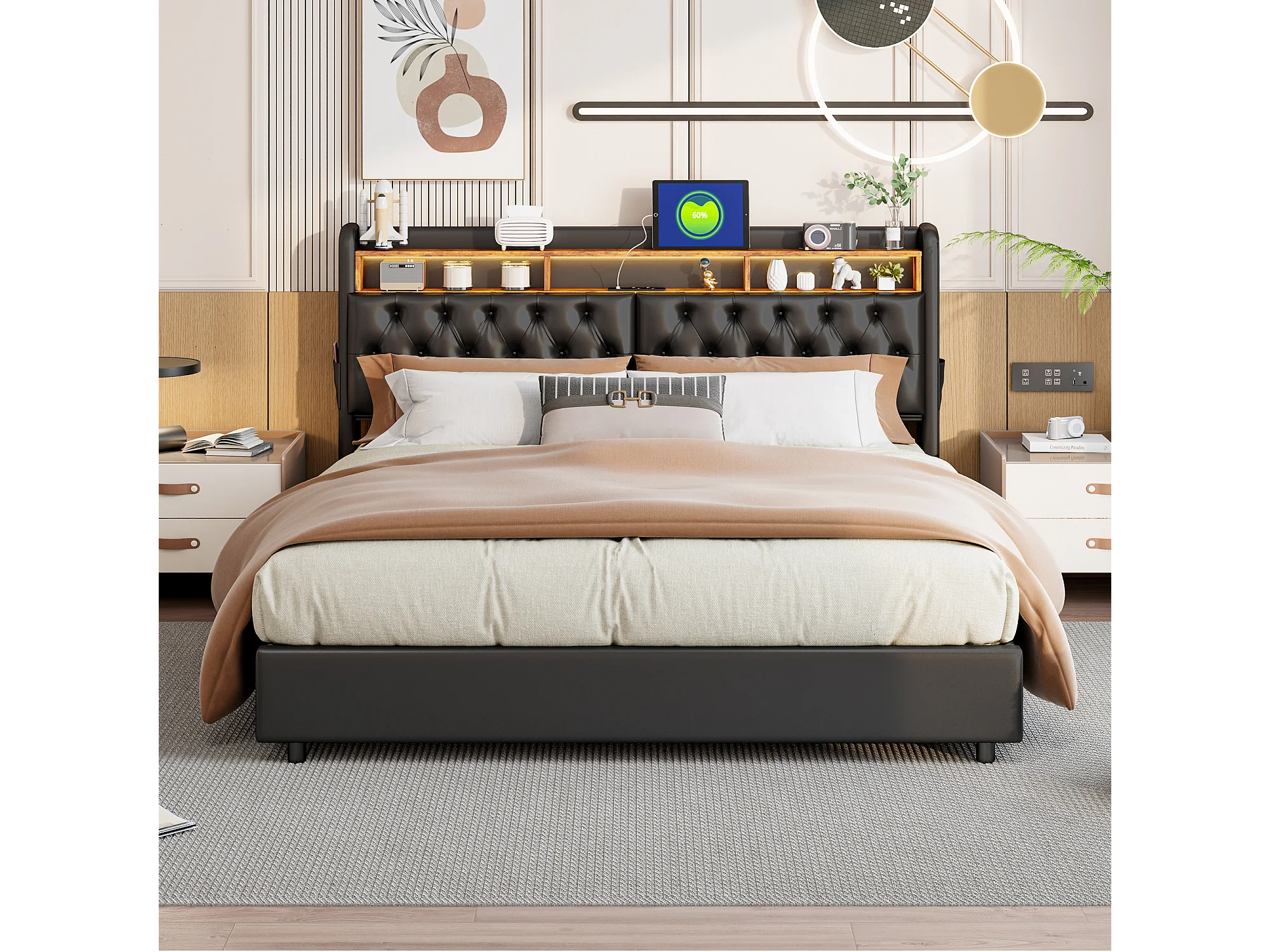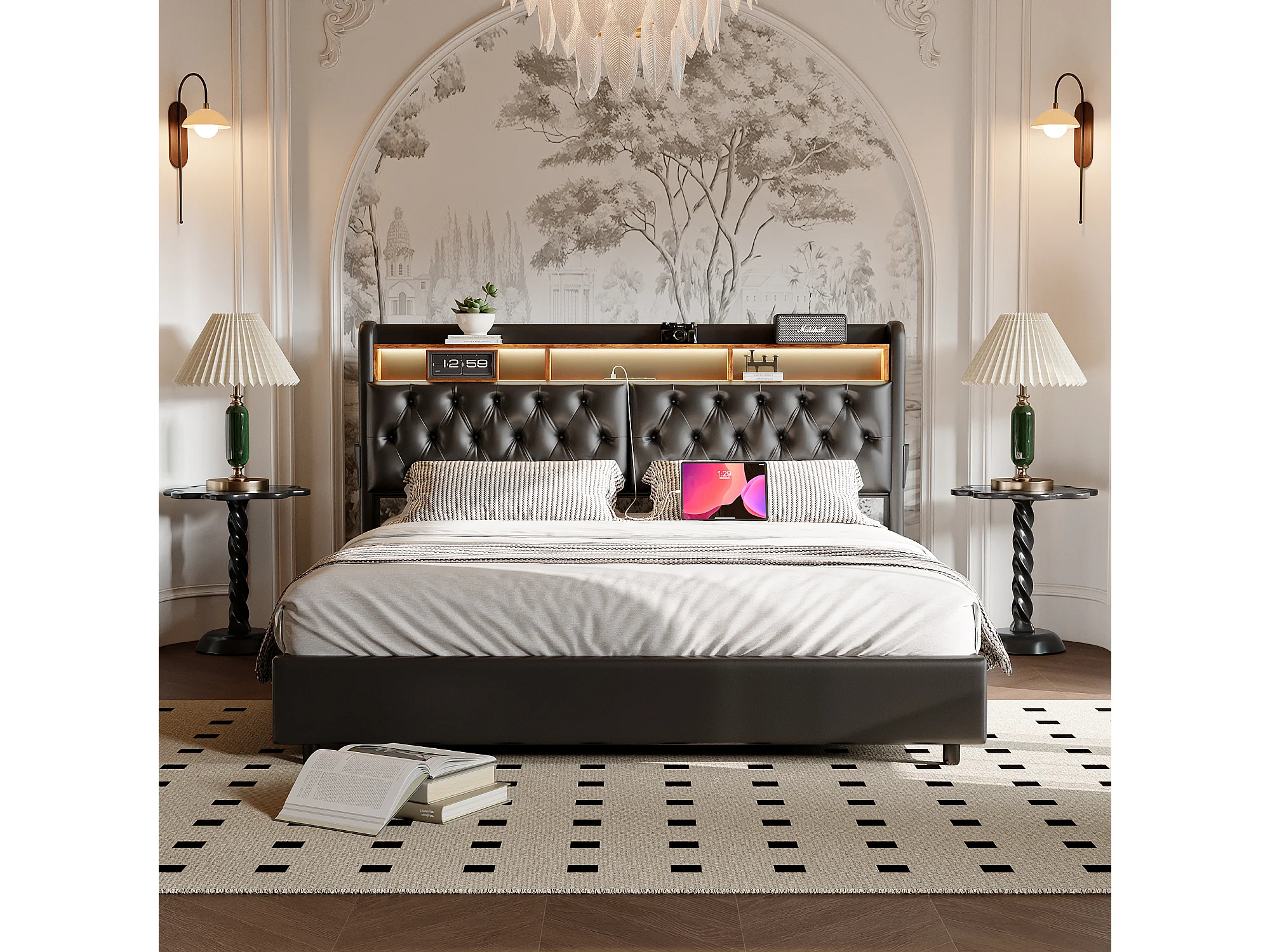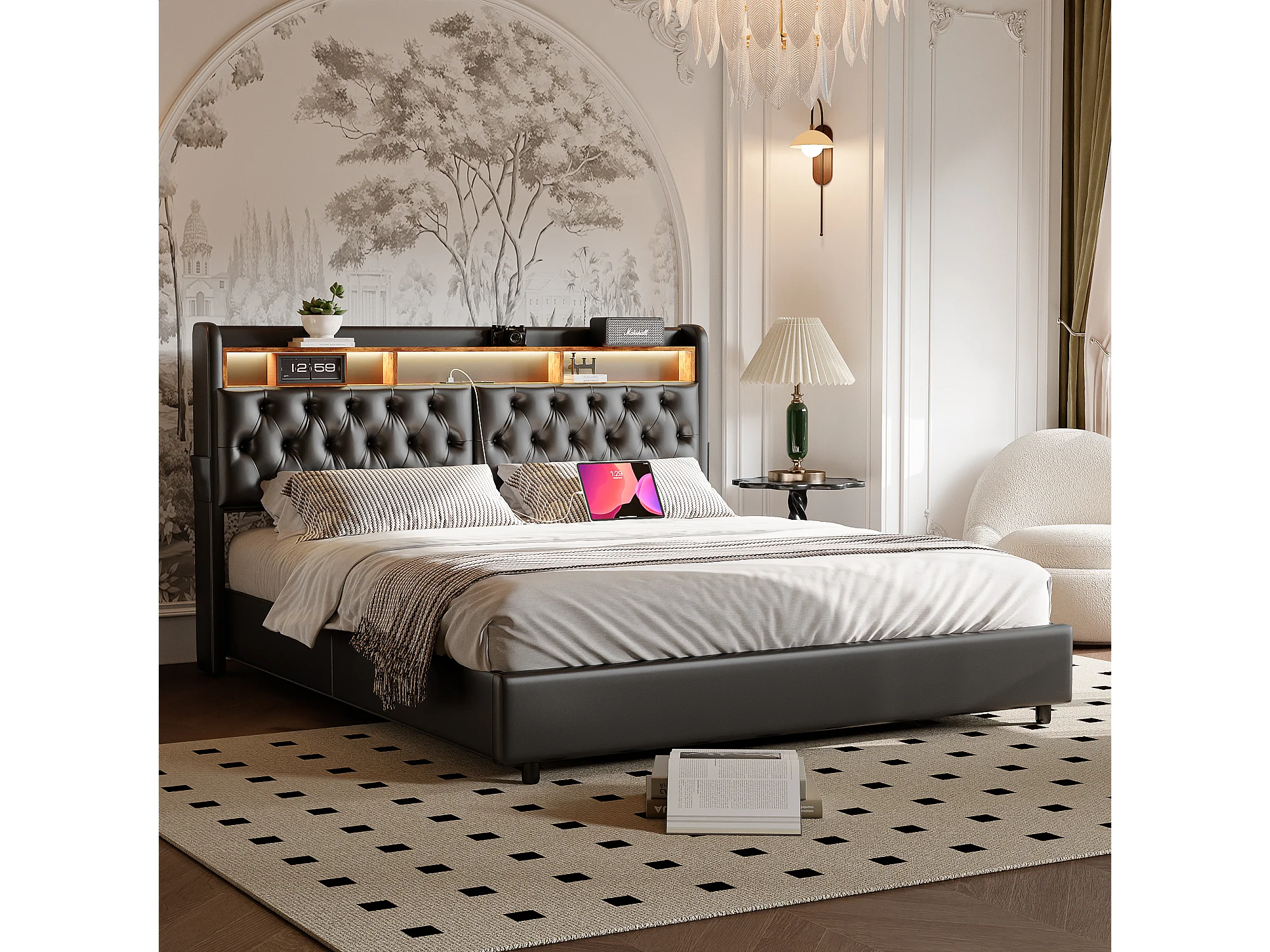 Tweepersoonsbed 180x200 cm in zwart PU met jackbox, LED-hoofdbord, praktische opbergruimte en geïntegreerde EU-USB-poorten