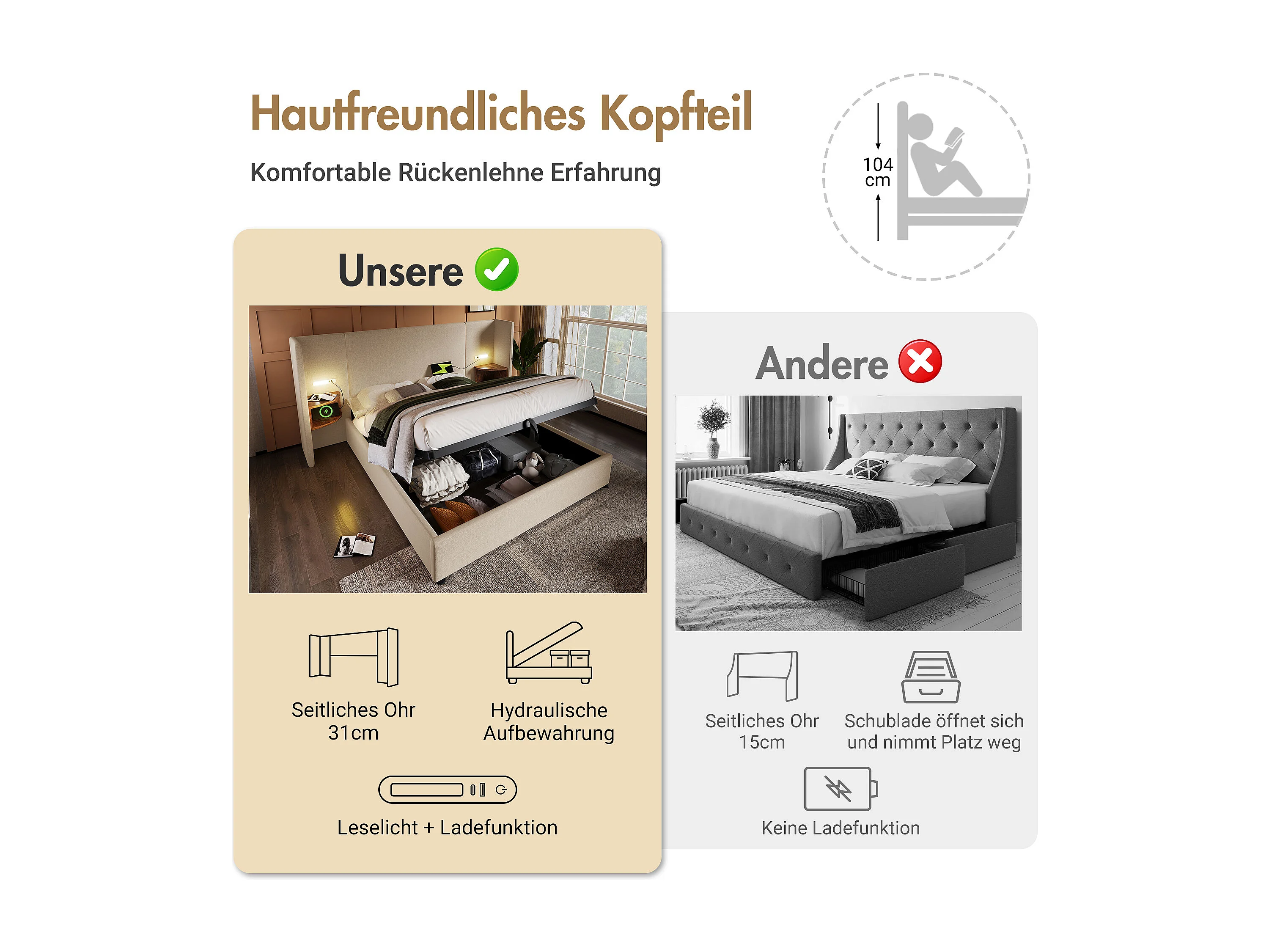 Bed 180×200, bed met opbergruimte, LED en USB-C-lader, PU, beige (268x211x112 cm)
