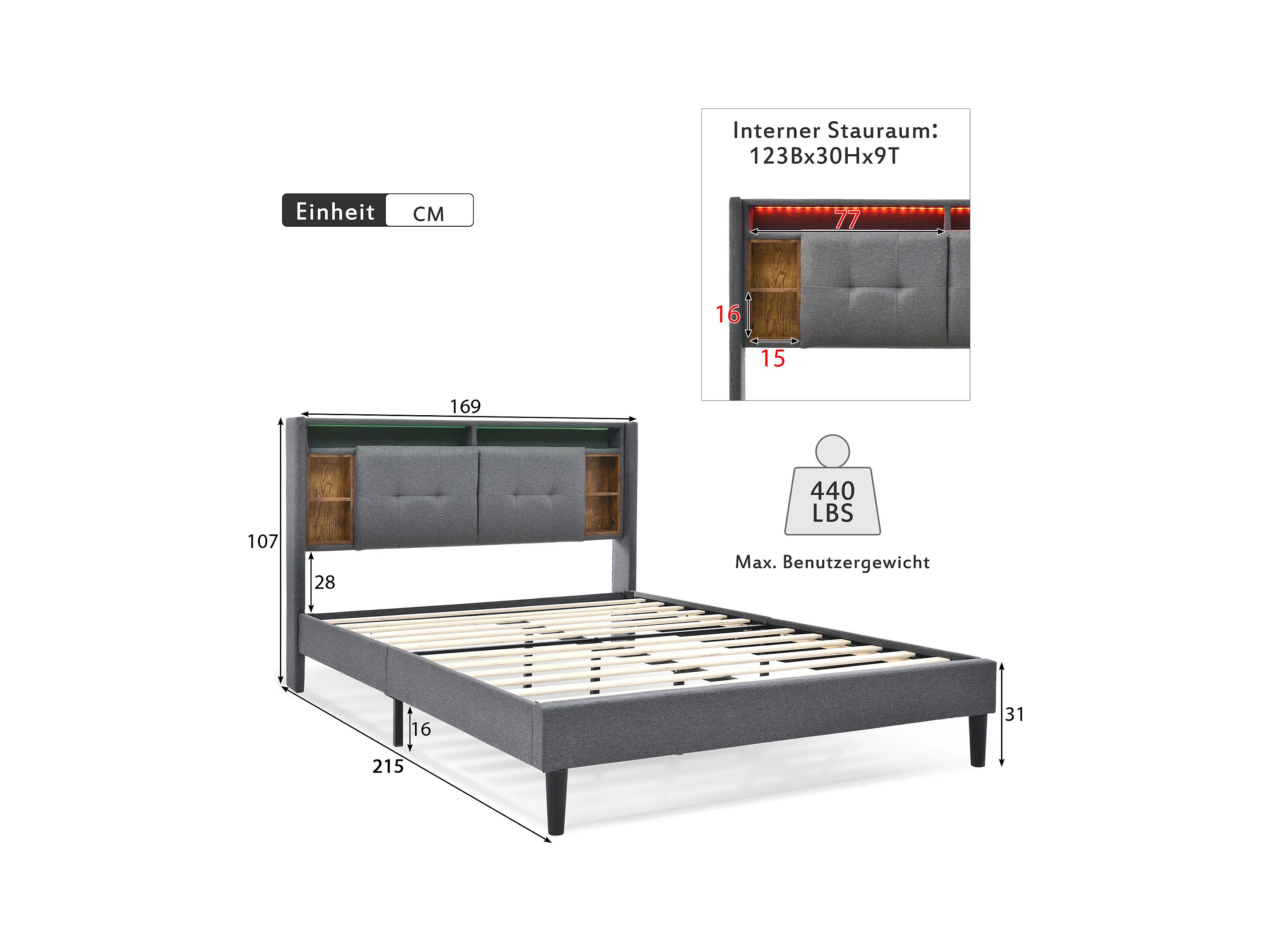 Tweepersoonsbed met opberghoofdeinde, USB-oplader en ledverlichting, massief houten structuur, grijs (160x200 cm) (afmetingen: 215x169x107 cm)