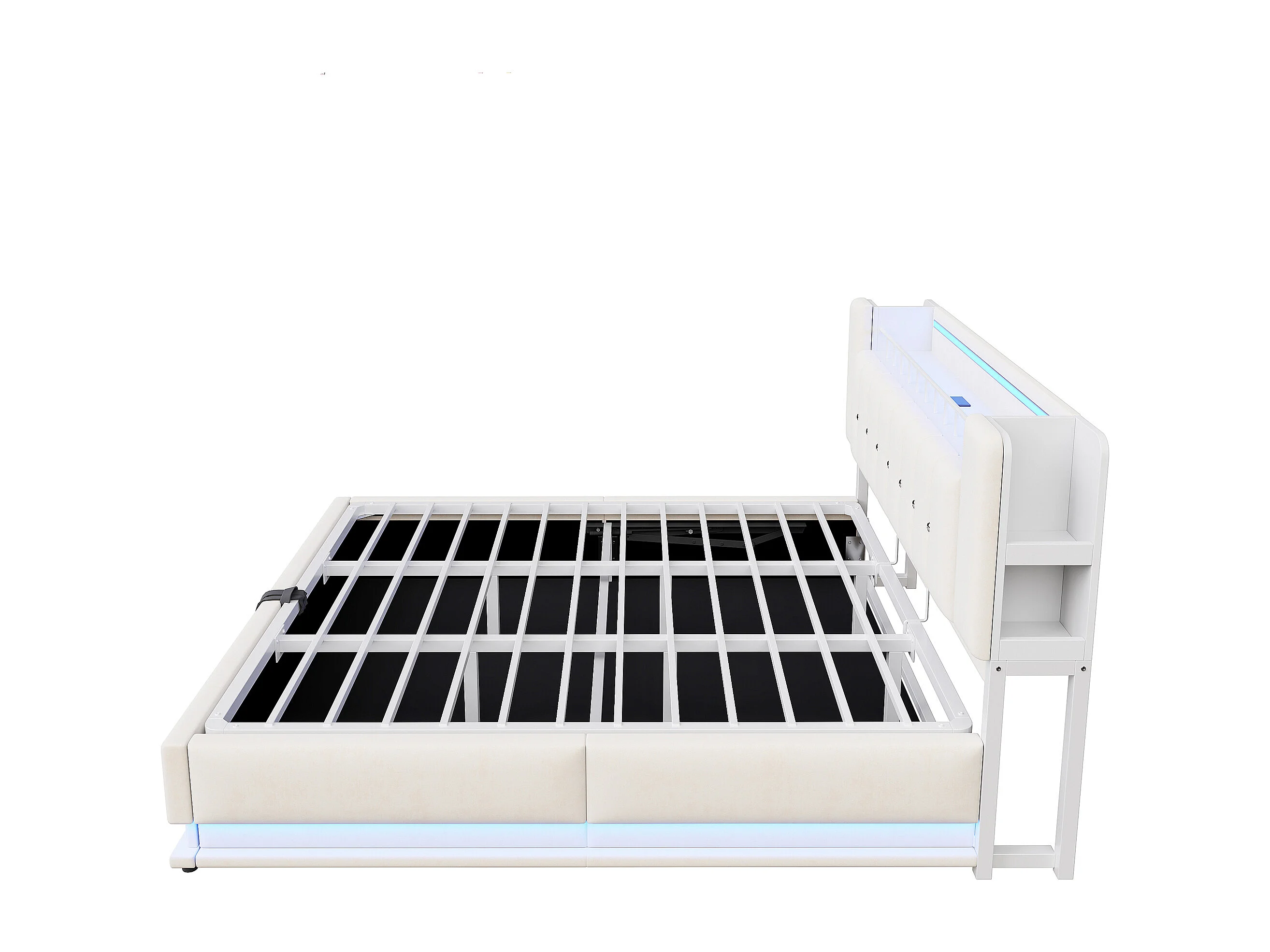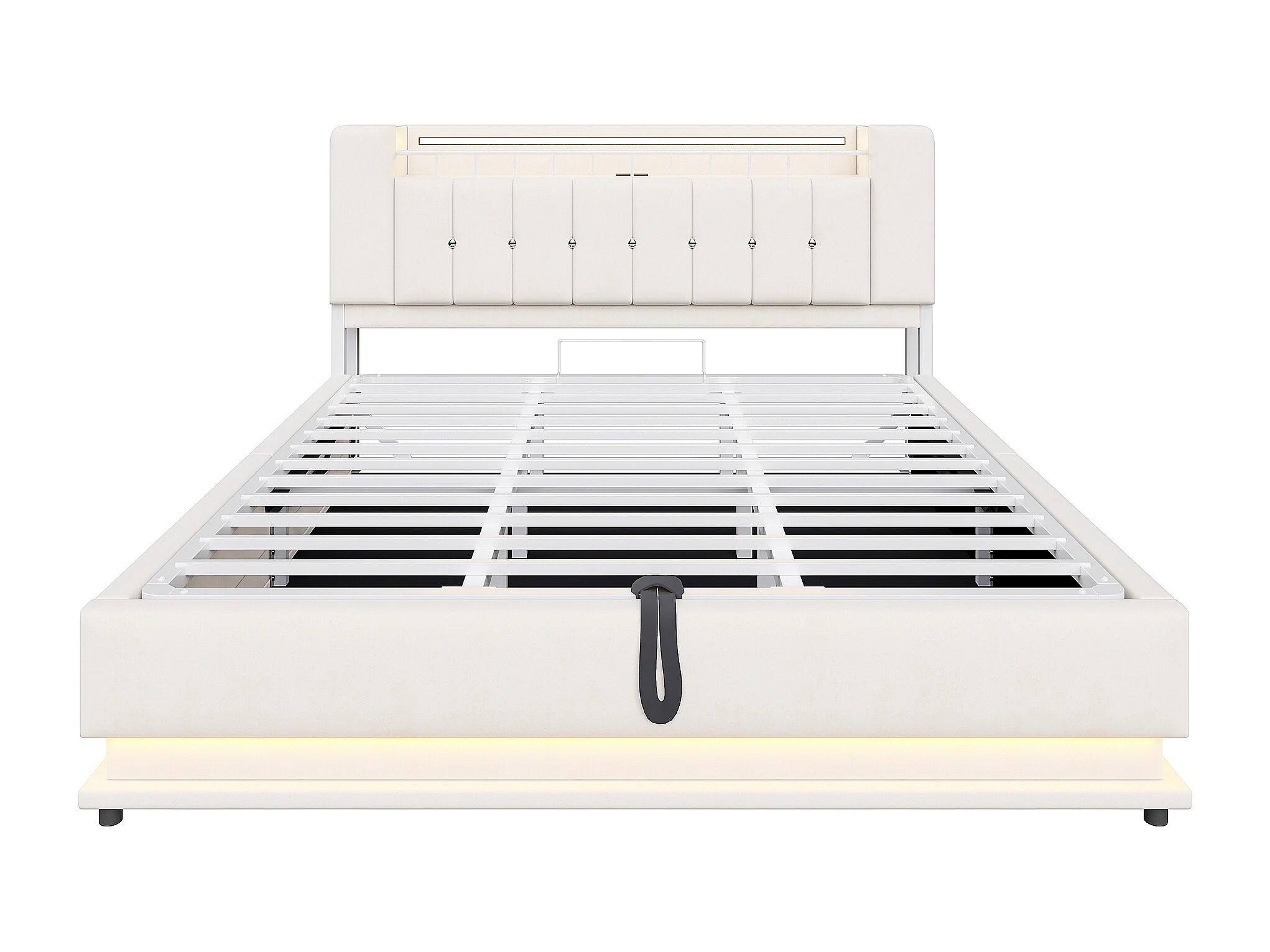 Tweepersoonsbed met opbergruimte 180x200cm met LED-verlichting, USB-aansluiting en opbergruimte in het hoofdeinde - Beige fluweel