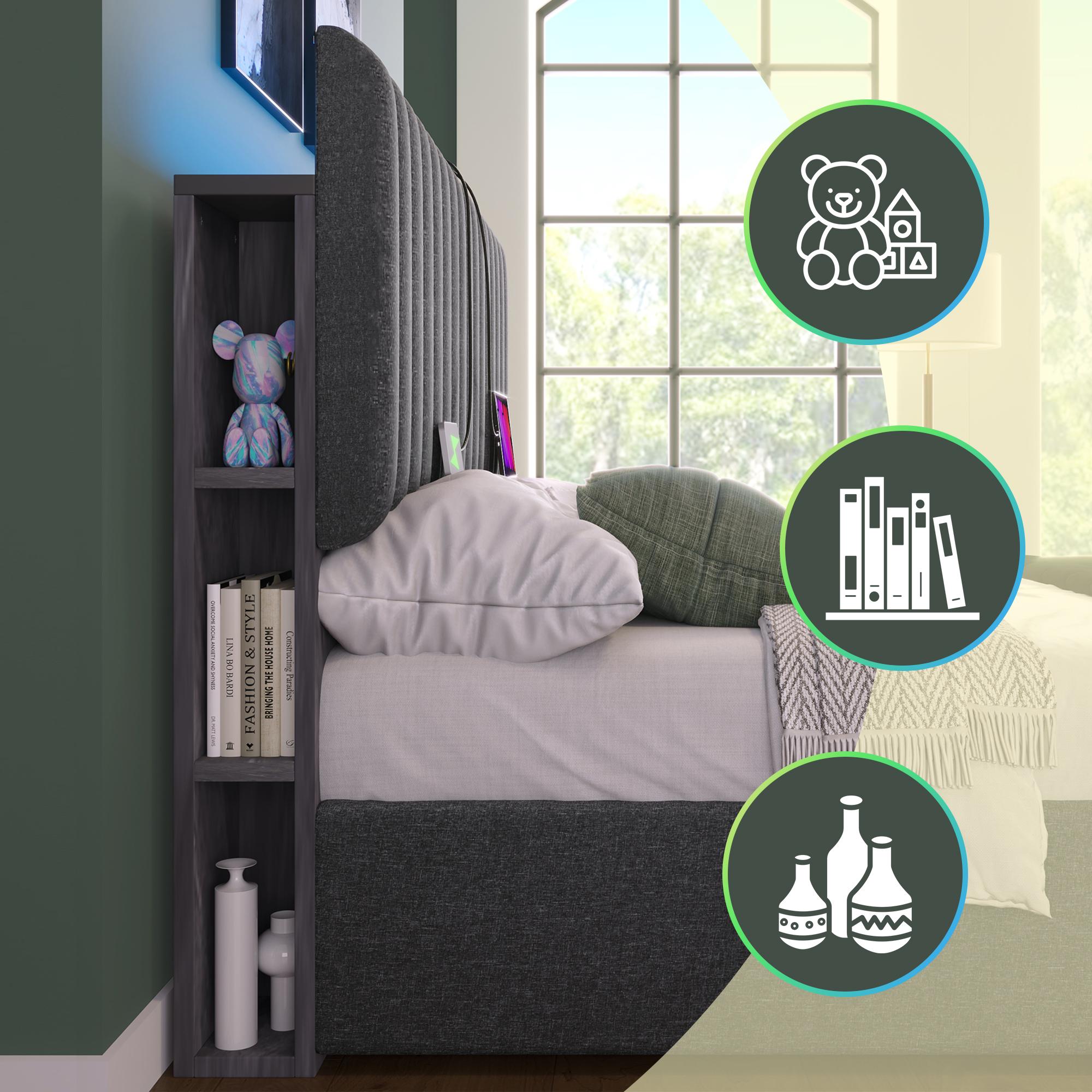 Tweepersoonsbed met USB Type-C, app-gestuurde LED, opbergruimte aan het hoofdeinde, linnen, grijs (141x213x106cm)