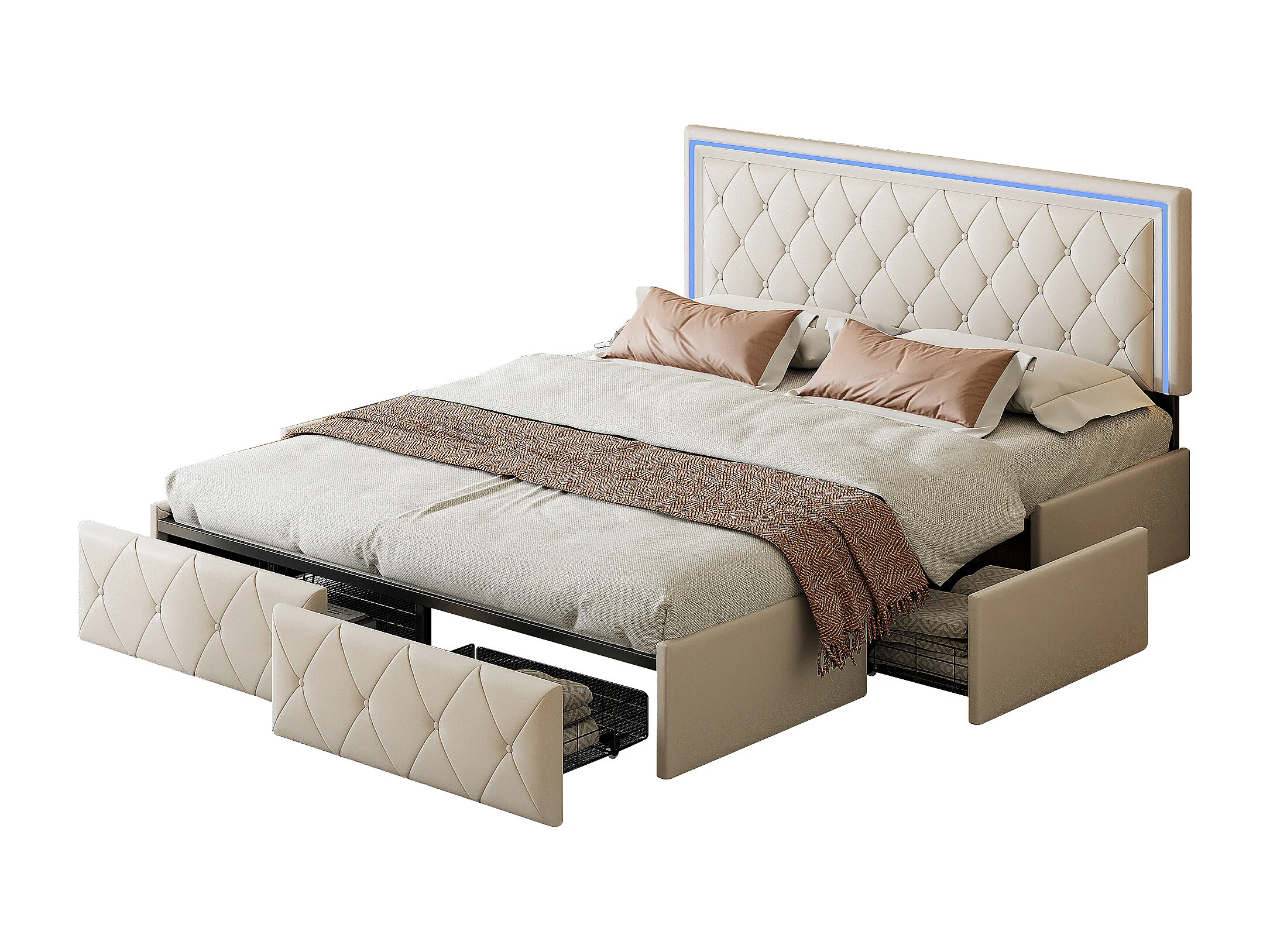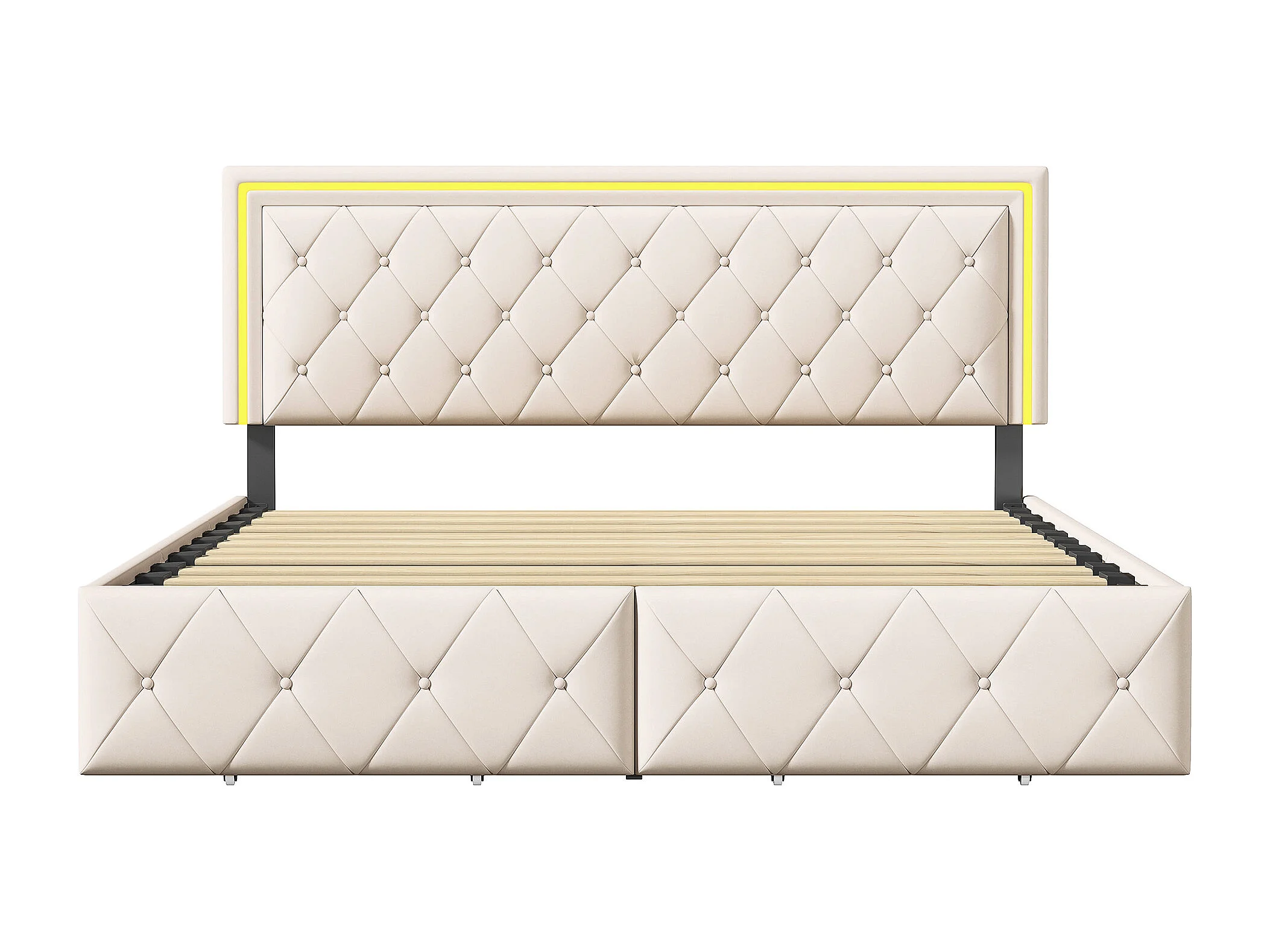 Tweepersoonsbed voor volwassenen 160x200 cm, 4 lades, gestoffeerd met led-verlichting, lattenbodem, wit PU