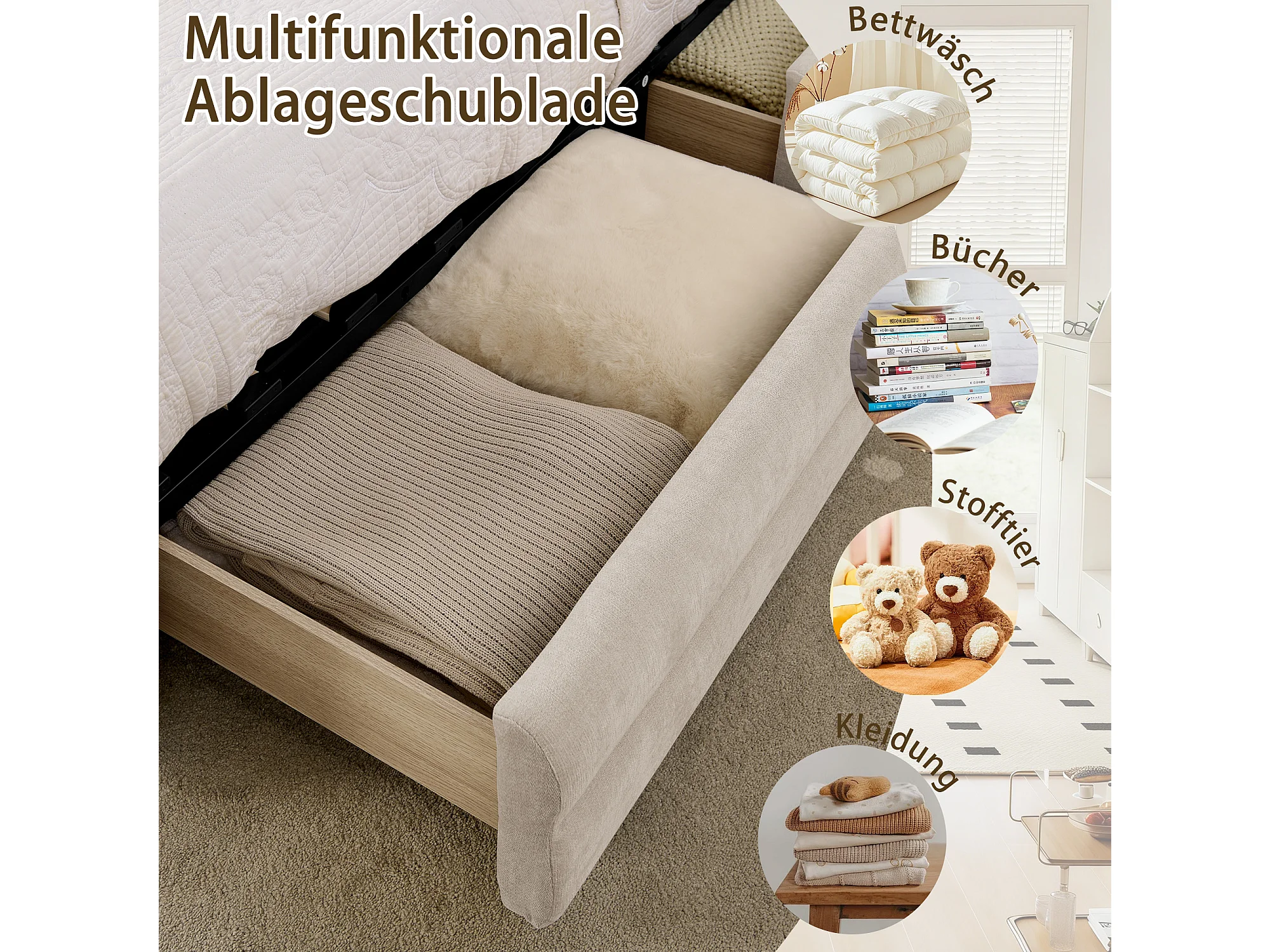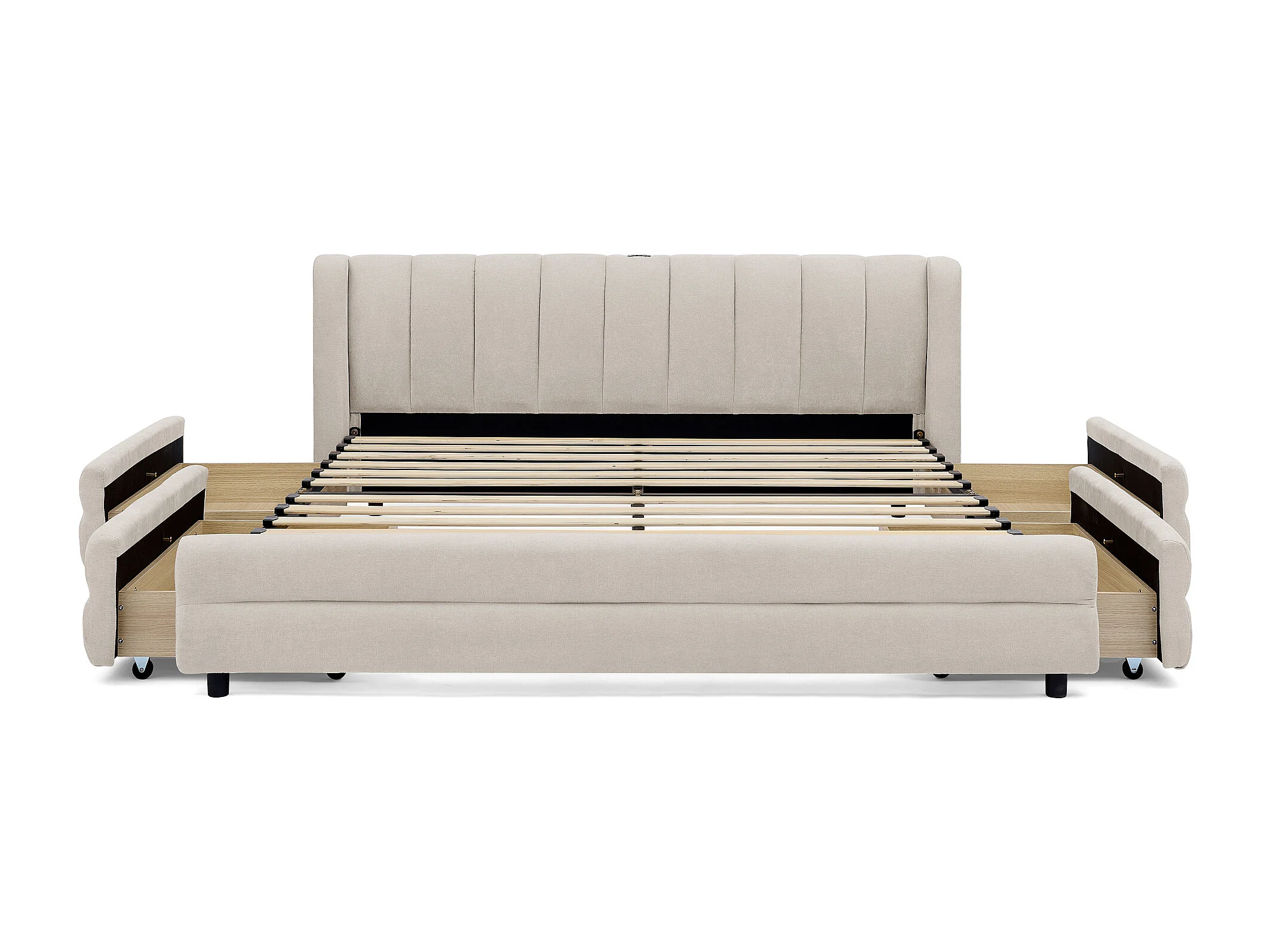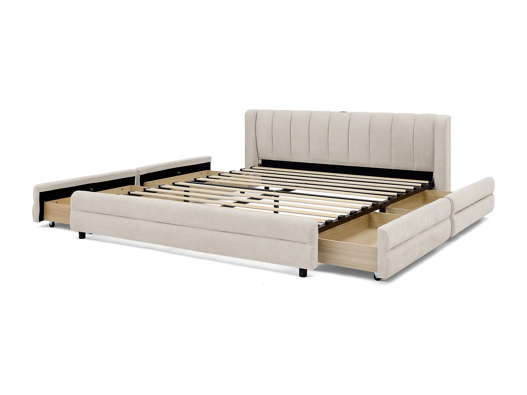 Tweepersoonsbed voor volwassenen 160x200 cm met USB-aansluiting en 4 lades - Beige chenille stof (matras niet inbegrepen)
