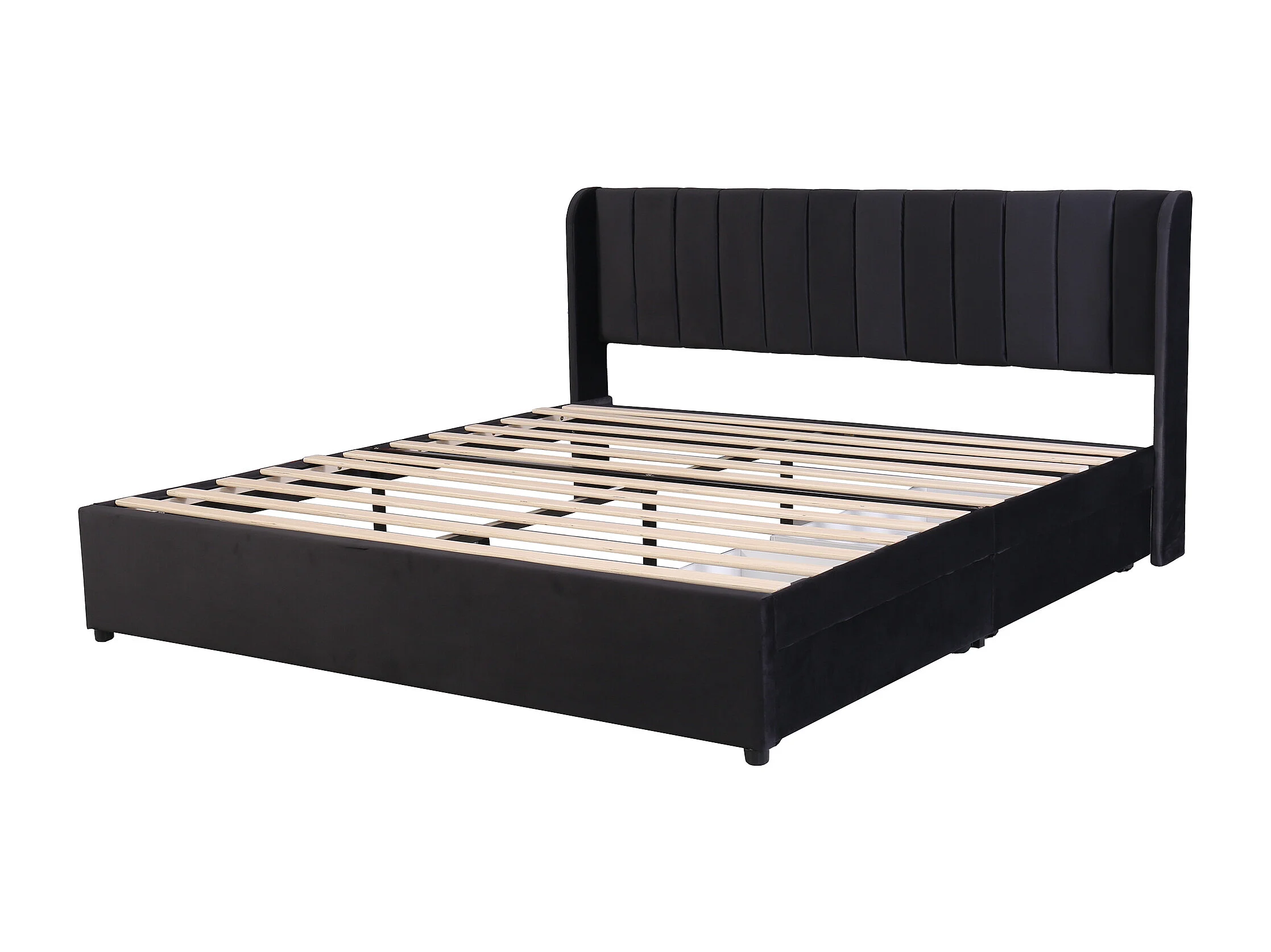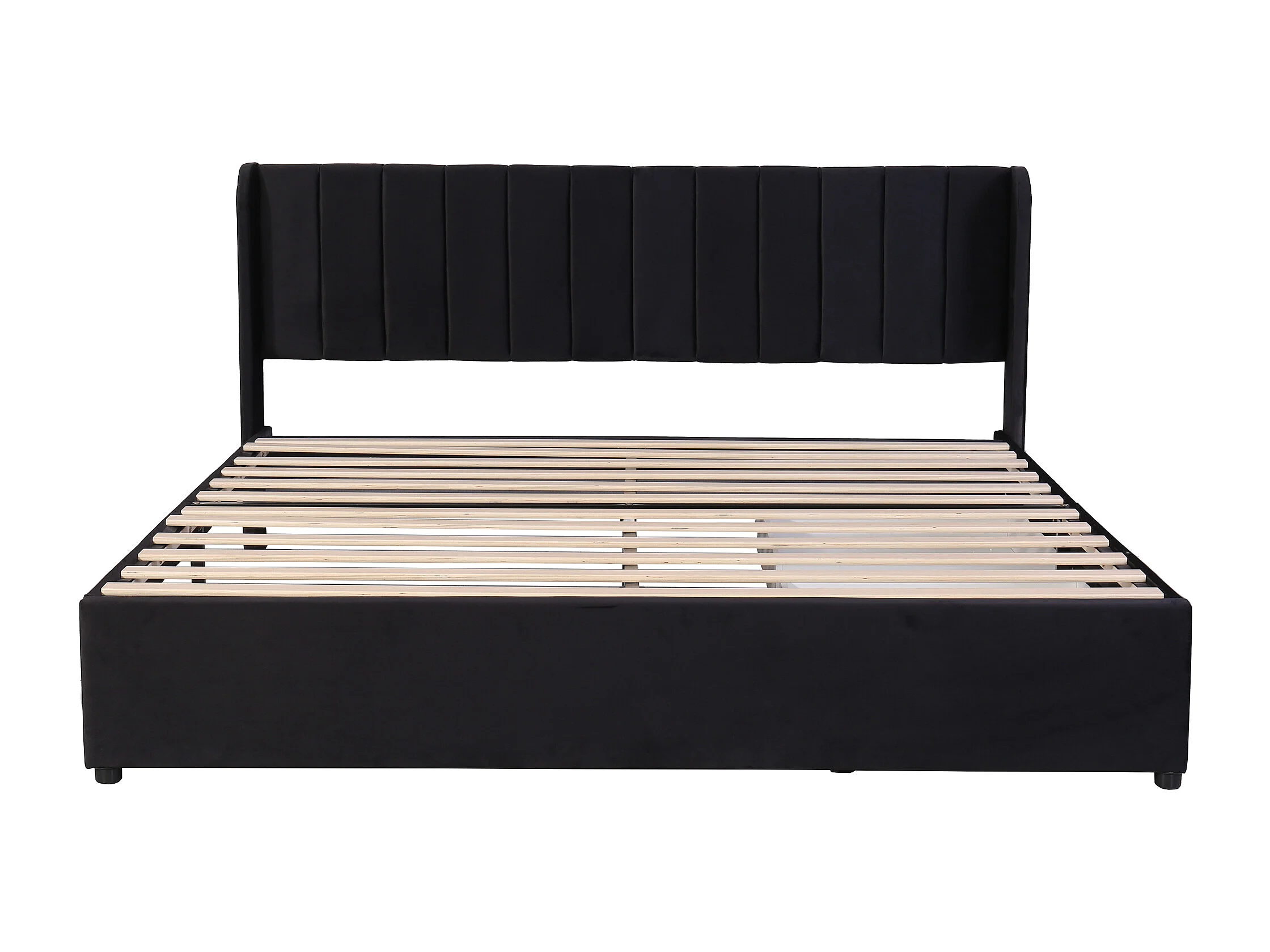 Tweepersoonsbed voor volwassenen 180x200 cm met lattenbodem en 2 opberglades - gewatteerd hoofdeinde - fluweel - zwart (zonder matras)