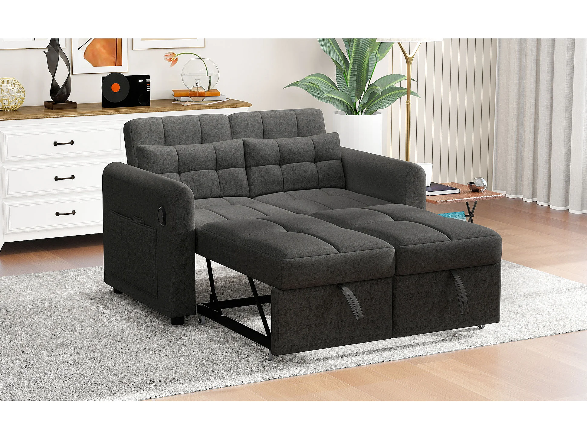 Tweezits slaapbank met USB-aansluiting en kussens - Verstelbare rugleuning - Stof van katoen en linnen - Grijs