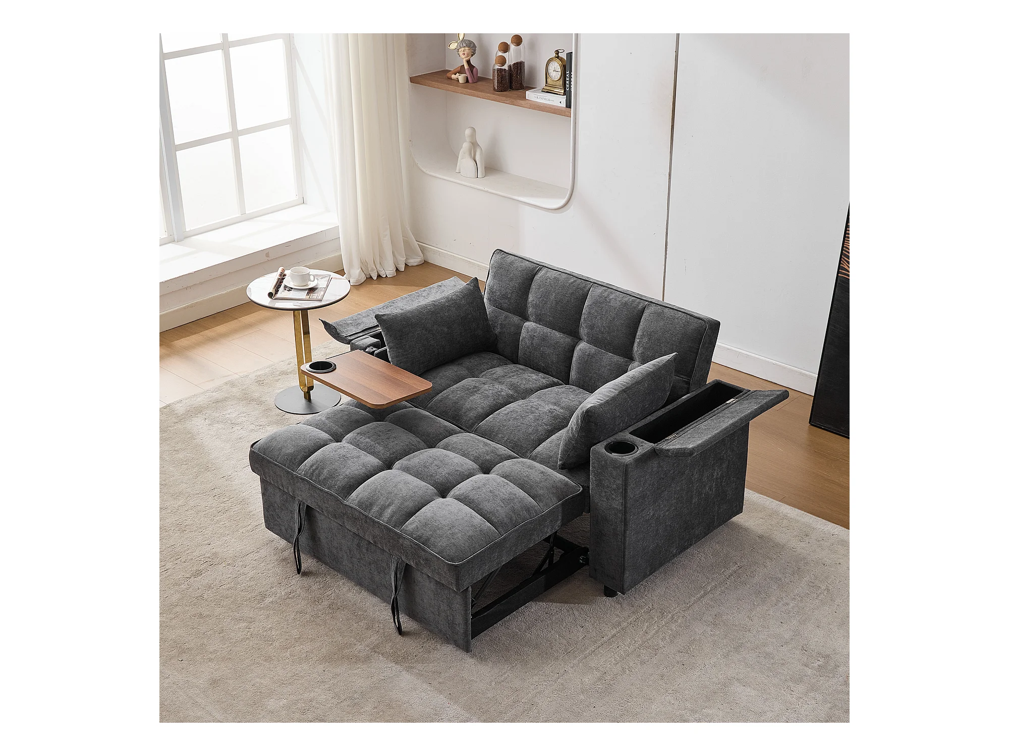 Uitklapbare 2-persoonsbank 140.5x74x82 cm - Verstelbare rugleuning - USB-poort - Drankhouder - Bijzettafeltje - Grijs