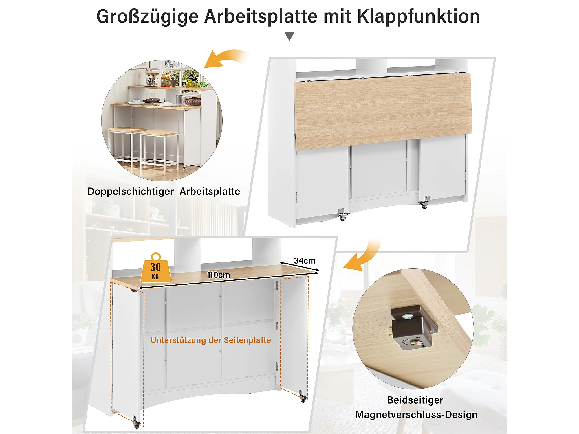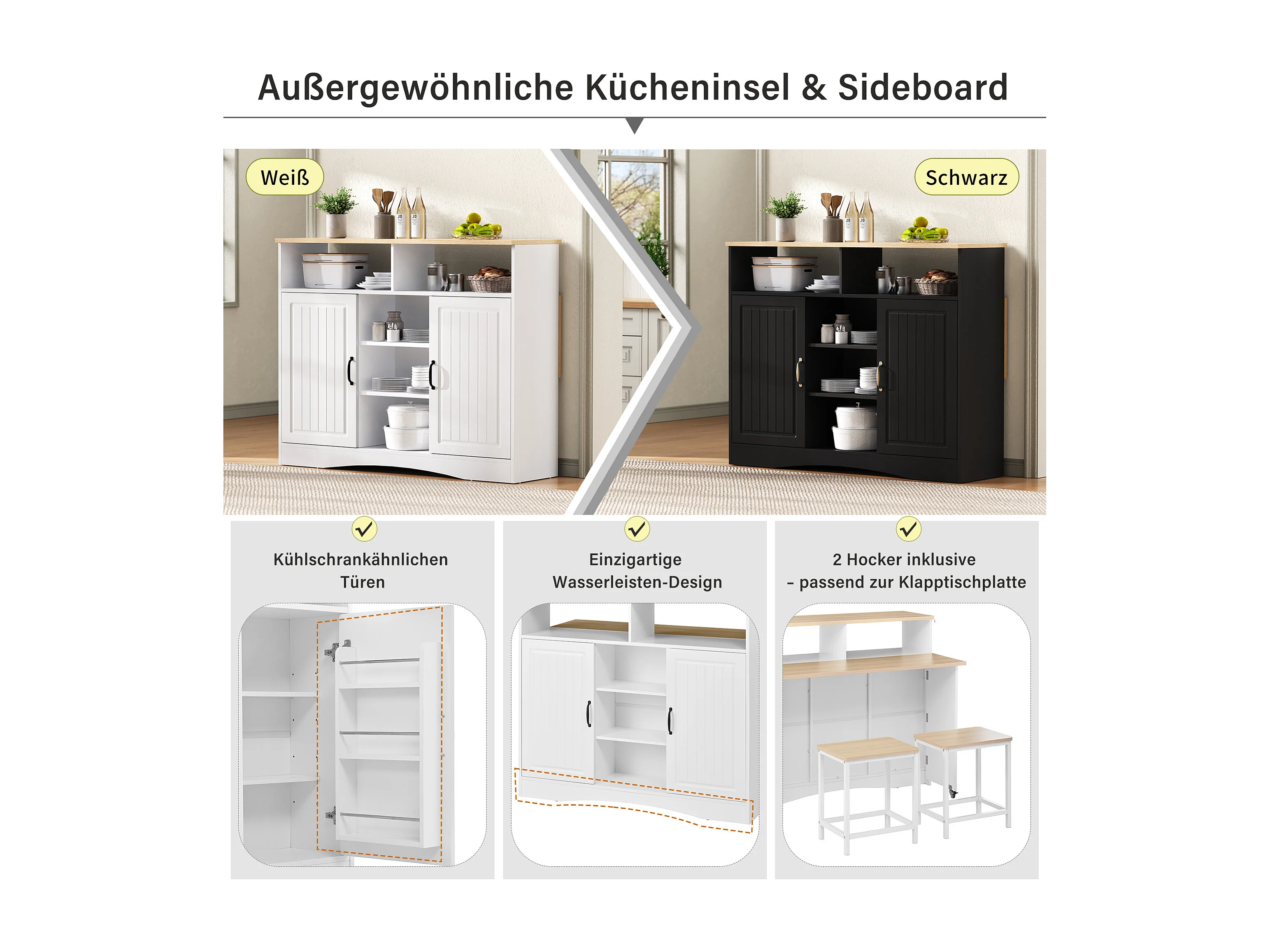 Uitschuifbaar keukeneiland op wielen - 110 x 34 x 97,5 cm - met opbergruimte + 2 krukken - MDF - wit