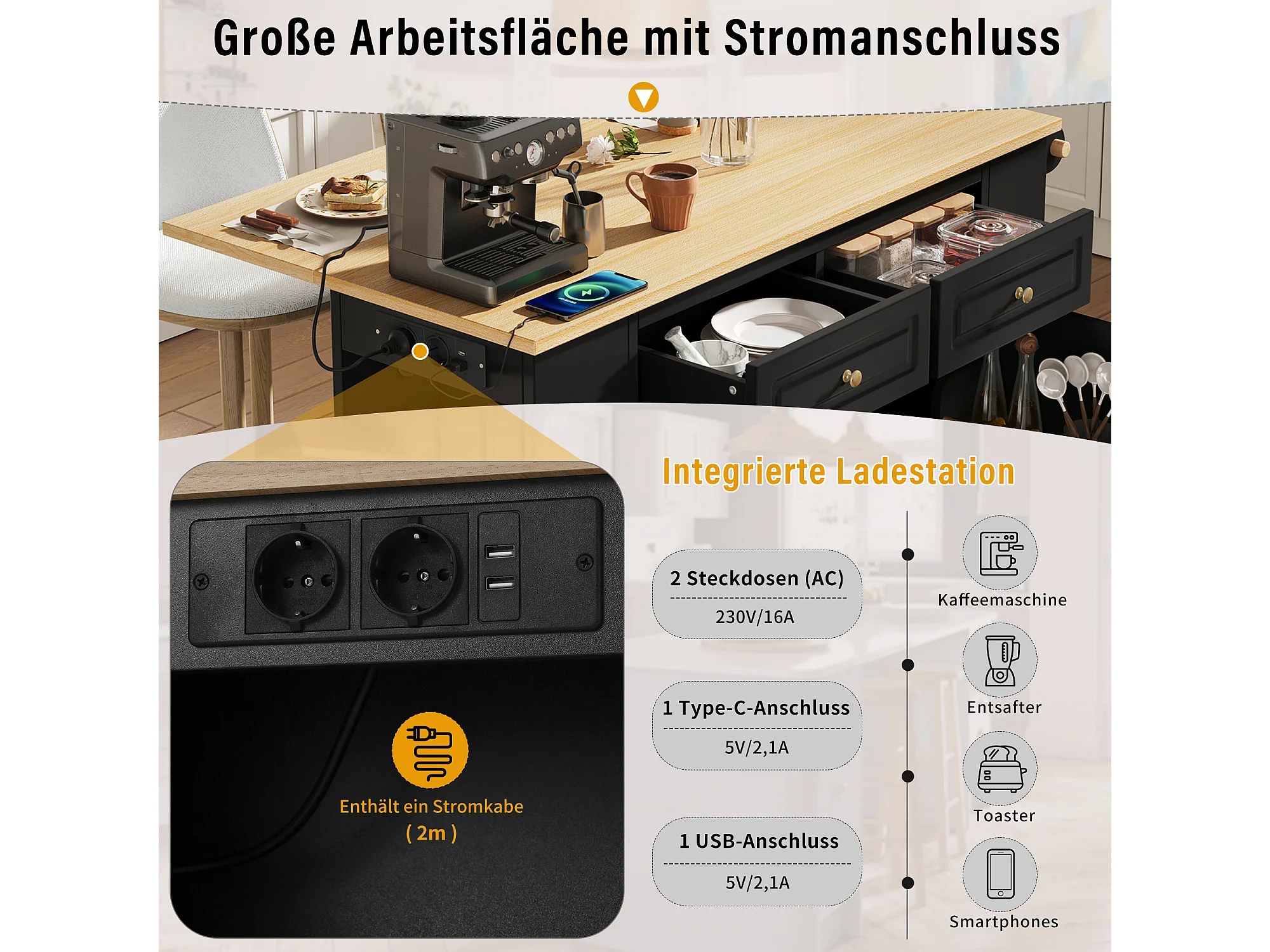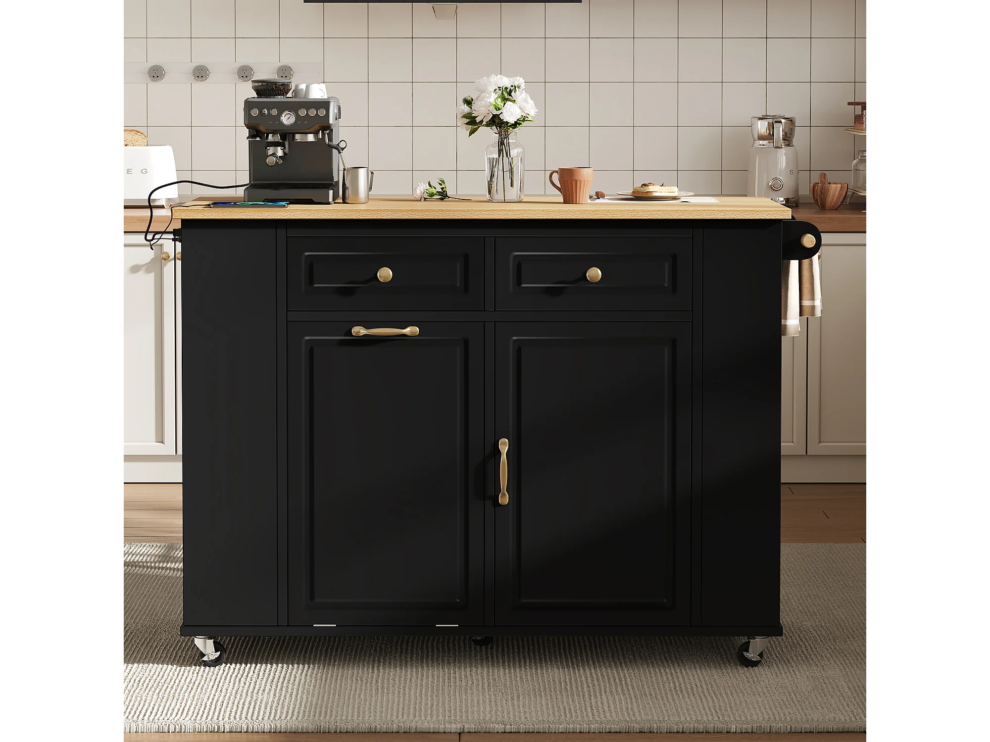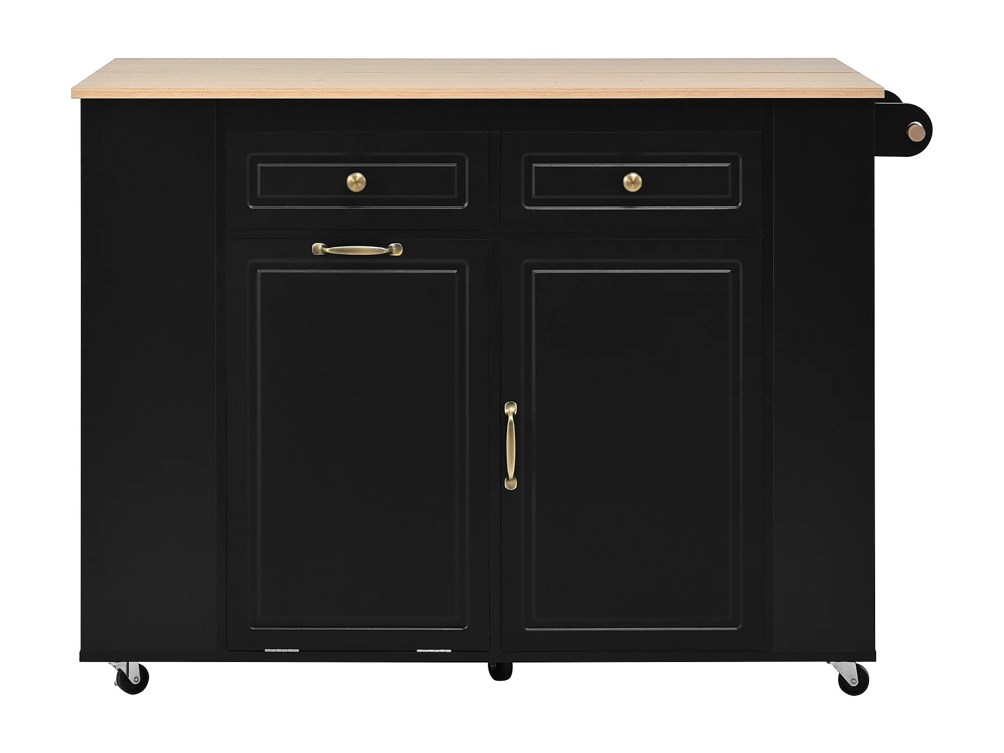Uitschuifbaar keukeneiland op wielen - 120 x 40/70 x 91,5 cm - met 2 lades + deuren - MDF - zwart + naturel