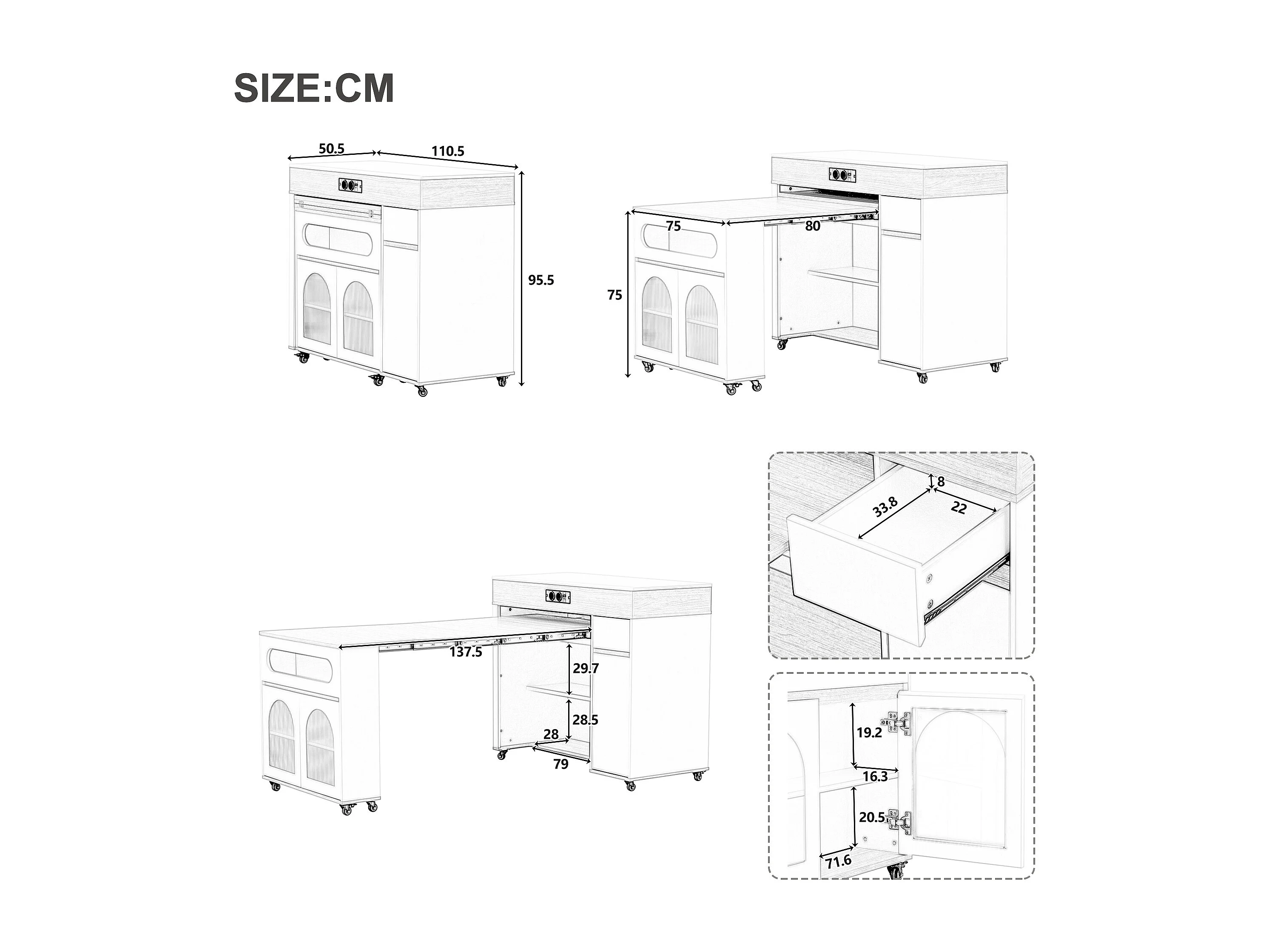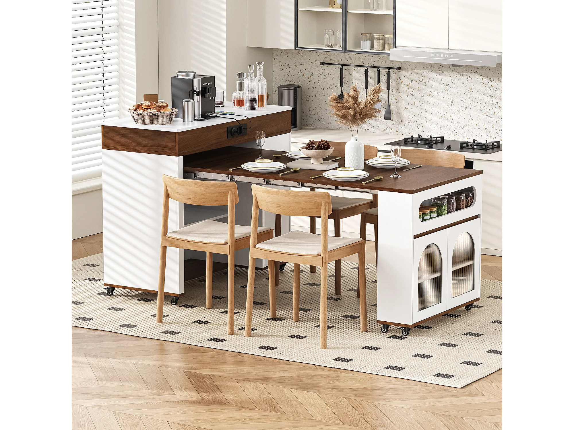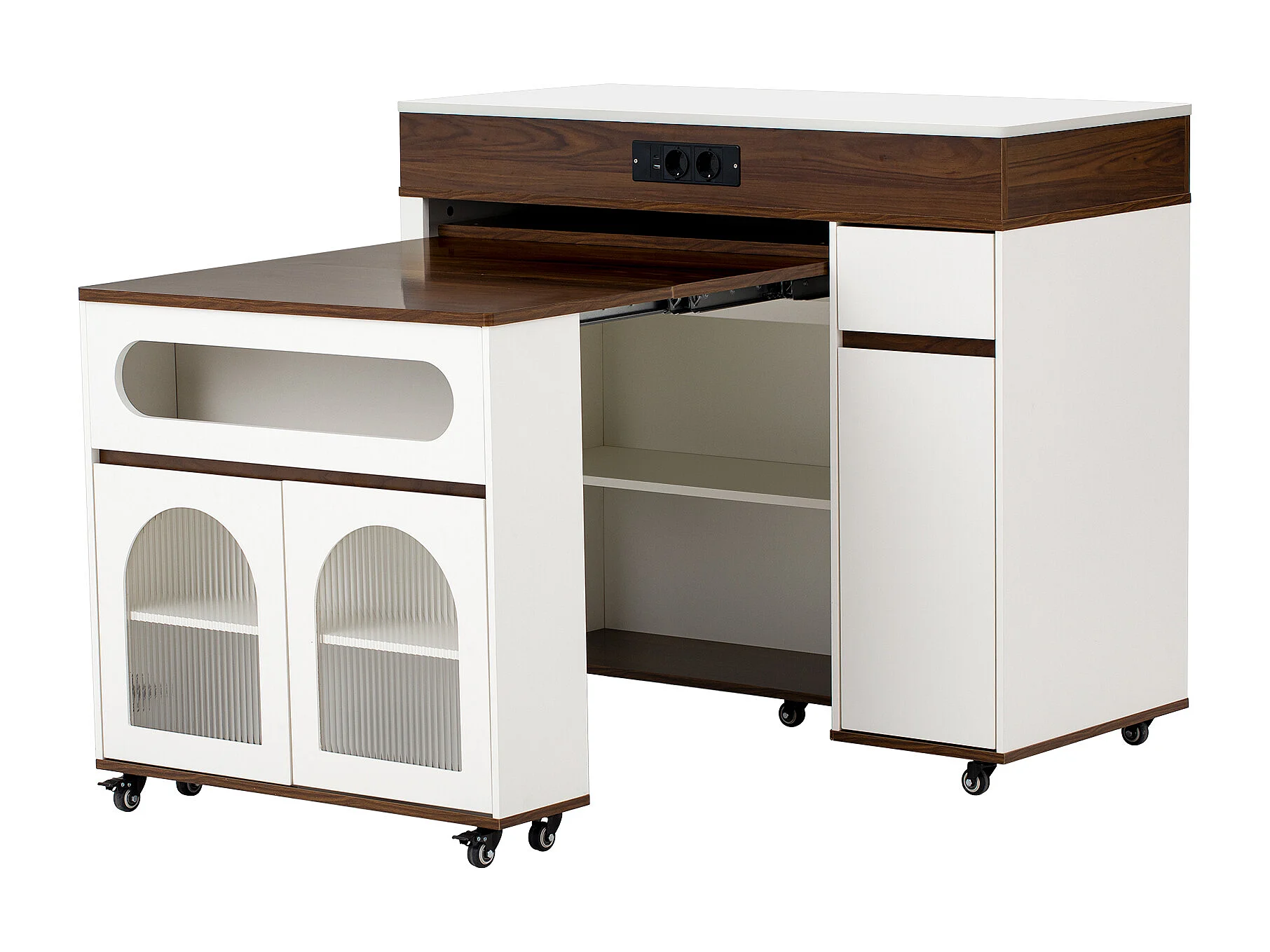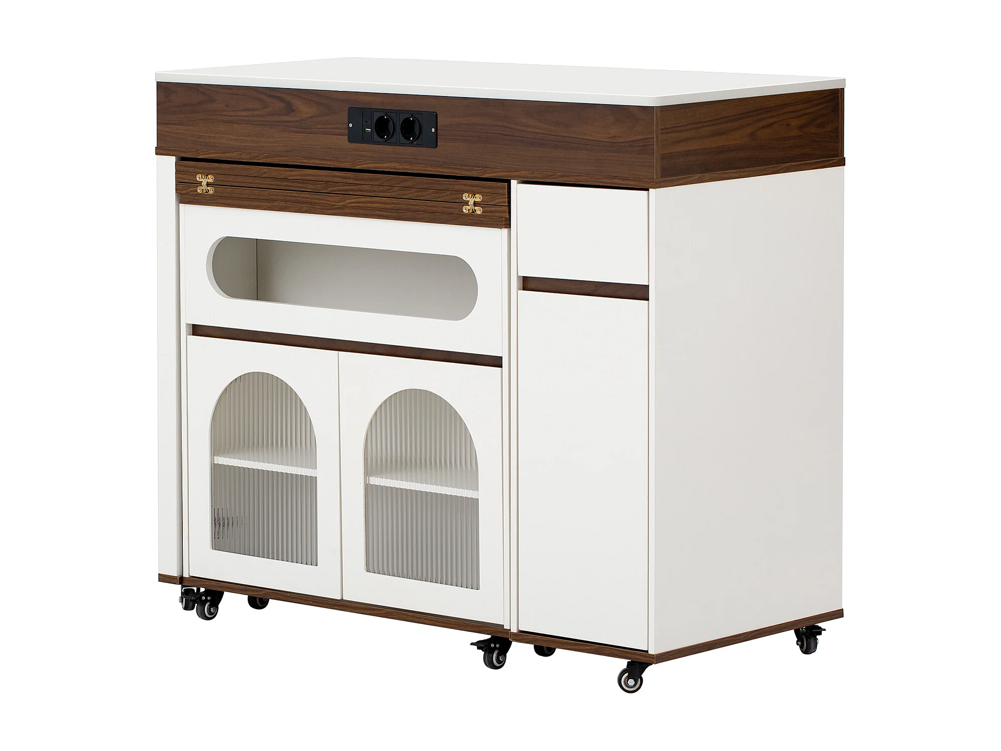 Uitschuifbaar keukeneiland op wielen met glazen blad - 110,5 x 50,5 x 95,5 cm - met deur en lade - MDF + glas - wit + bruin