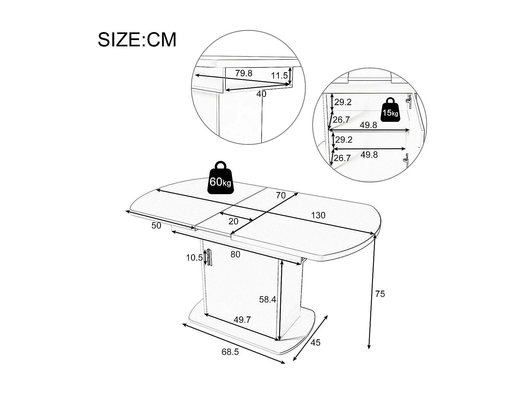 Uitschuifbare ovale eettafel (110/130x70x75cm) - Wit/Zilveren handvat