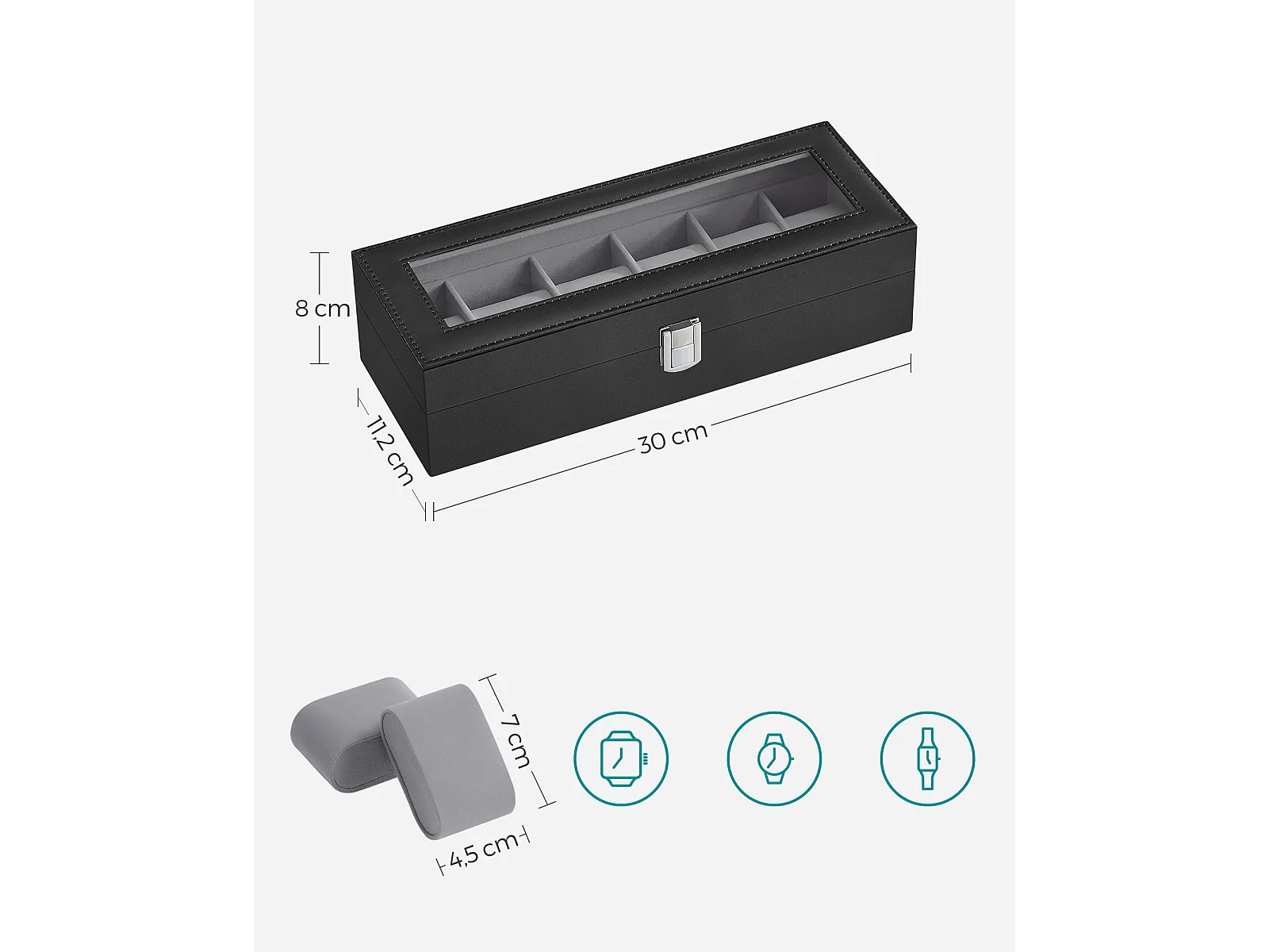 Valora Zwarte Horlogekast met 6 Gleuven en Glazen Deksel - opbergruimte