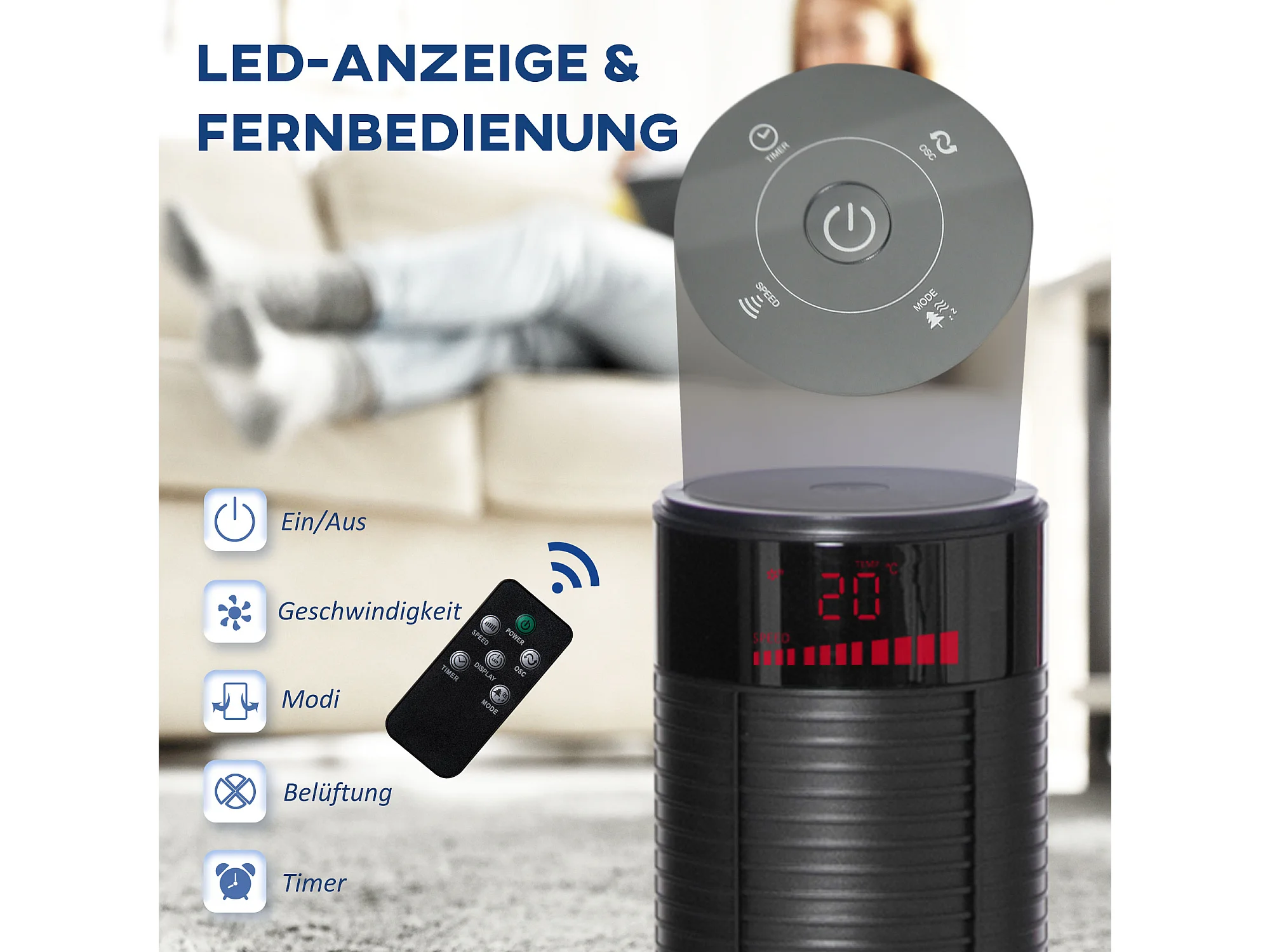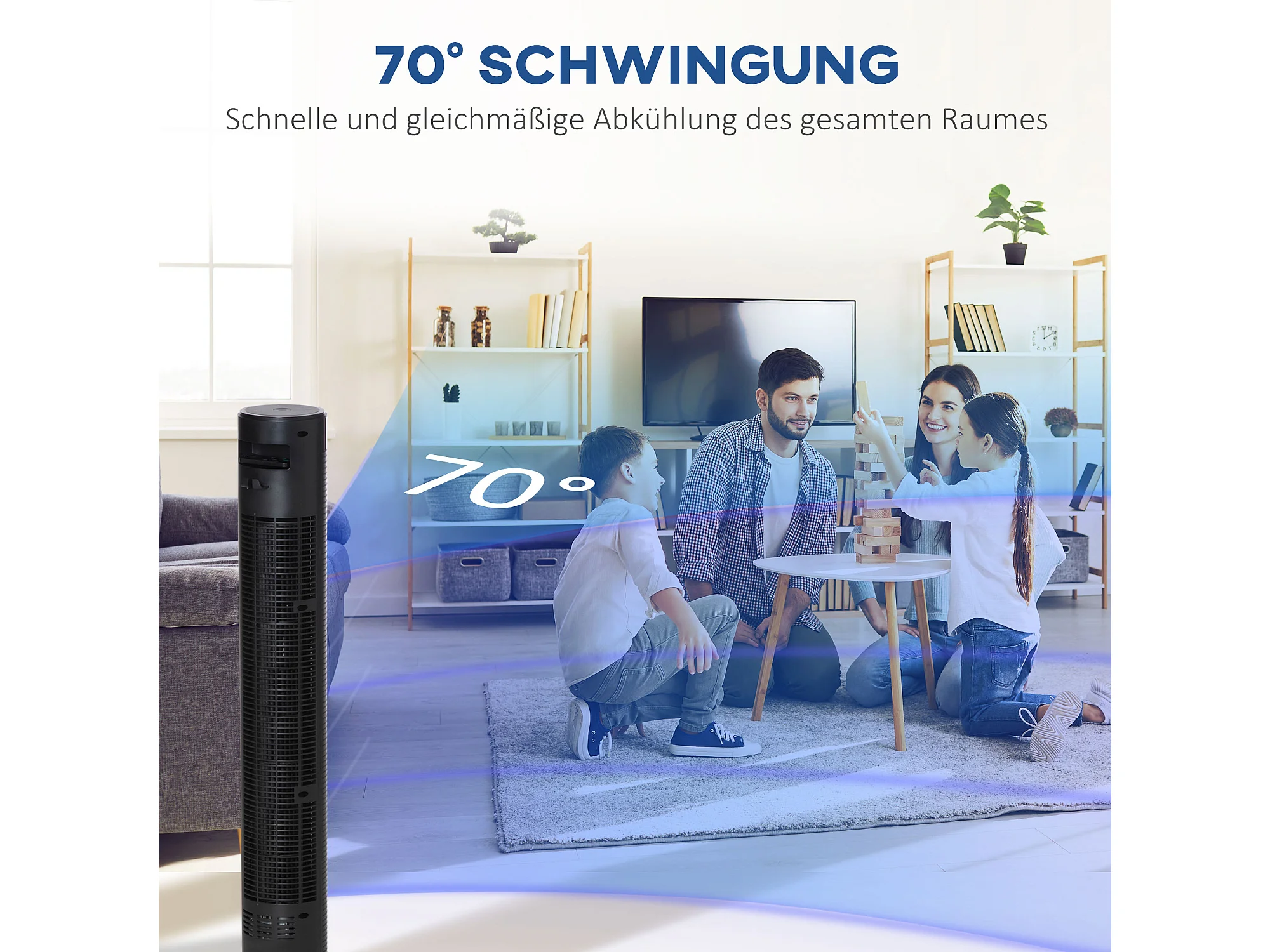Ventilateur sur pied 3 snelheden, oscillatie 70°, 12H minuterie, 4 modi, télécommande, acier, zwart (31,5x31,5x117cm)