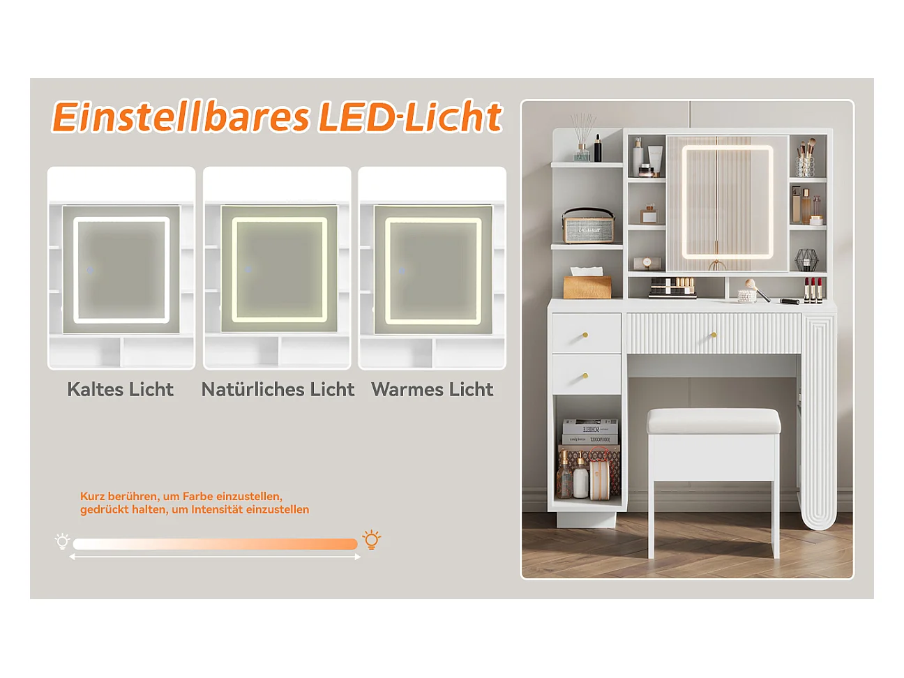 Kaptafel met LED-spiegel en 3 kleuren, uitschuifbare tafel, hout, wit (100x40x76 cm)