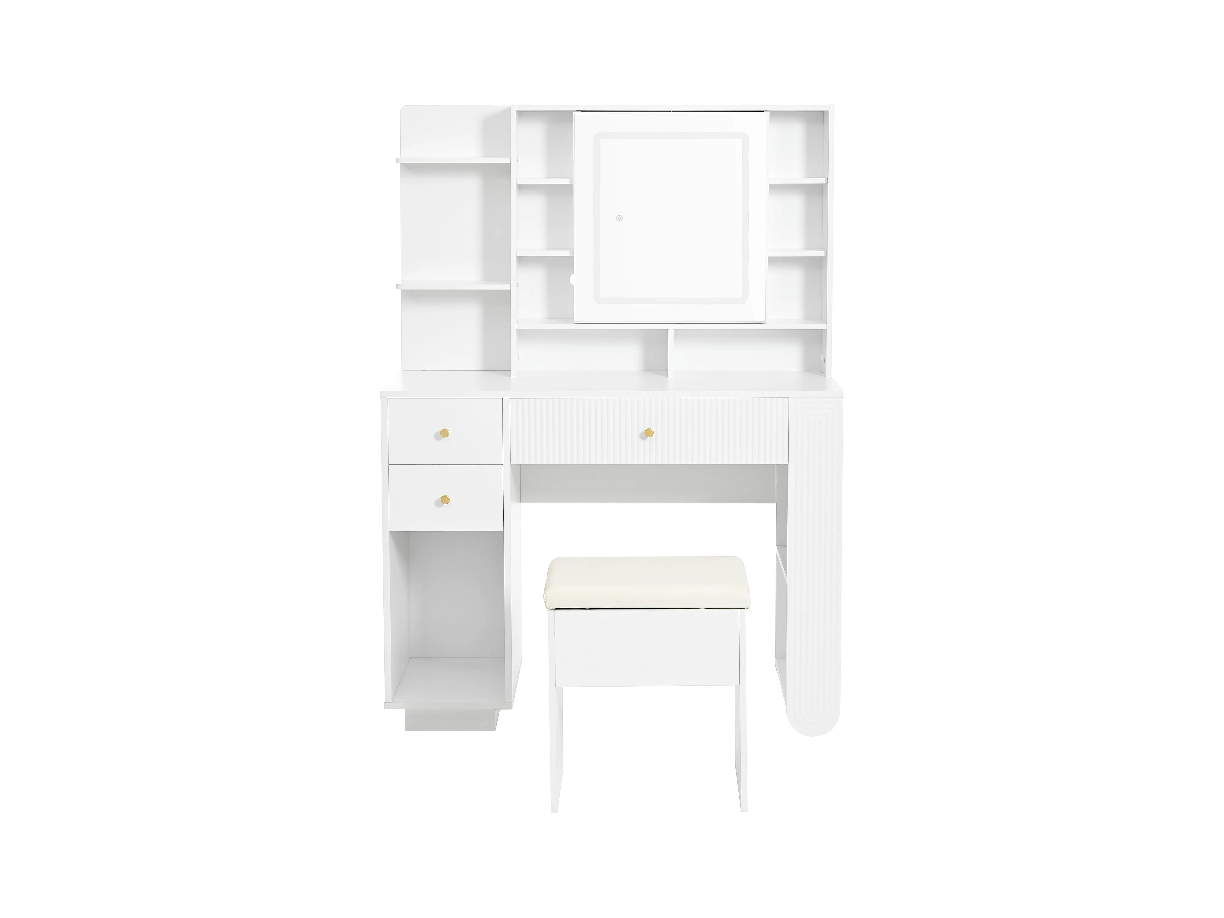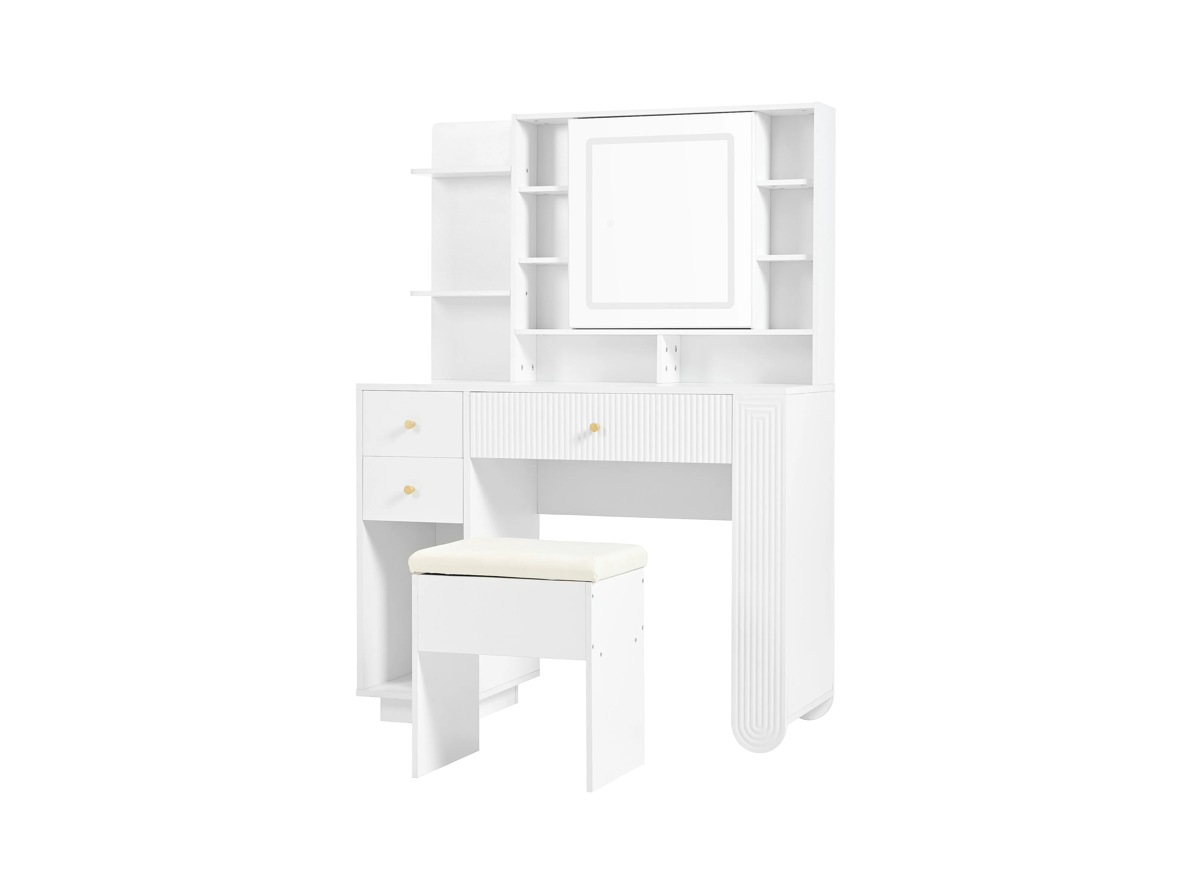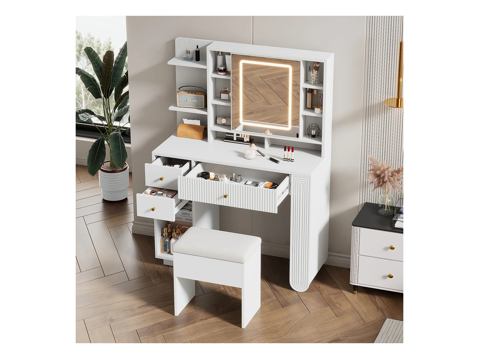 Verlichte kaptafel met spiegel en kruk - Kaptafel met lades en open plank