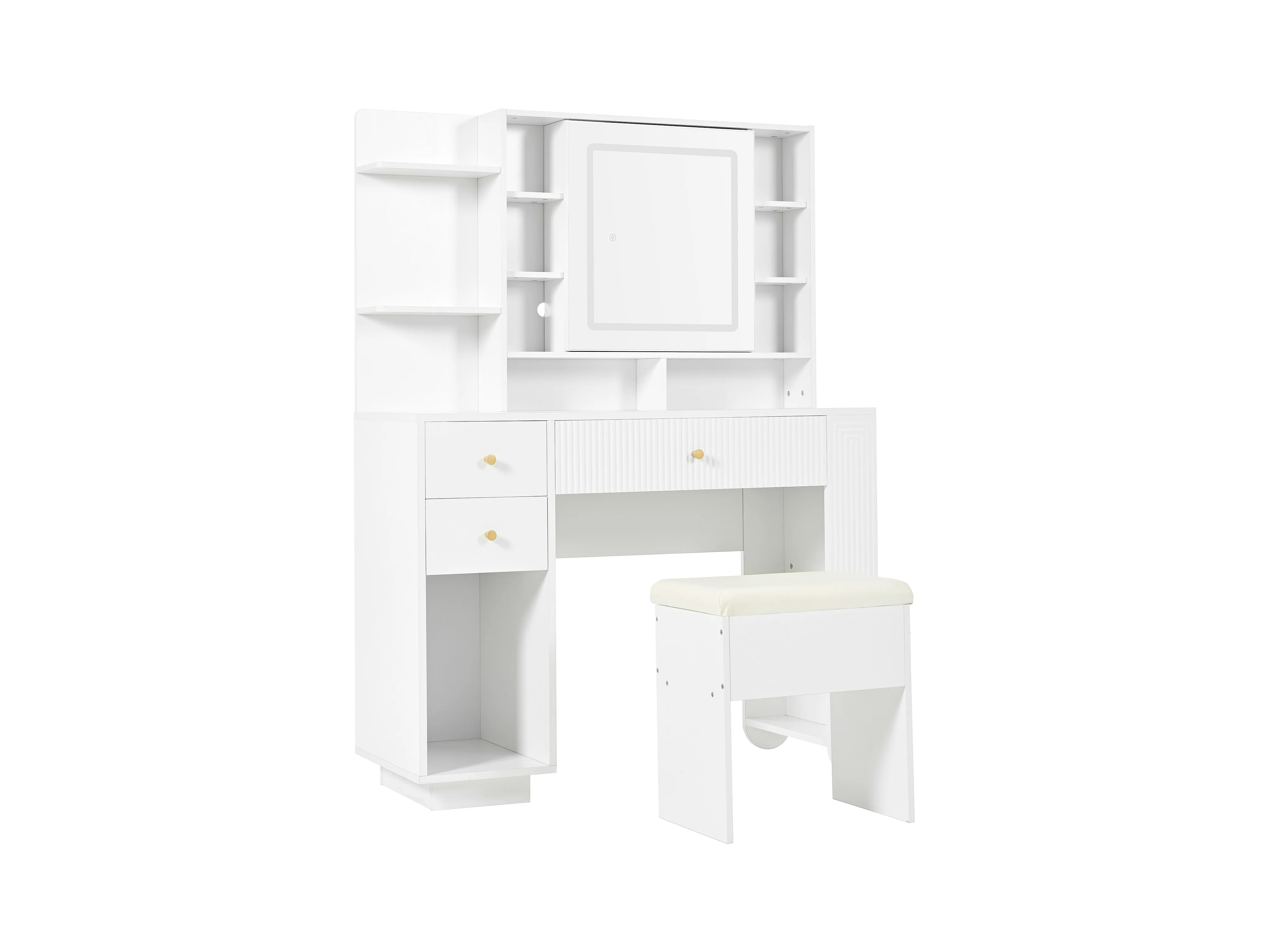 Verlichte kaptafel met spiegel en kruk, make-uptafel met verstelbare helderheid, lades en open plank, wit (100x40x138 cm)