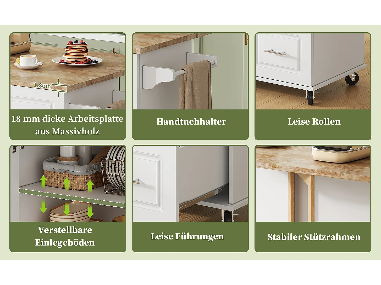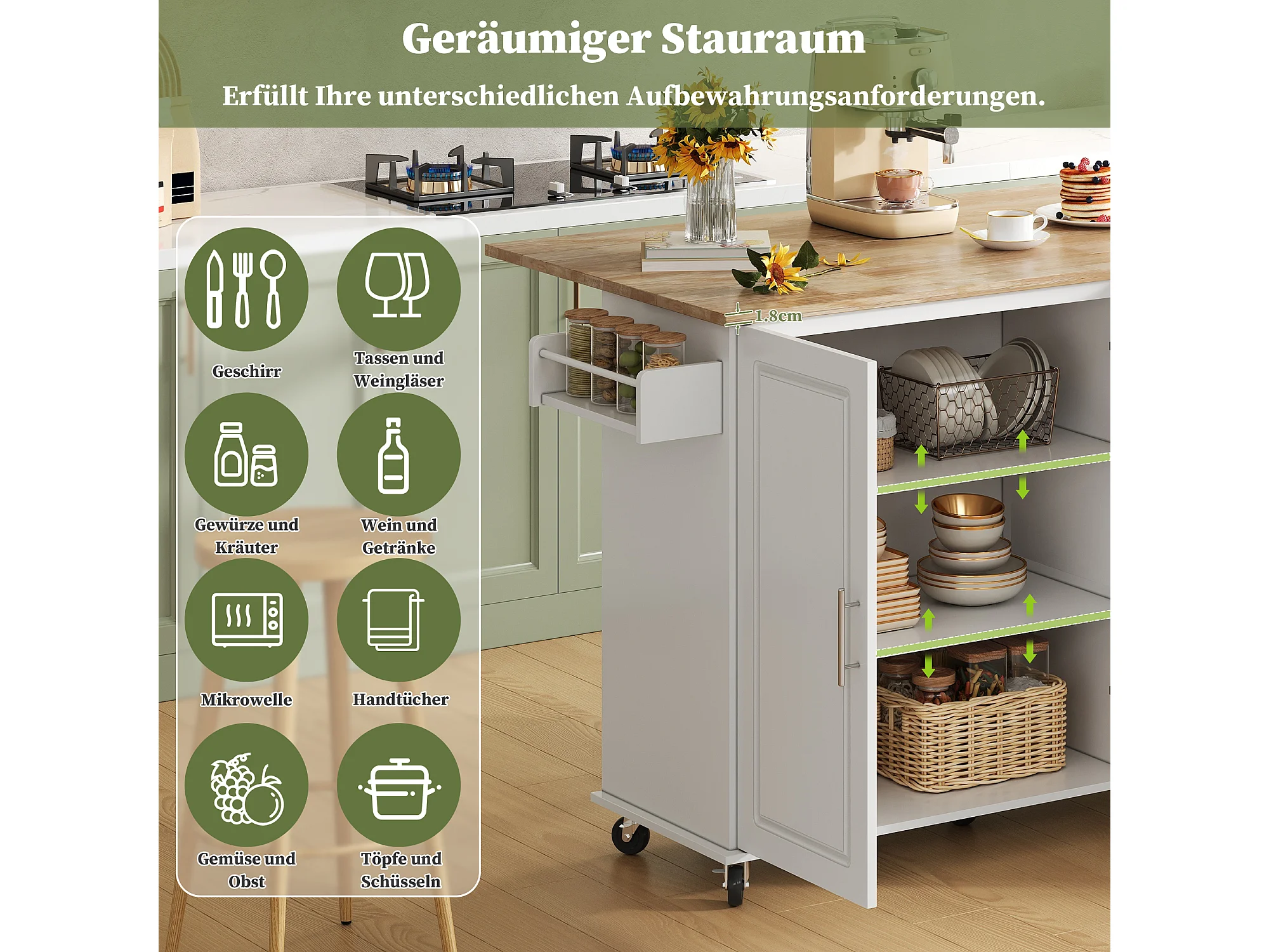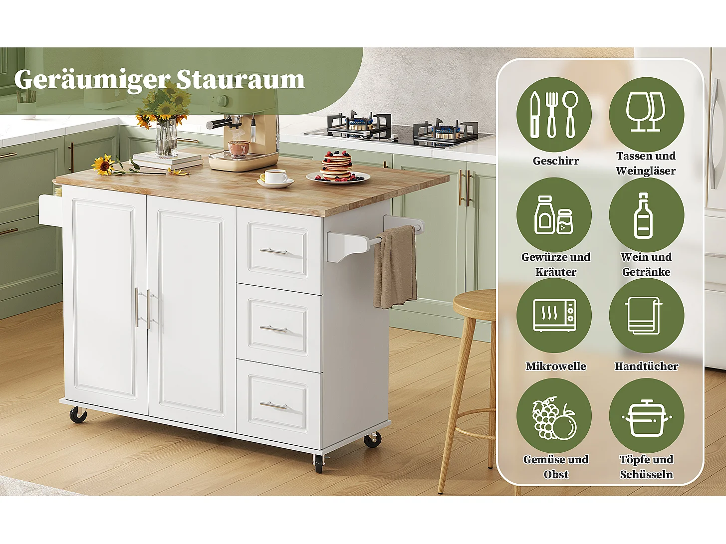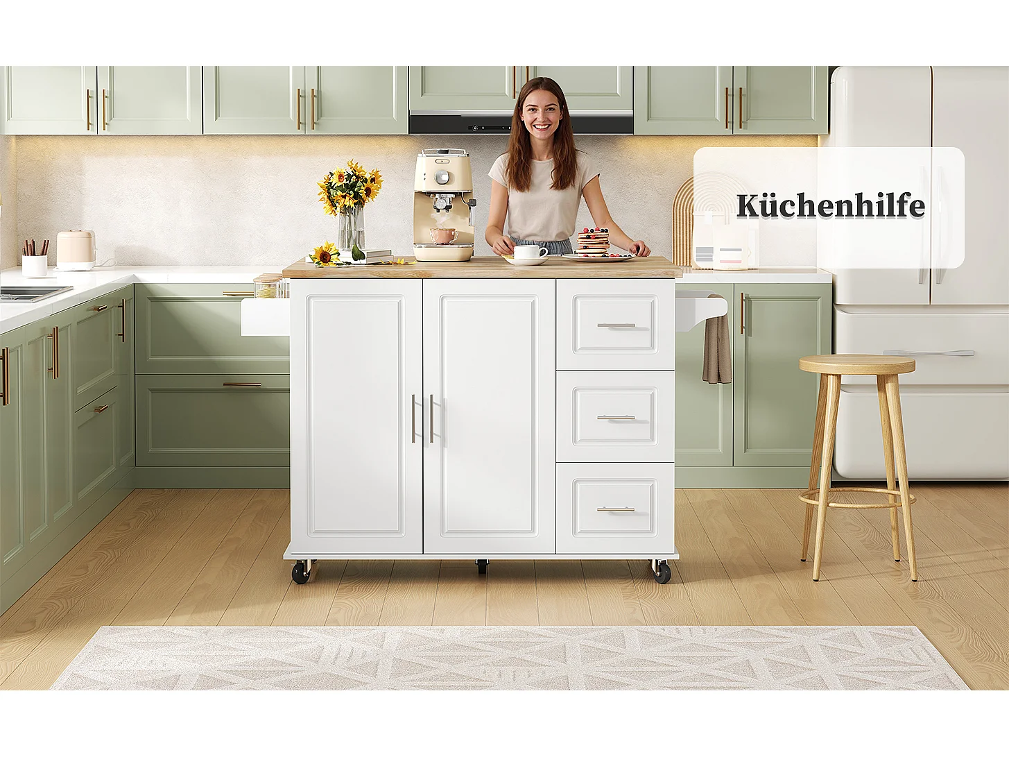 Verplaatsbaar keukeneiland - 137 x 43 (76) x 92 cm - inklapbaar blad - met 3 lades + 2 deuren - MDF - wit