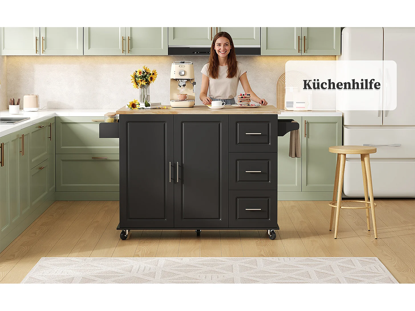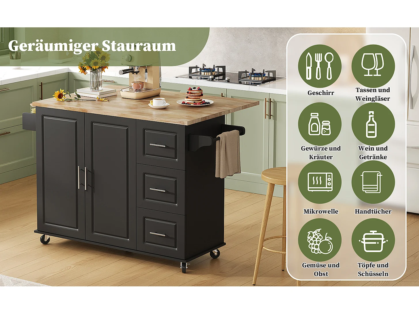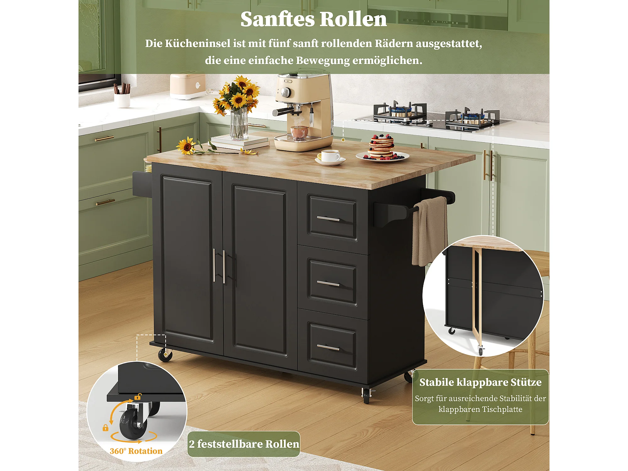 Verplaatsbaar keukeneiland - 137 x 43 (76) x 92 cm - inklapbaar blad - met 3 lades + 2 deuren - MDF - zwart